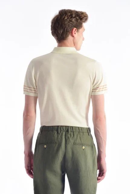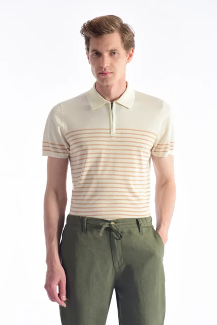 Zippered Collar and Stripe Detailed Polo Neck Knit T-Shirt