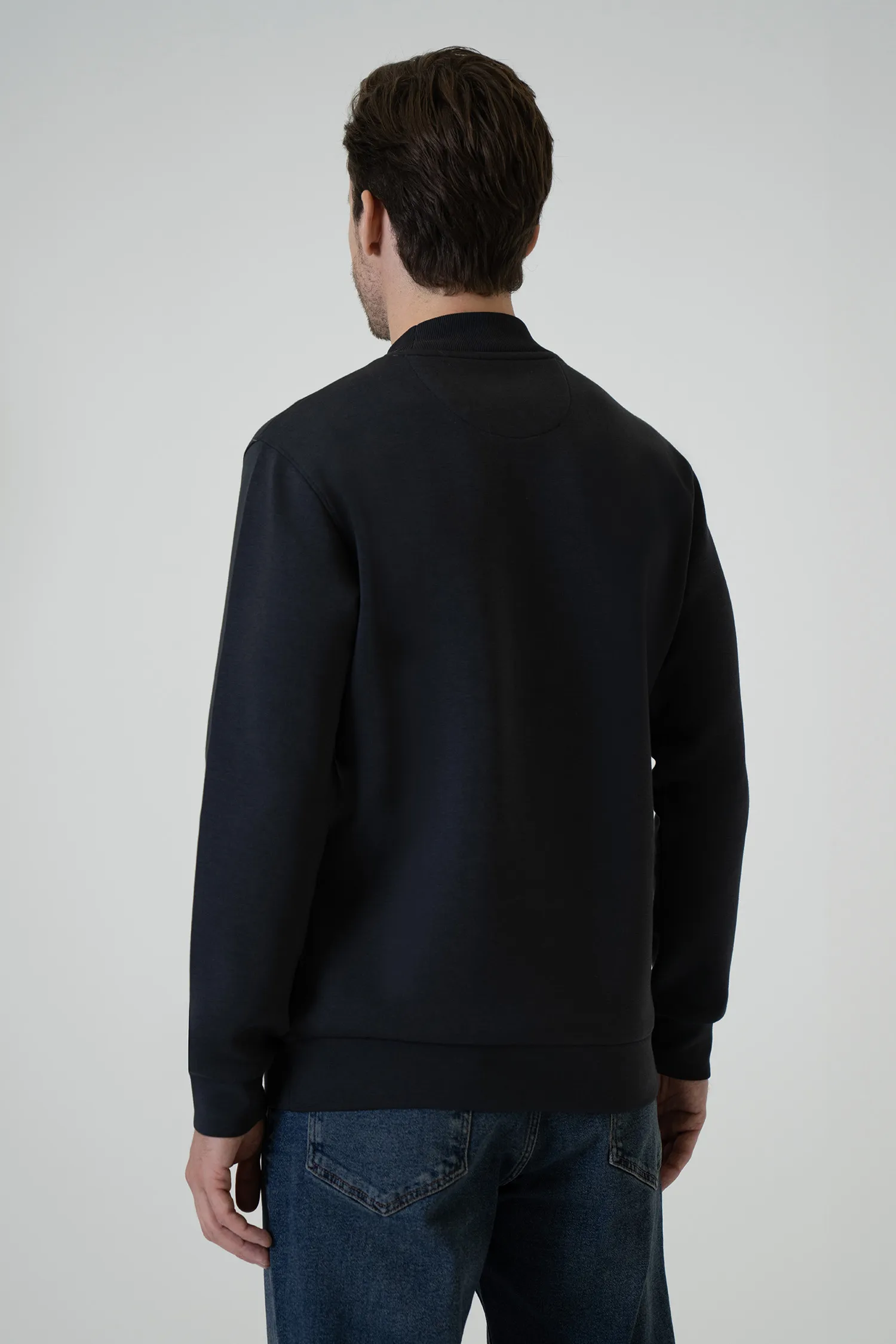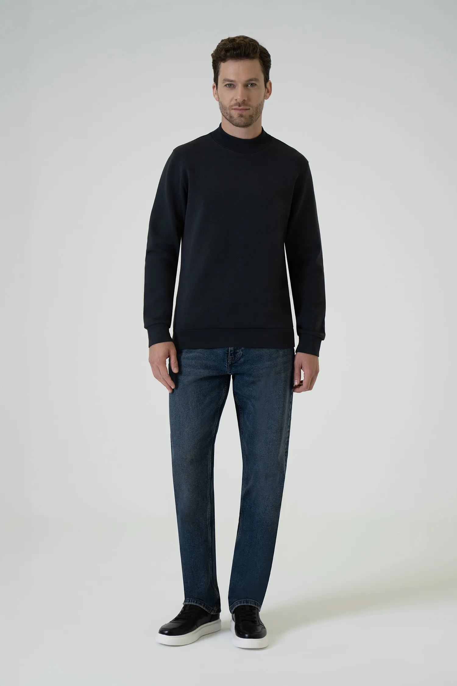 Blending the modern, urban tone of anthracite with a minimal design, this half-turtleneck sweatshirt adds comfortable elegance to everyday style with its flexible texture and clean silhouette. Its lightweight yet warming structure makes it a practical and refined option for cooler days.