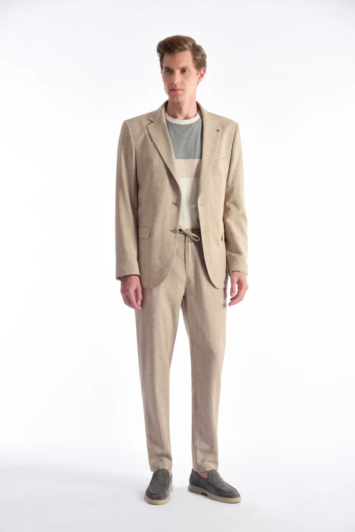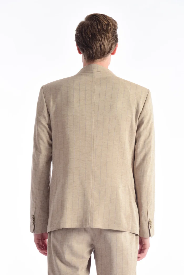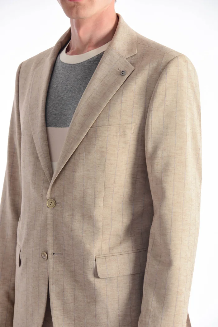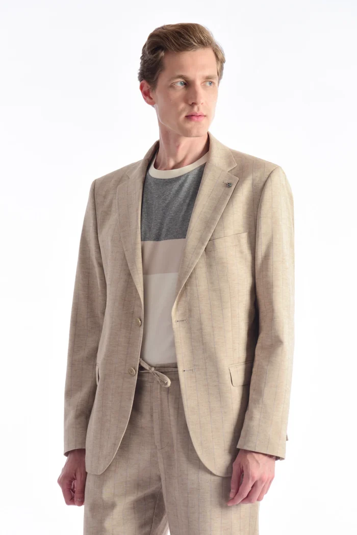 A modern reflection of timeless elegance, this beige suit jacket offers a simple yet impressive style with its thin striped texture. It provides comfort even on hot summer days thanks to its light and breathable fabric. It can be easily preferred in transitions from casual to office or summer invitations. Different looks can be achieved by combining it with a shirt or a t-shirt.