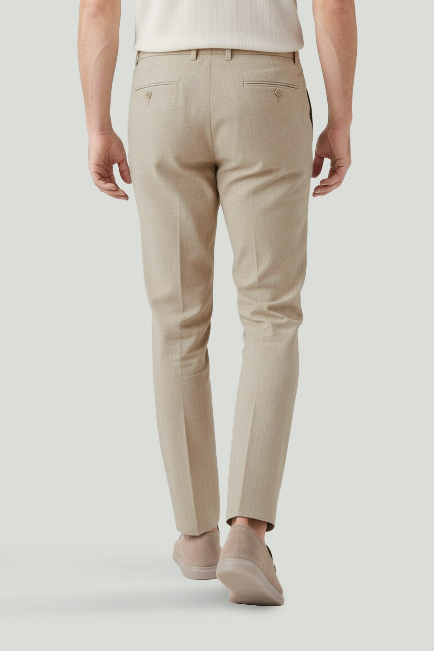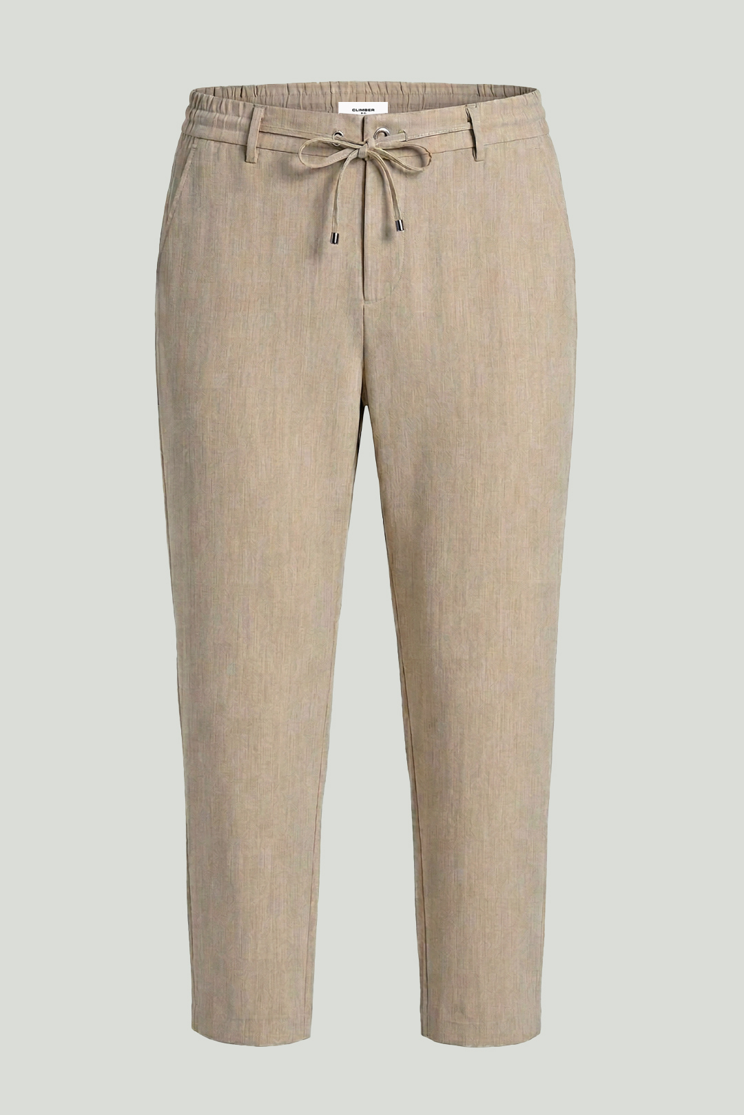 Designed with a modern and balanced fit, these beige trousers combine comfort and elegance for all-day wear. The slightly tapered form from waist to hem provides a body-contouring yet non-restrictive structure. The adjustable drawstring waist offers both practicality and enhanced comfort.
