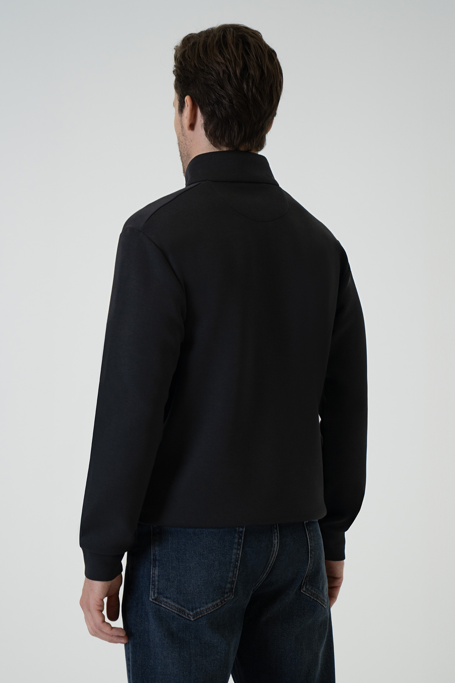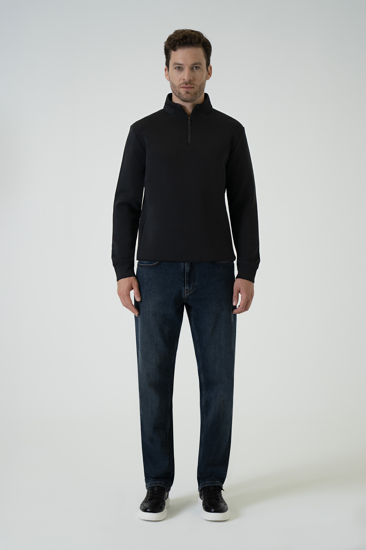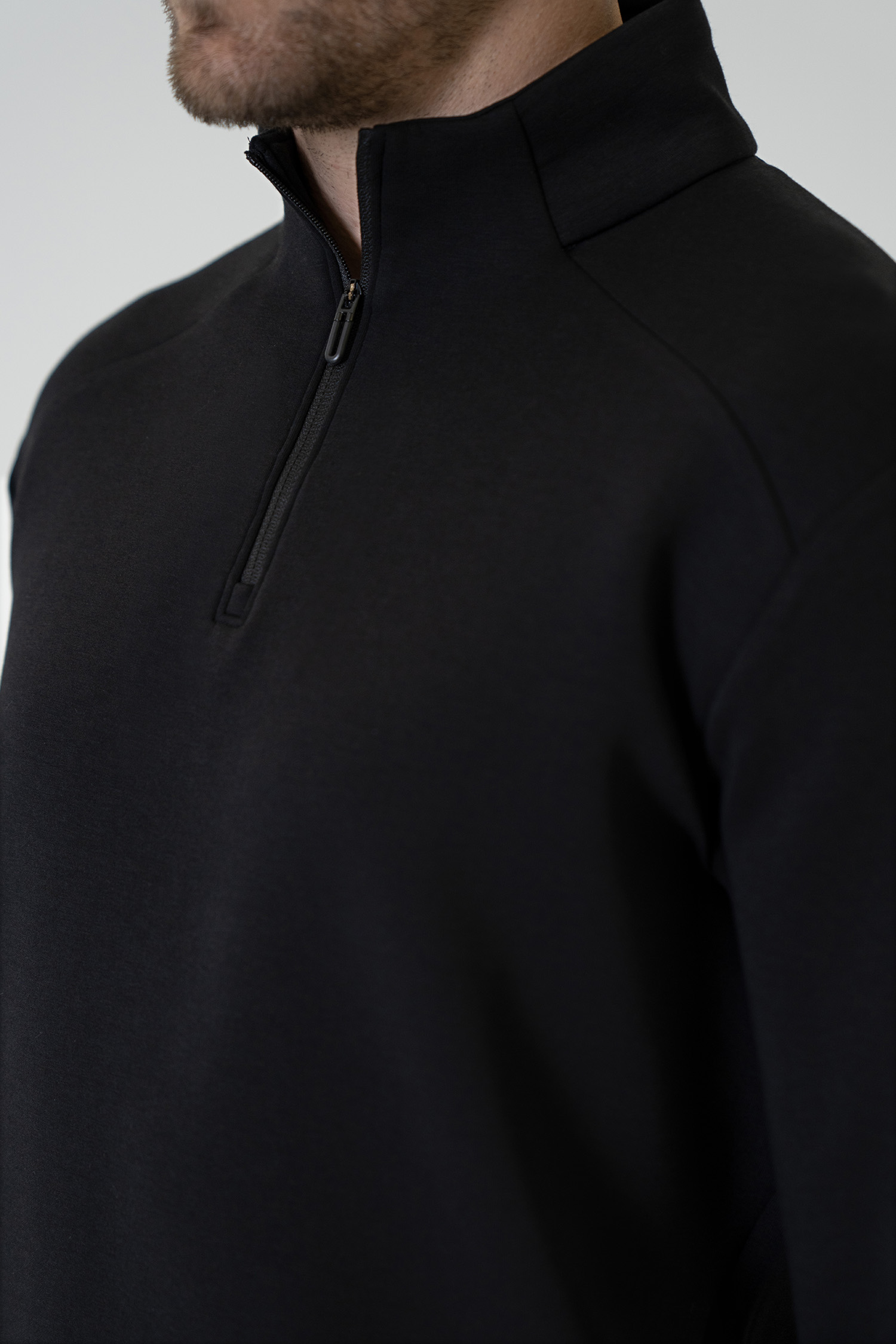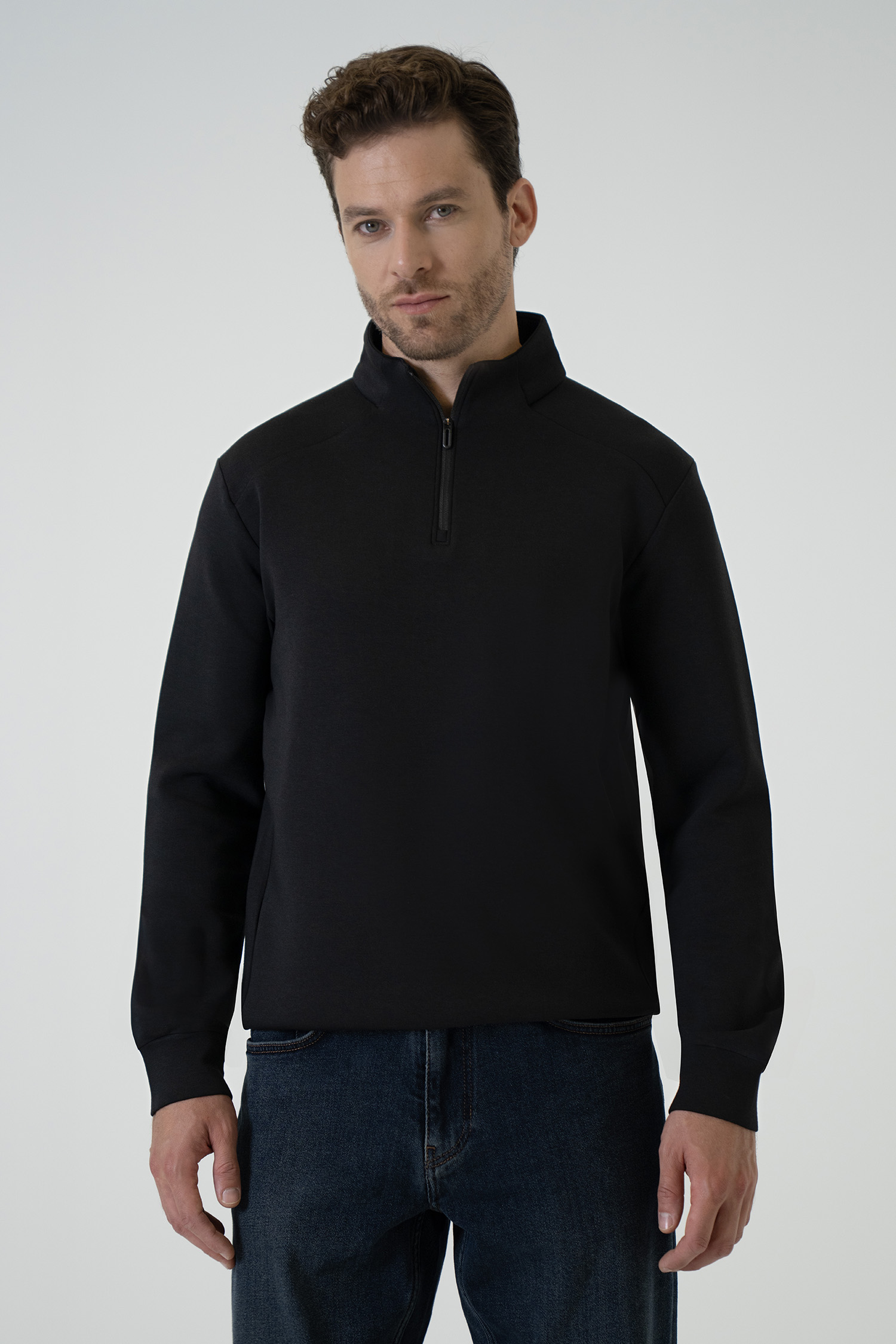 This black sweatshirt with a minimalist design stands out with its half-zip mock neck detail, offering a modern look. Its relaxed fit and flexible structure provide comfort throughout the day.