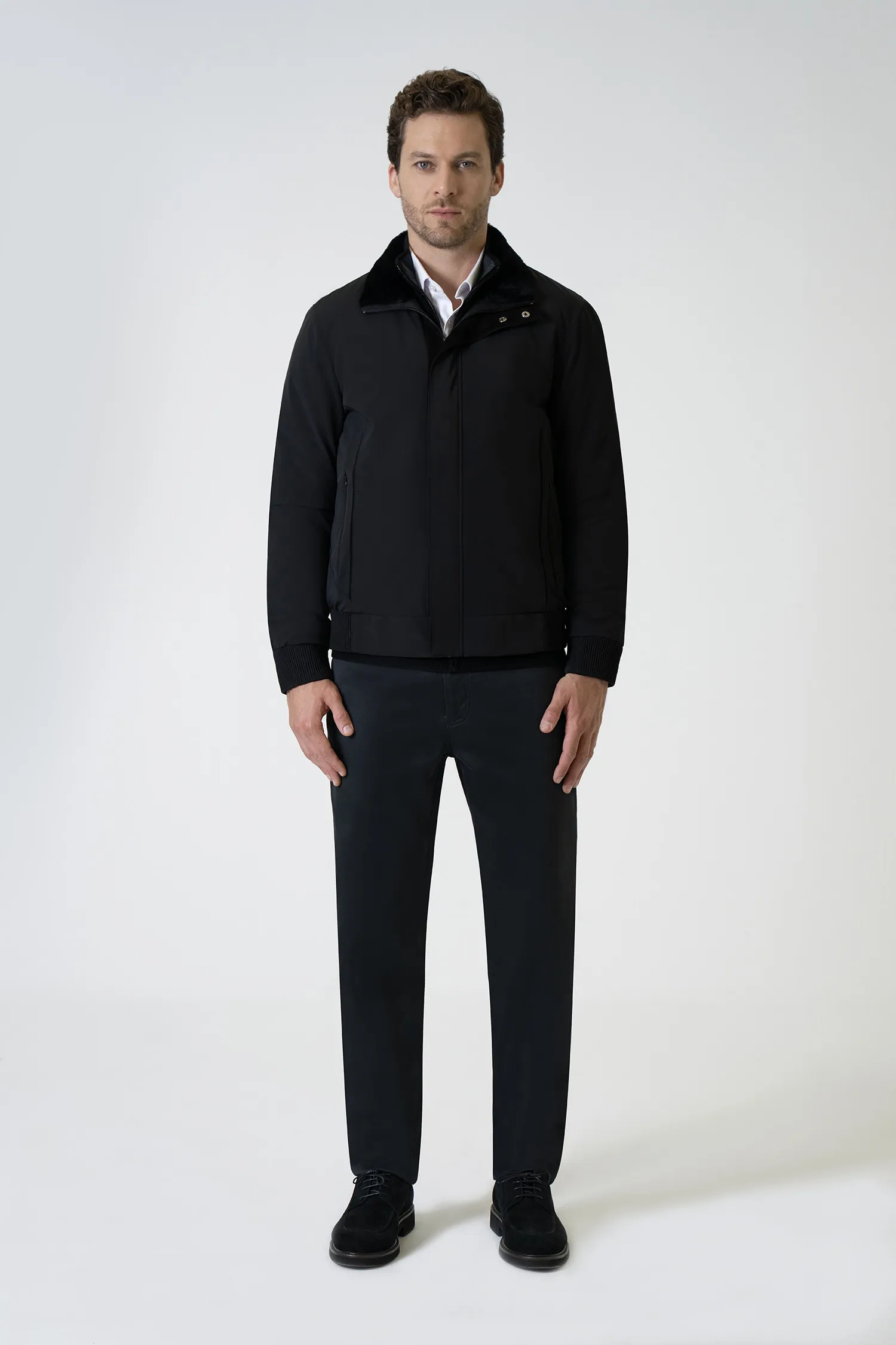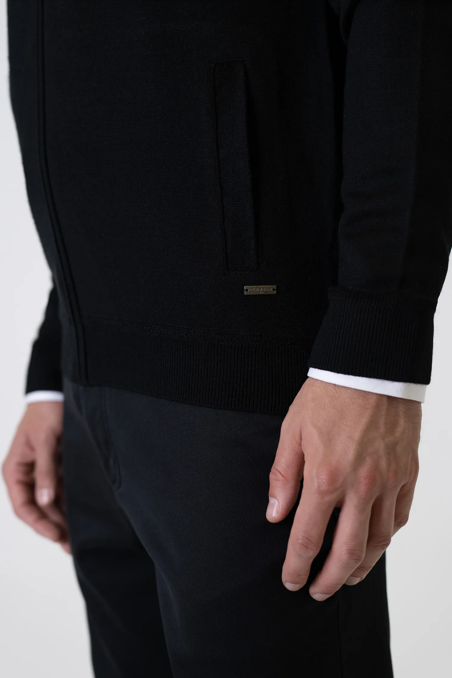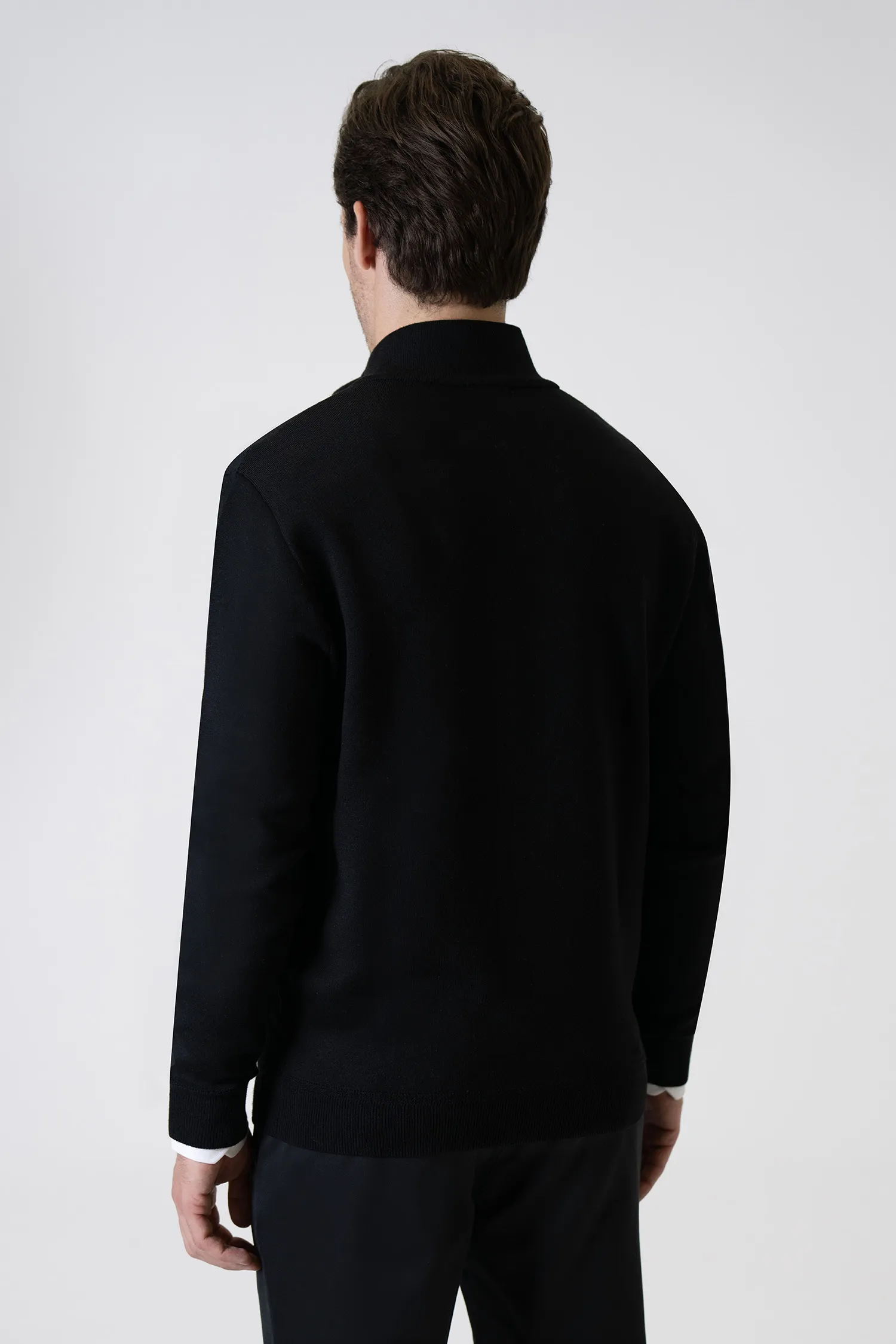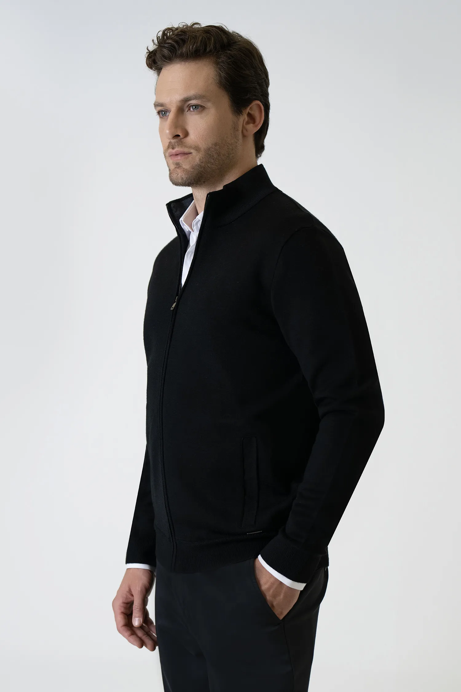 Offering a modern look with its minimal and timeless black tone, this knit cardigan provides all-day comfort with its lightweight texture and soft feel. With its full-length zipper and clean lines, it serves as a stylish complement to both office and everyday outfits.