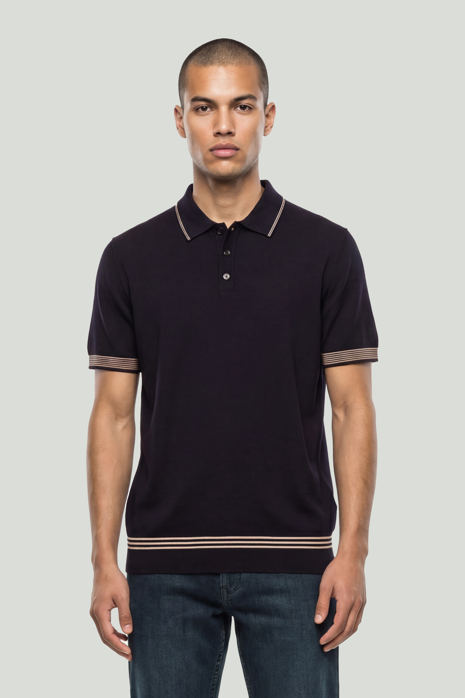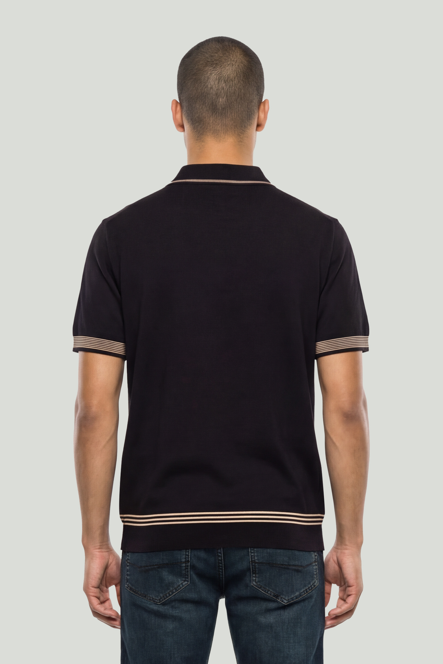 Crafted from a soft and fluid rayon-blend fabric, this polo collar knit T-shirt brings a clean yet strong character to modern menswear. The design is enhanced with contrast stripe details, while its balanced fit offers both comfort and a refined appearance. It combines everyday elegance with an effortless sense of style.