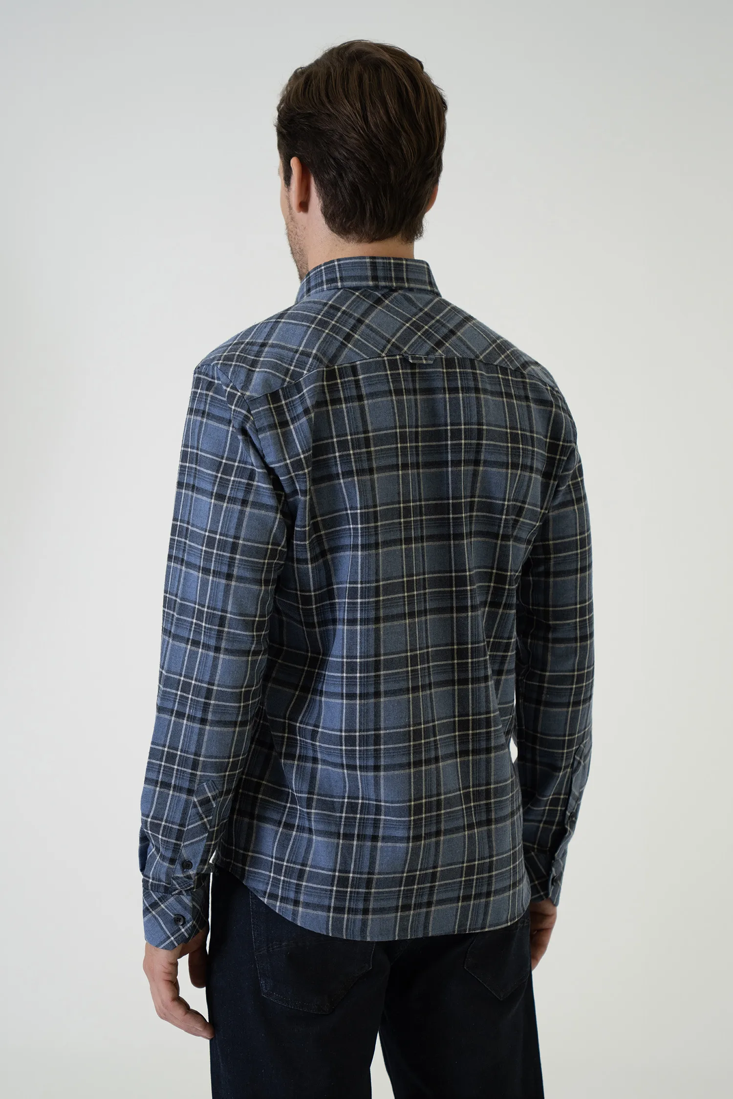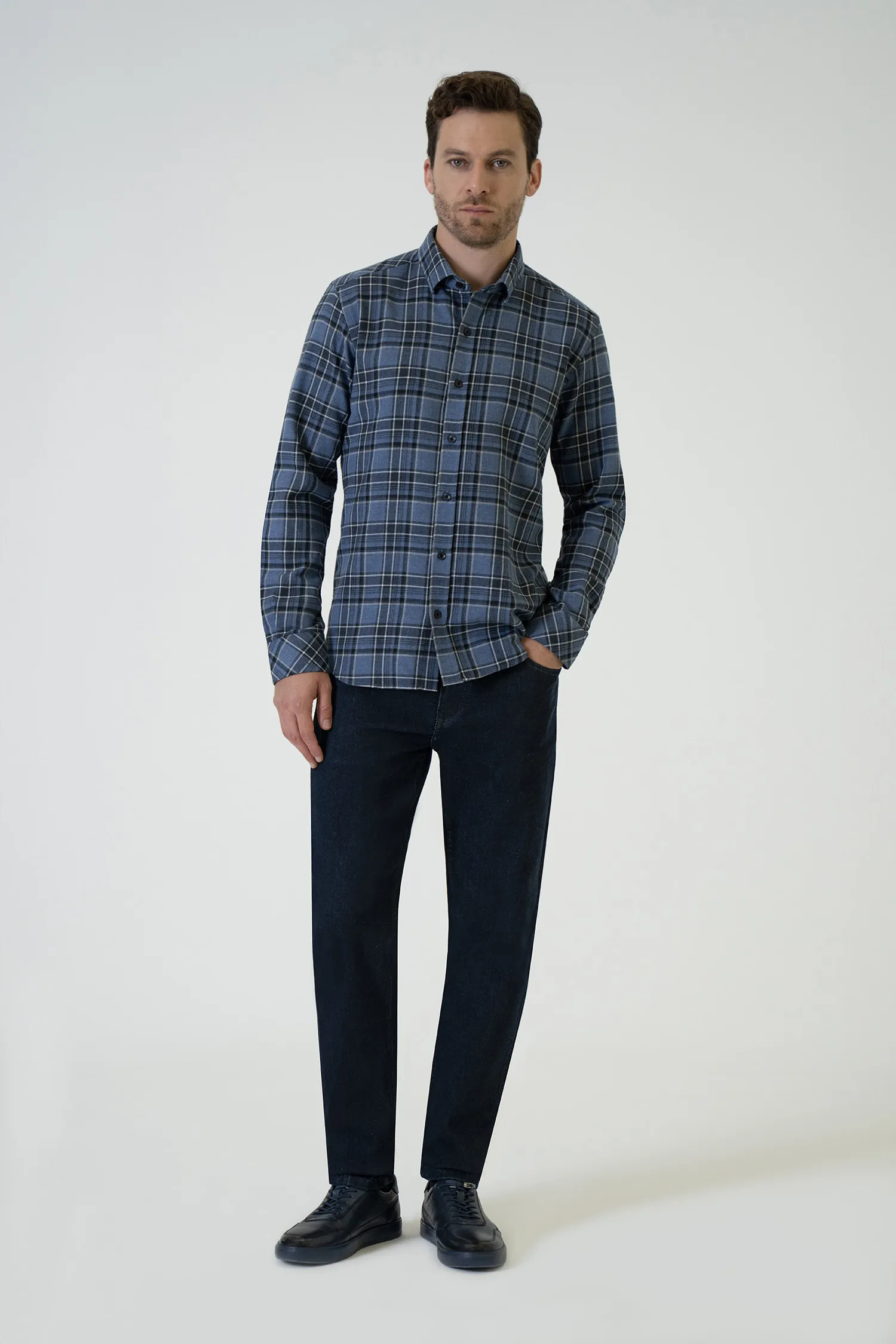 Blending calm blue tones with navy and light ecru lines, this original fit shirt brings a dynamic yet refined touch to everyday style with its modern plaid texture. Its soft surface and clean lines make it a timeless wardrobe staple.