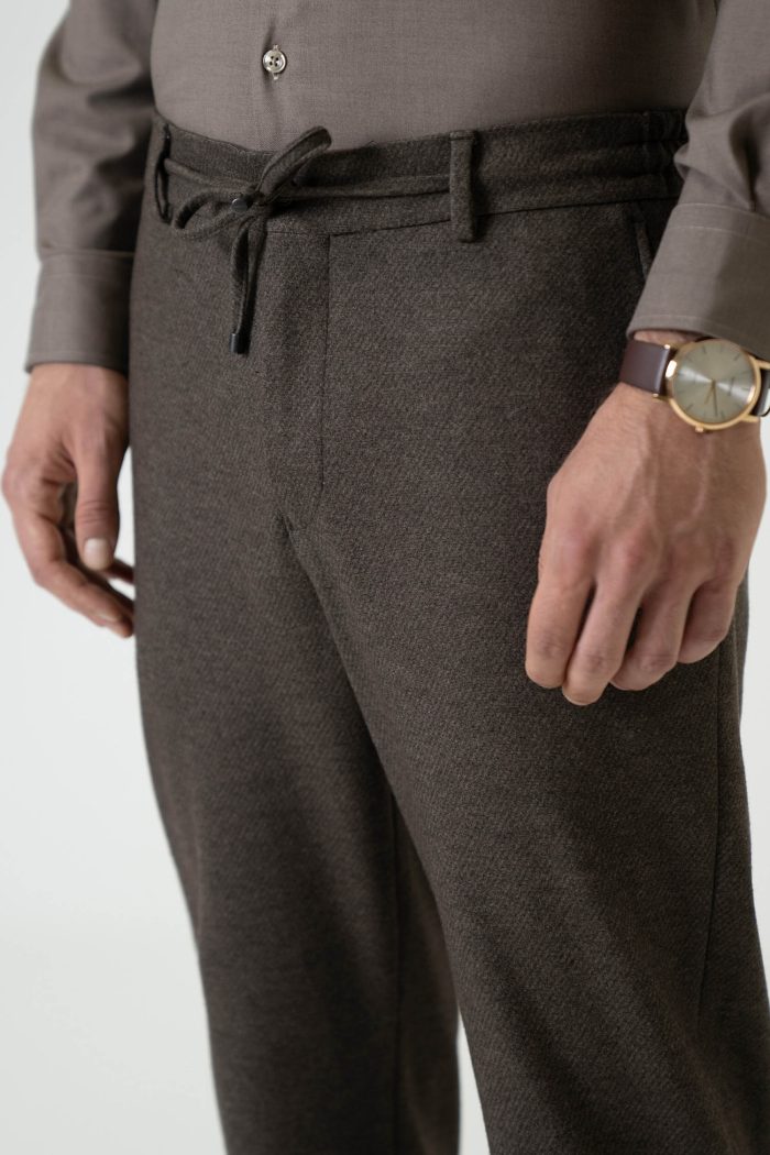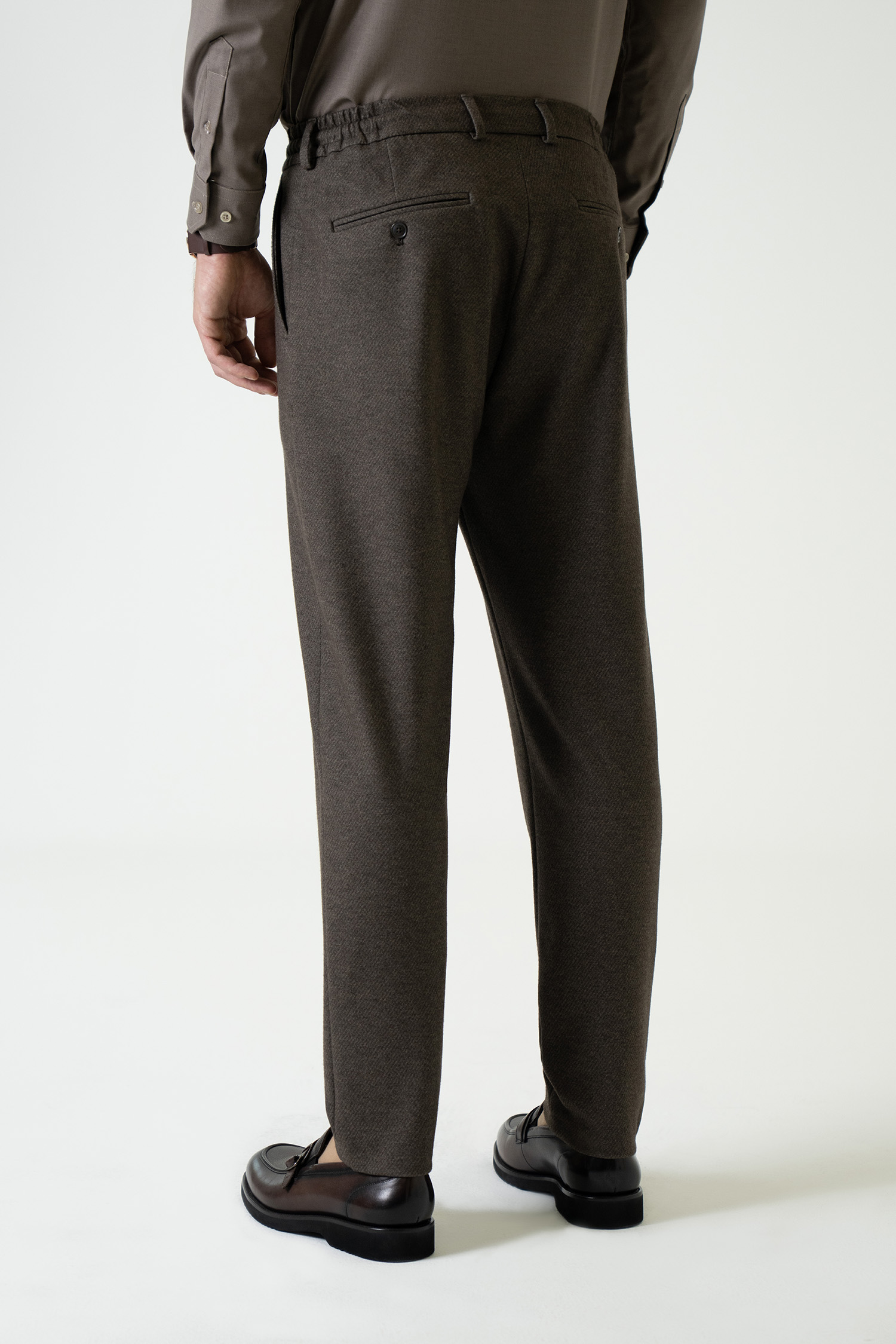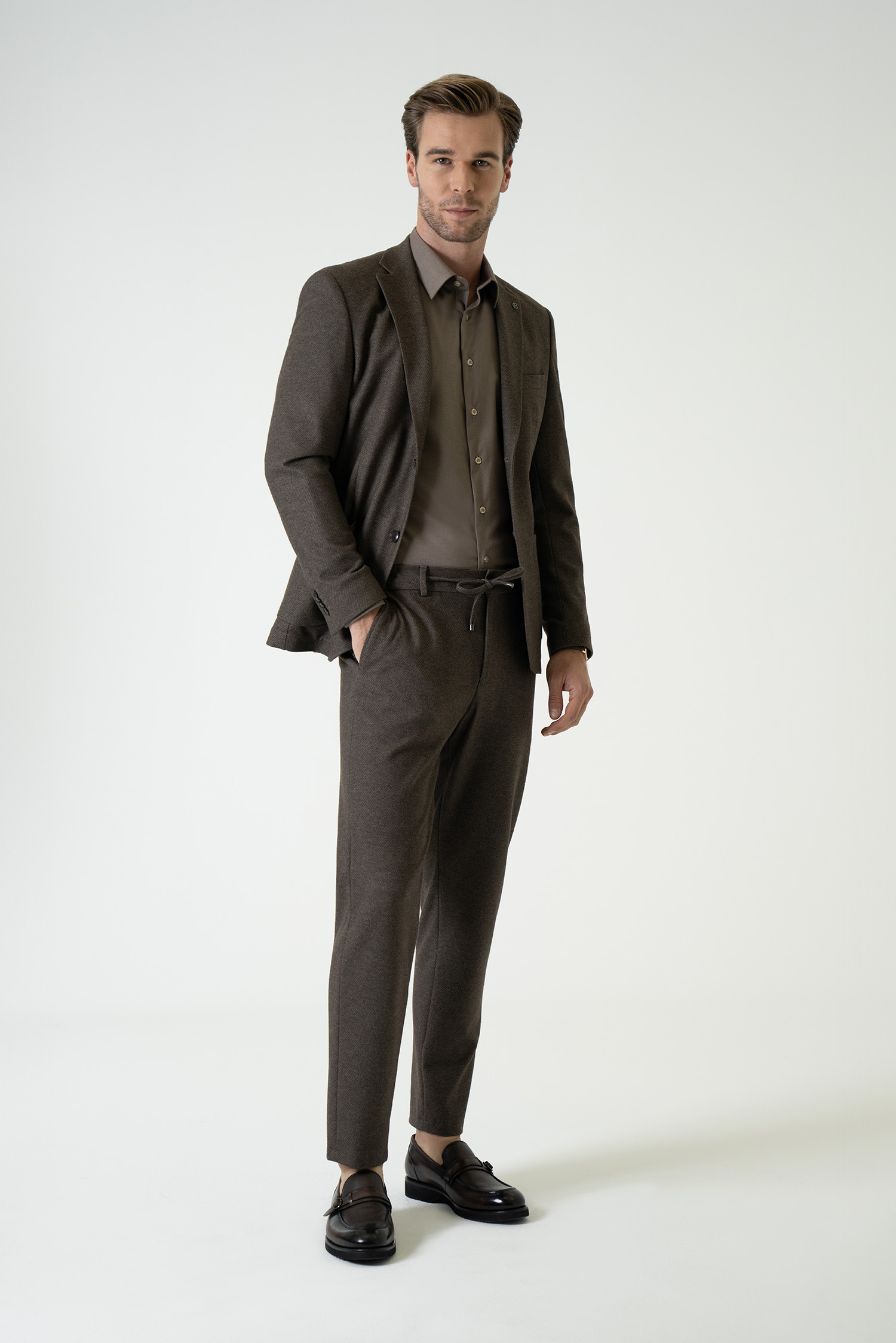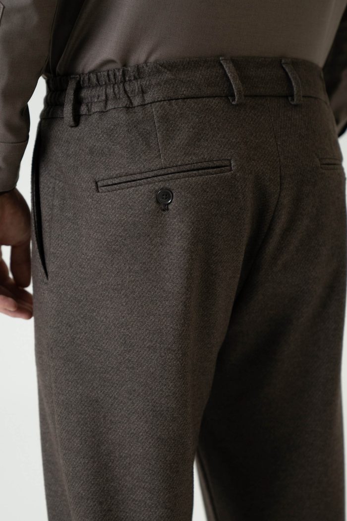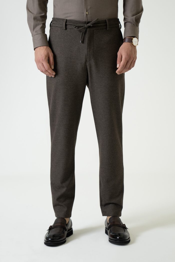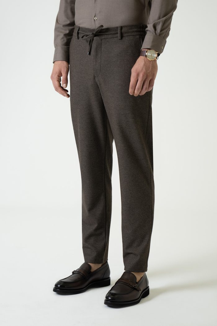 Standing out with their subtle textured pattern, these brown trousers provide all-day comfort with a modern cut and relaxed fit. The drawstring waist detail adds a sporty elegance while ensuring practical ease of use.