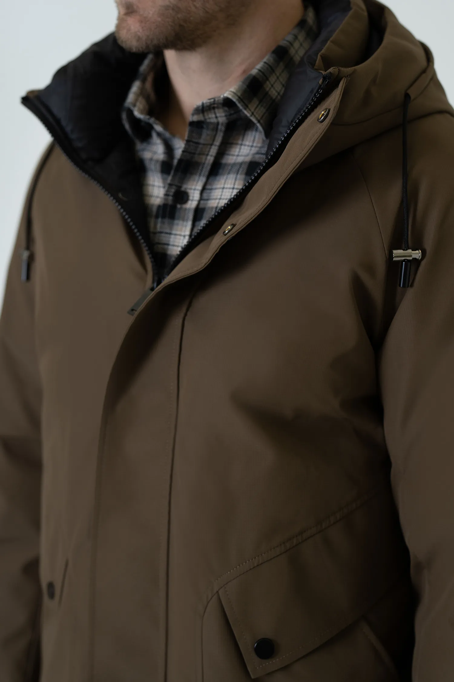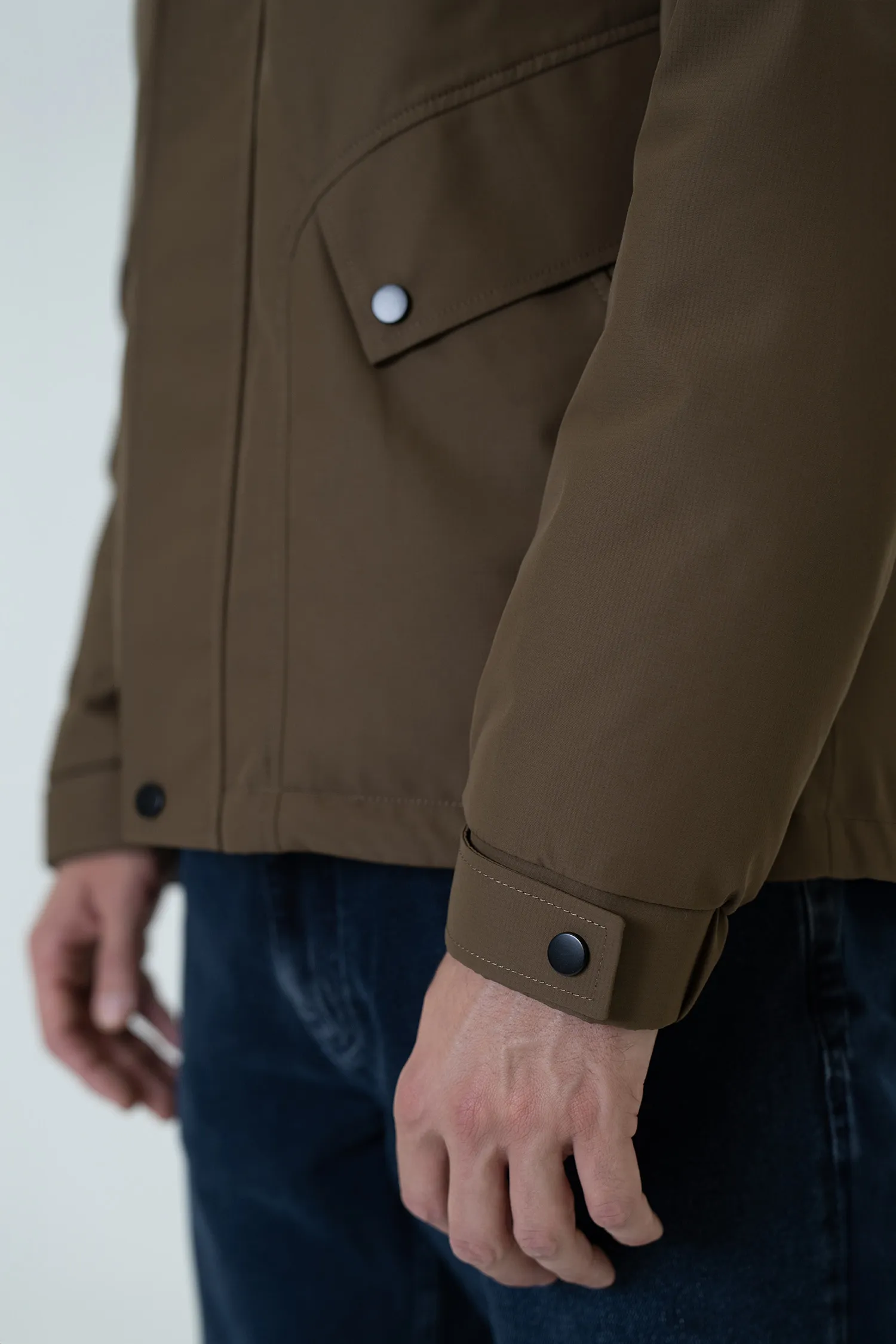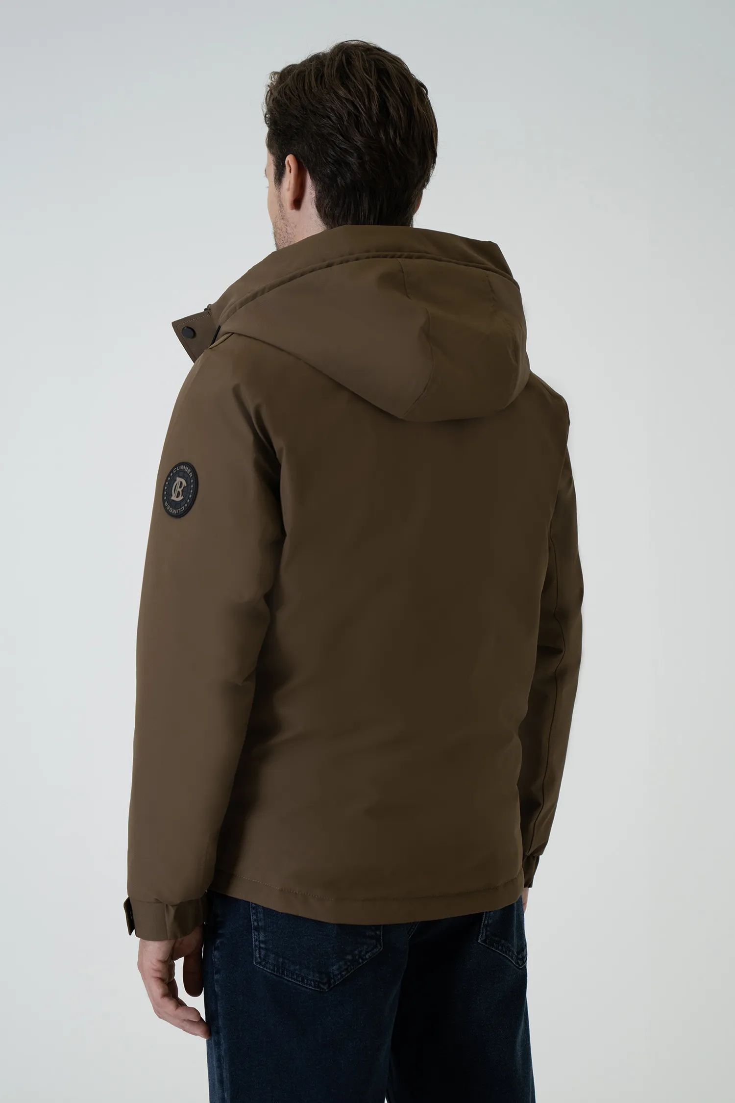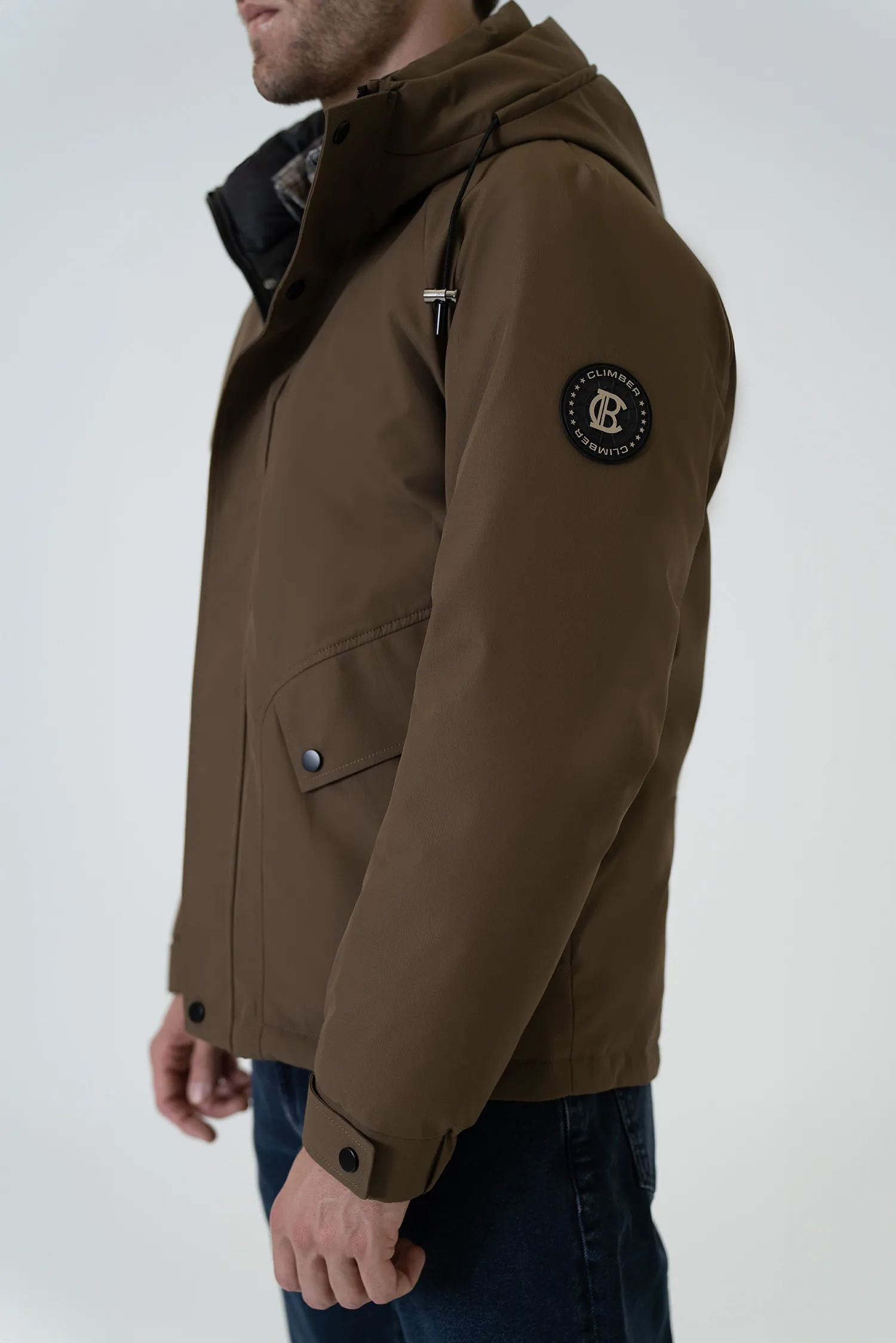 Designed to match the dynamic pace of urban life, this brown technical jacket combines a modern design with a powerful padded structure. Its matte textured surface, adjustable hood, and functional pocket details create an outer layer that is both protective and stylish.