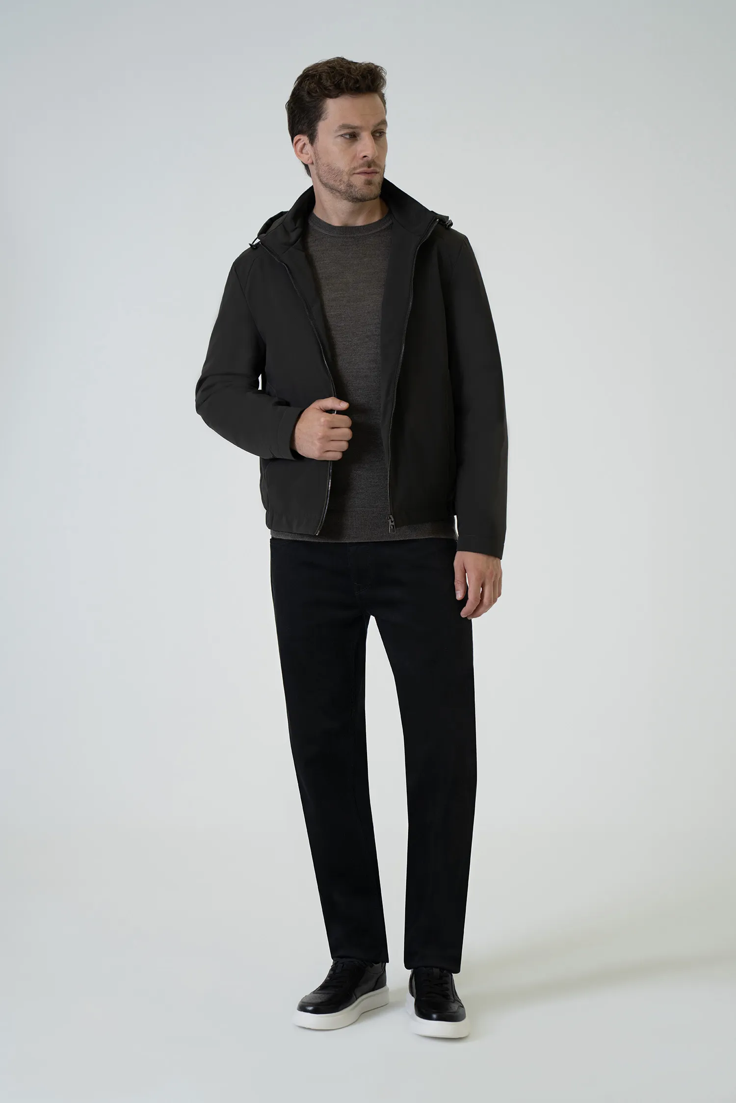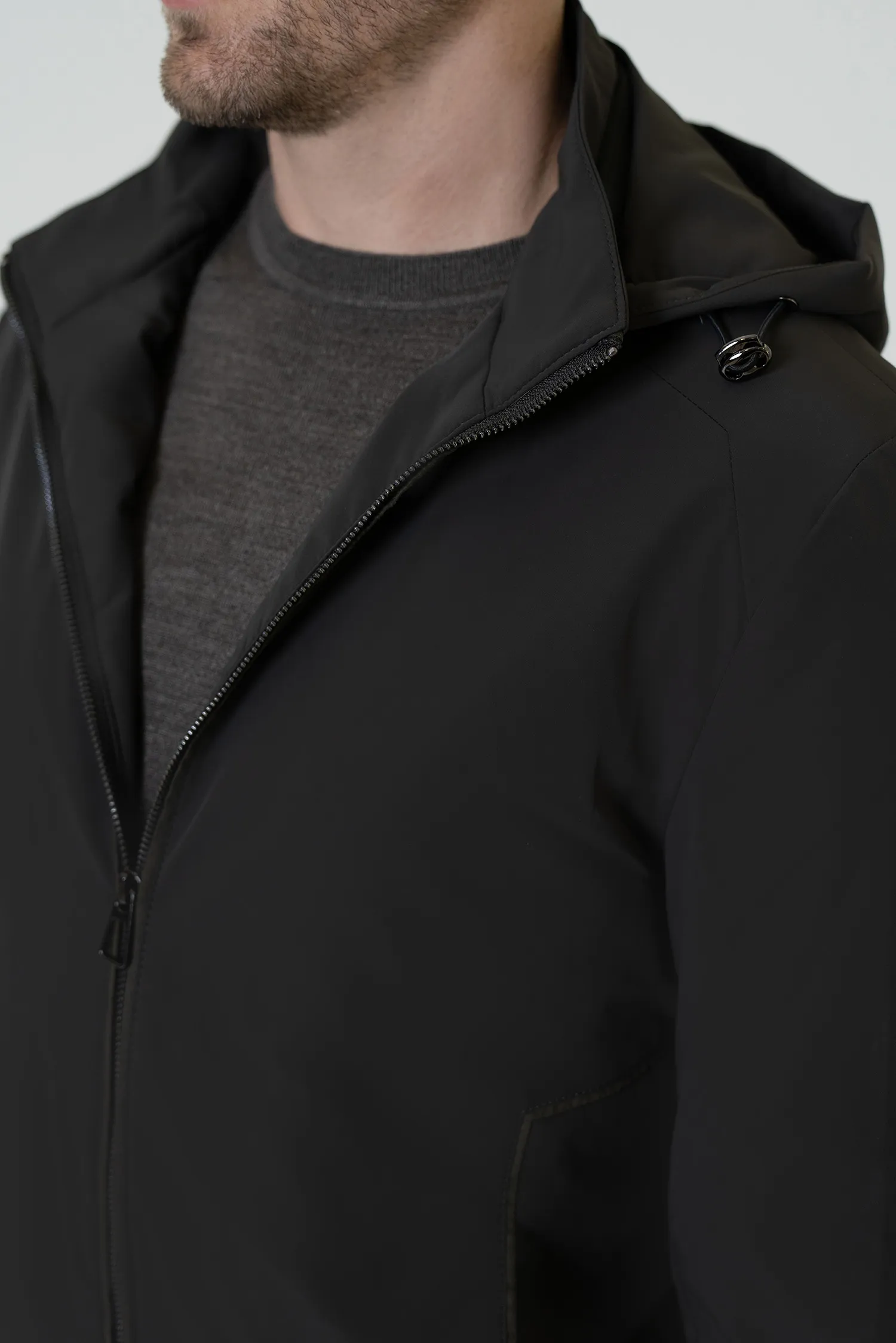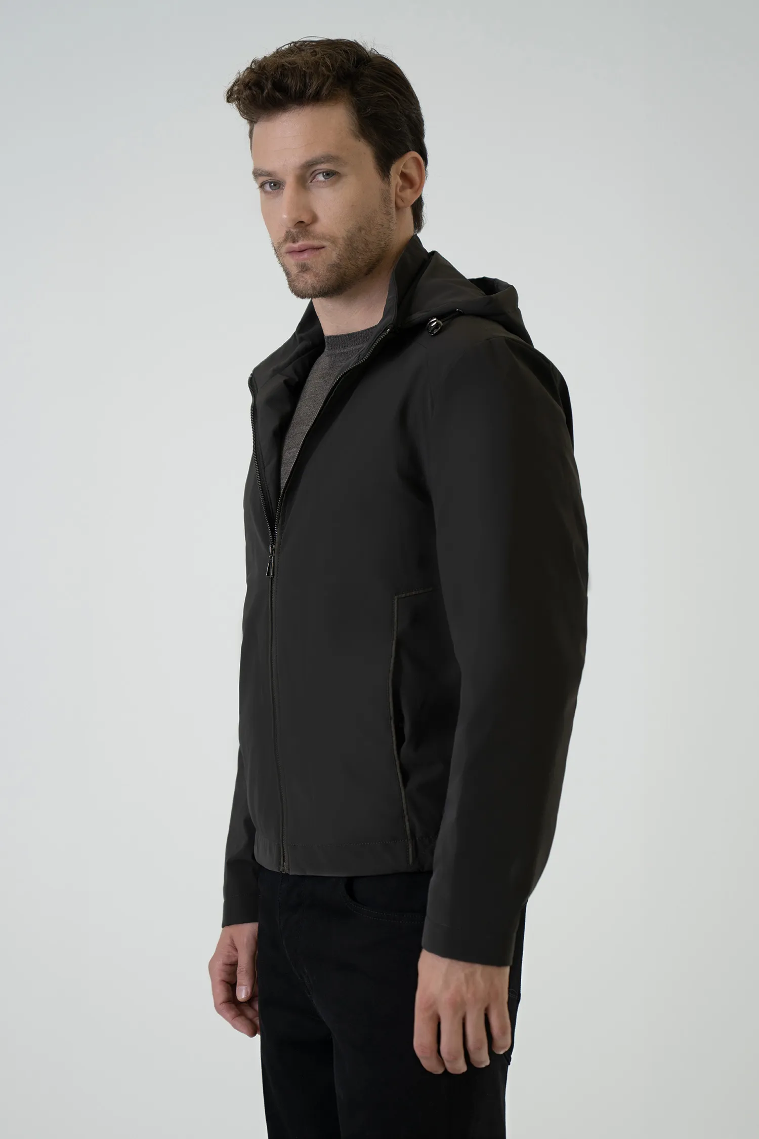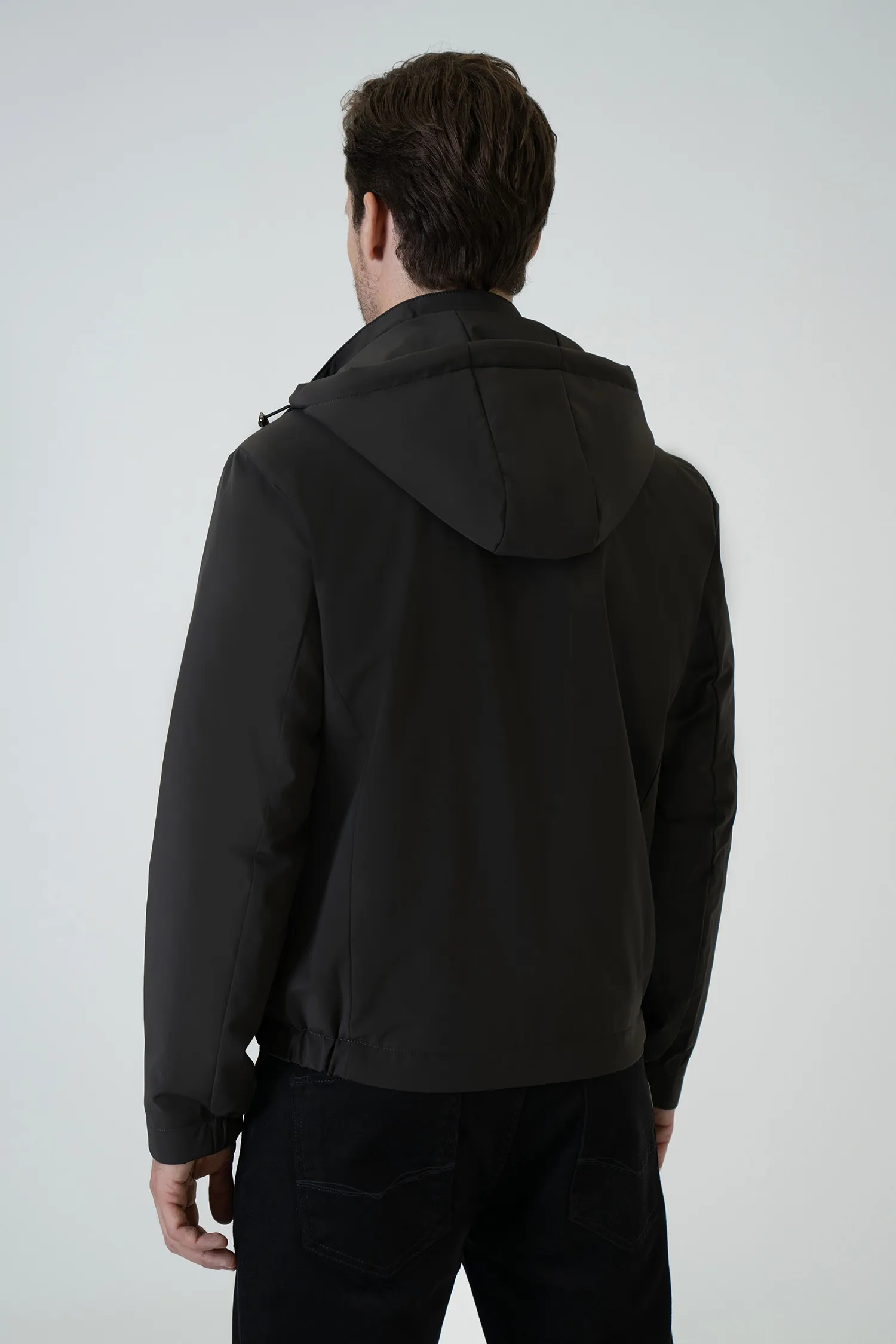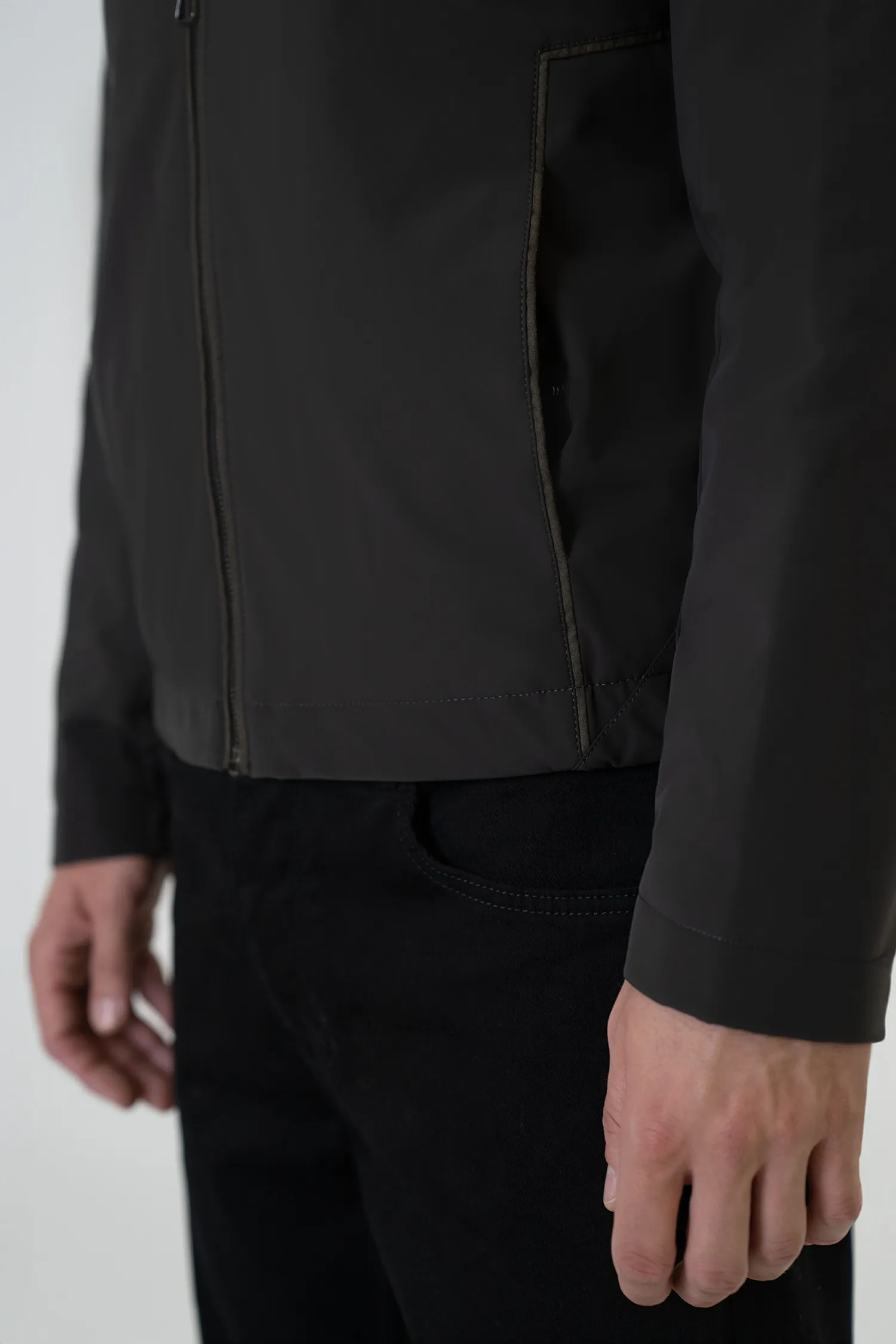This brown jacket blends sporty lines with a sophisticated look, offering a strong outer layer thanks to its technical fabric.
