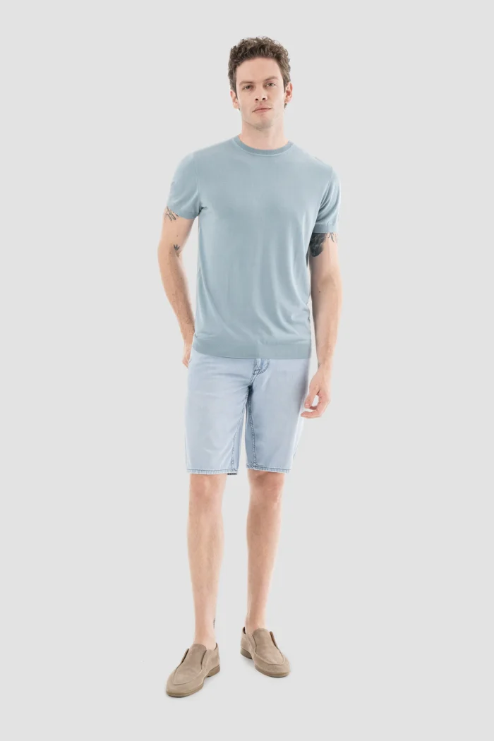 A perfect choice for men who want to be both comfortable and stylish on hot summer days: Light blue denim shorts! With its modern design and high-quality fabric, these shorts will highlight your style and comfort in any environment.