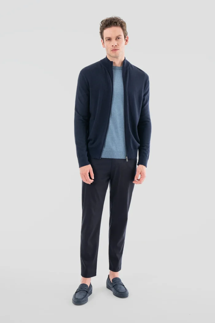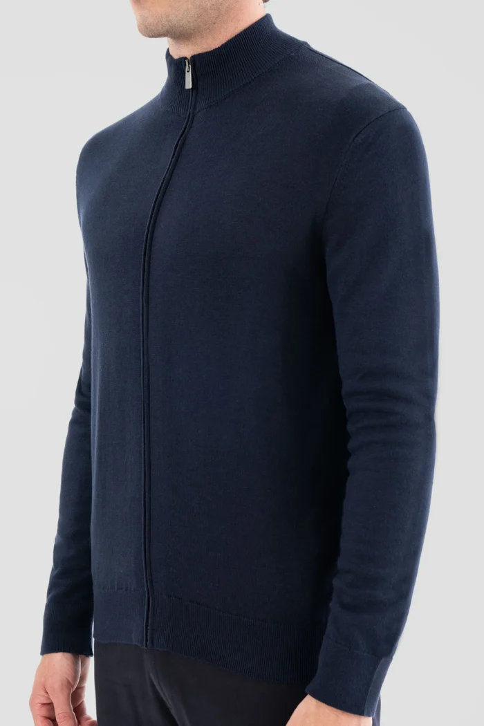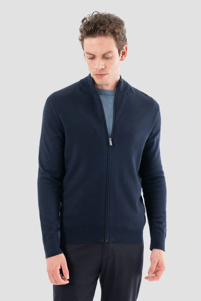This dark navy zippered cardigan is a candidate to become an indispensable part of your wardrobe, offering both elegance and comfort. While providing comfort all day long thanks to its soft and high-quality fabric, it allows you to attract attention in every environment with its modern and elegant design. Its zippered structure offers practical use and makes it easy to wear layers indoors and outdoors. You can easily choose this stylish cardigan both in business life and in your daily life.