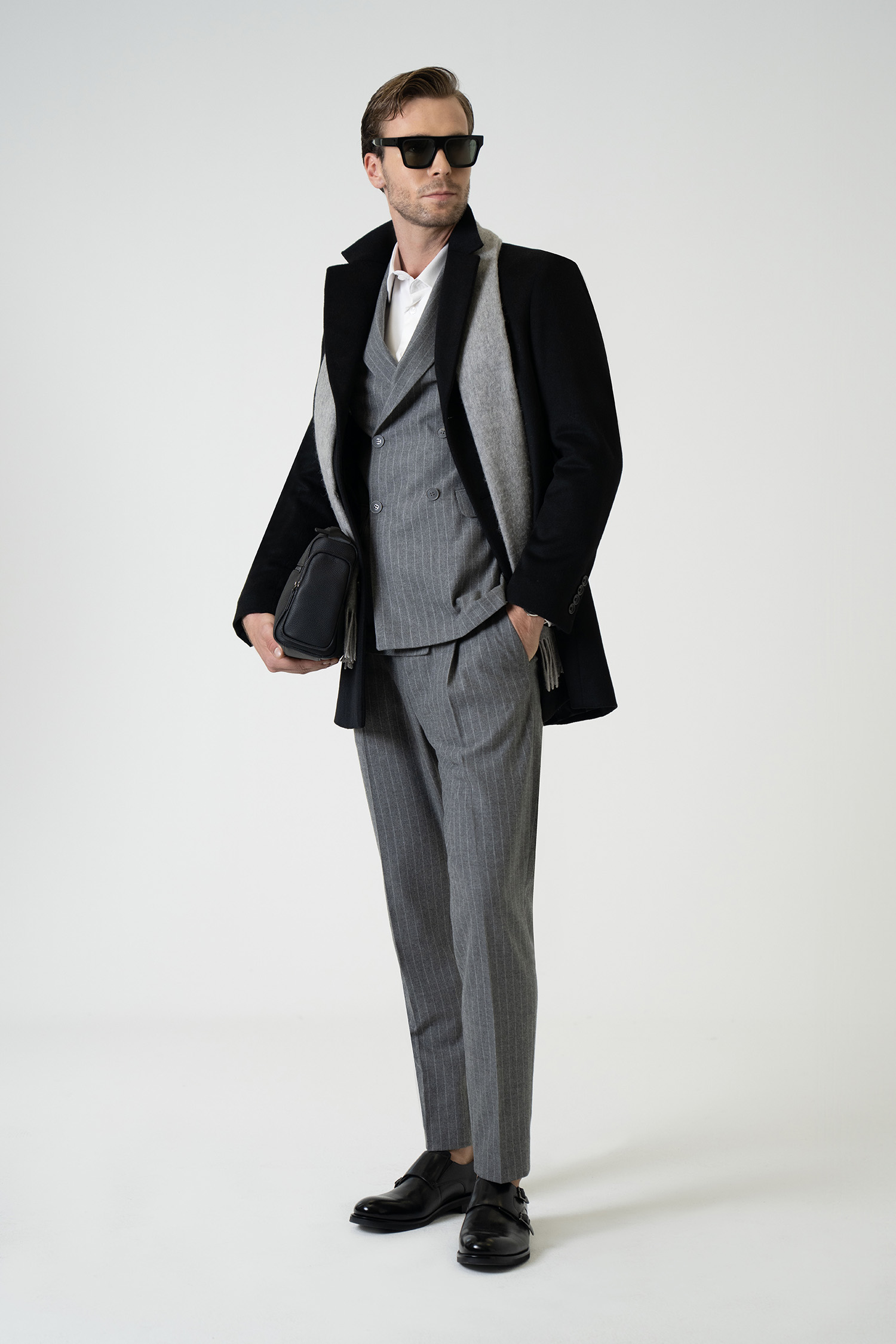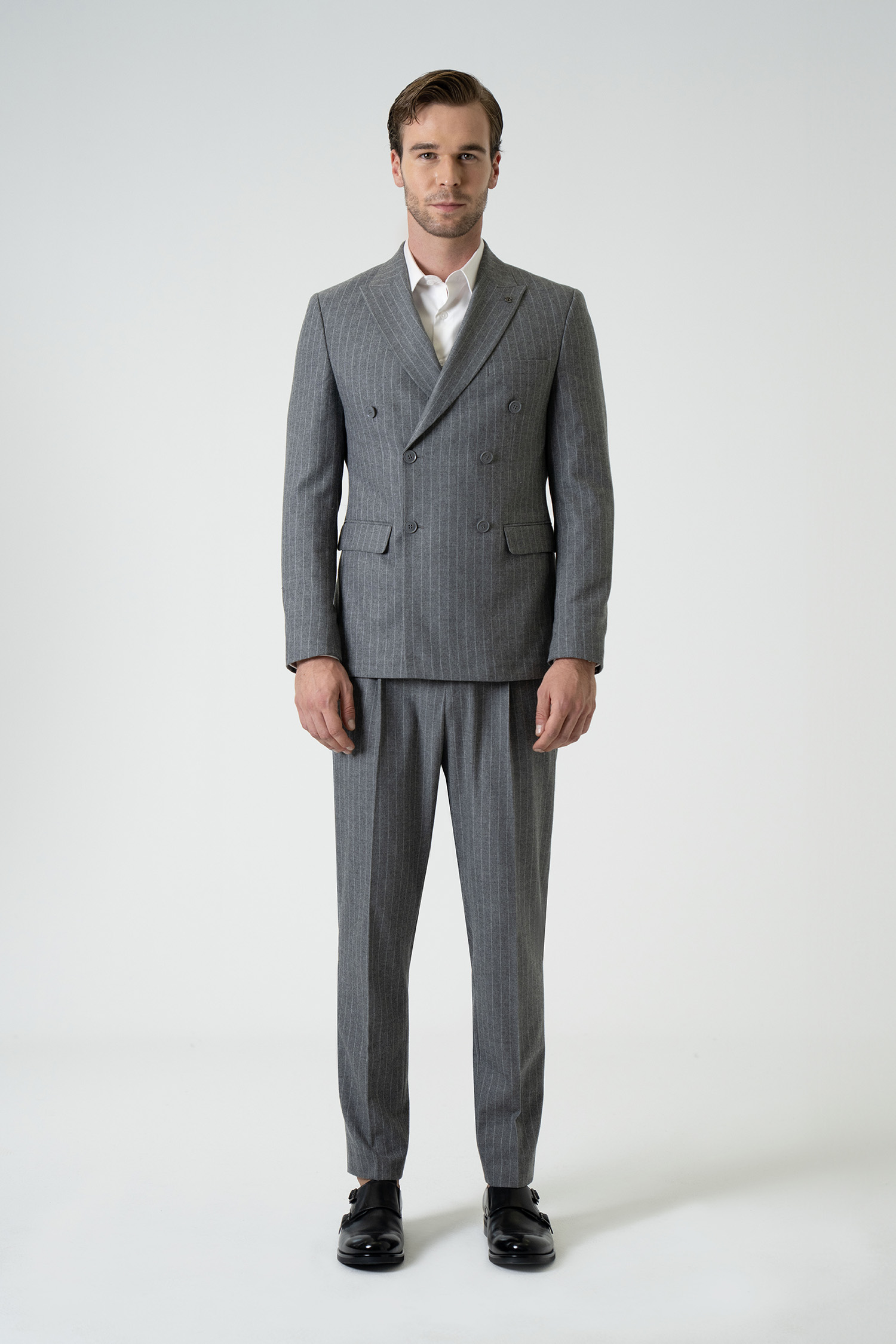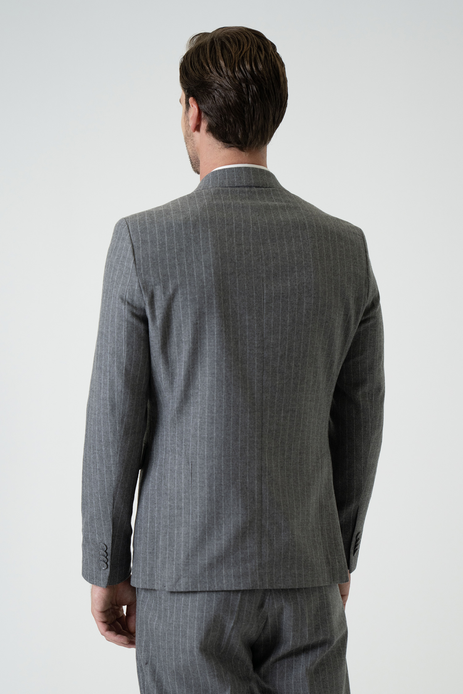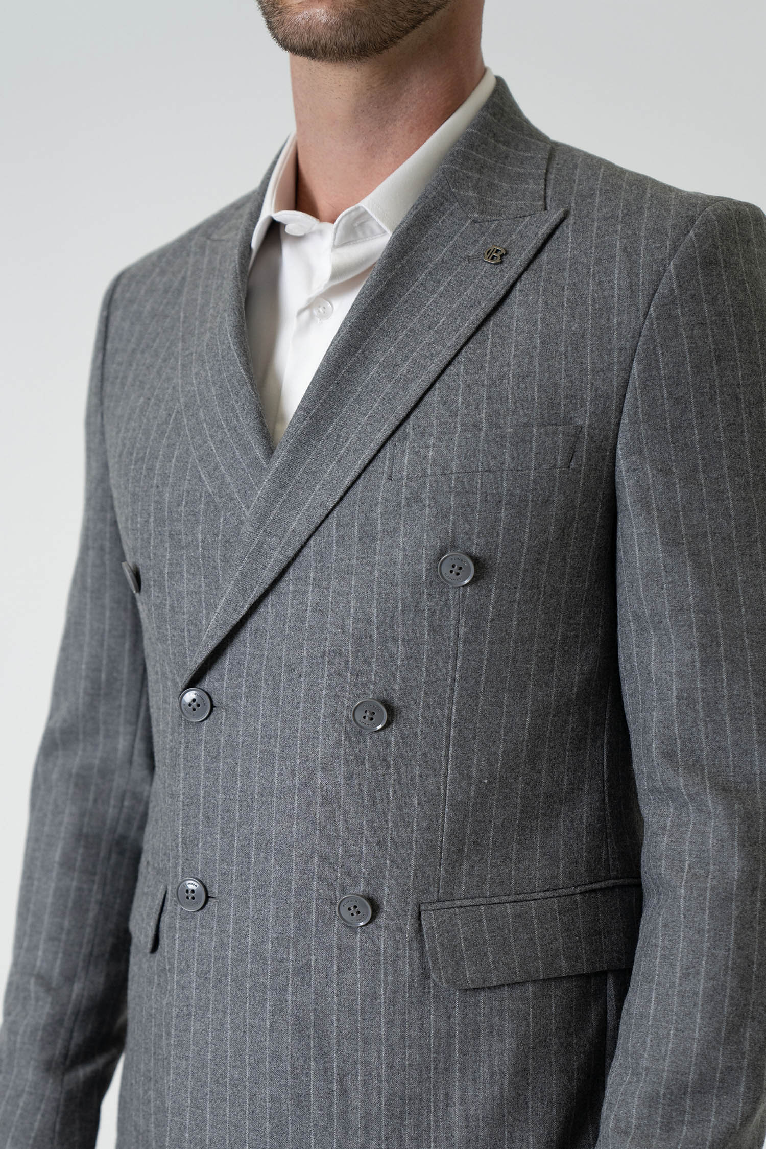 Blending the classic double-breasted style with modern lines, this grey jacket stands out with its distinctive design. The fine vertical pinstripes add a touch of refined elegance, while the double-breasted structure delivers a strong, stylish look. Its modern fit cut provides a tailored silhouette, and the high-quality fabric ensures all-day comfort.