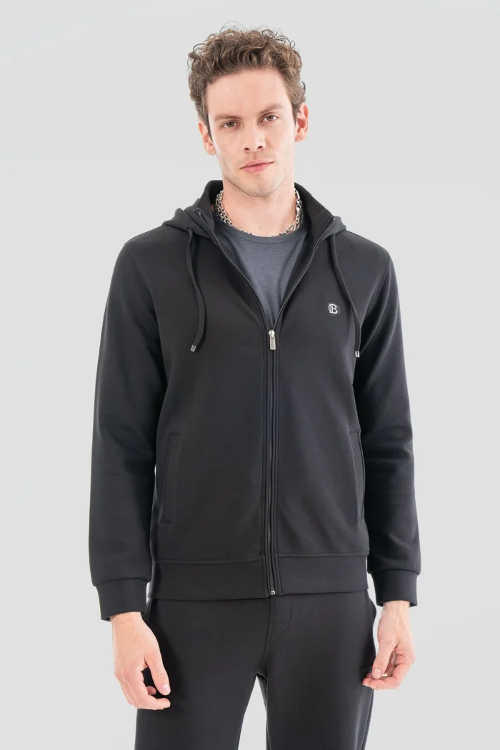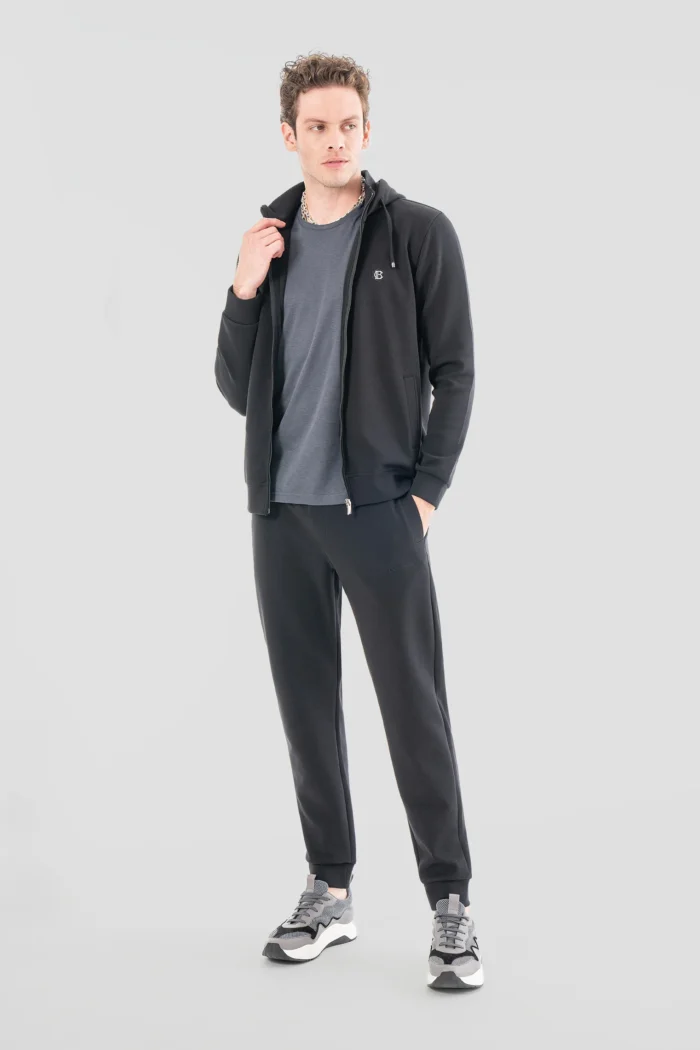 This modern black tracksuit combines daily comfort and elegance. It offers all-day comfort thanks to its soft texture and flexible structure, while adding an elegant touch to your style with its stylish design. The zippered jacket on the top is easy to put on and take off, while the bottom provides freedom of movement with its comfortable cut. This suit, which you can use comfortably both while doing sports and in daily life, is a must-have piece in every man’s wardrobe.