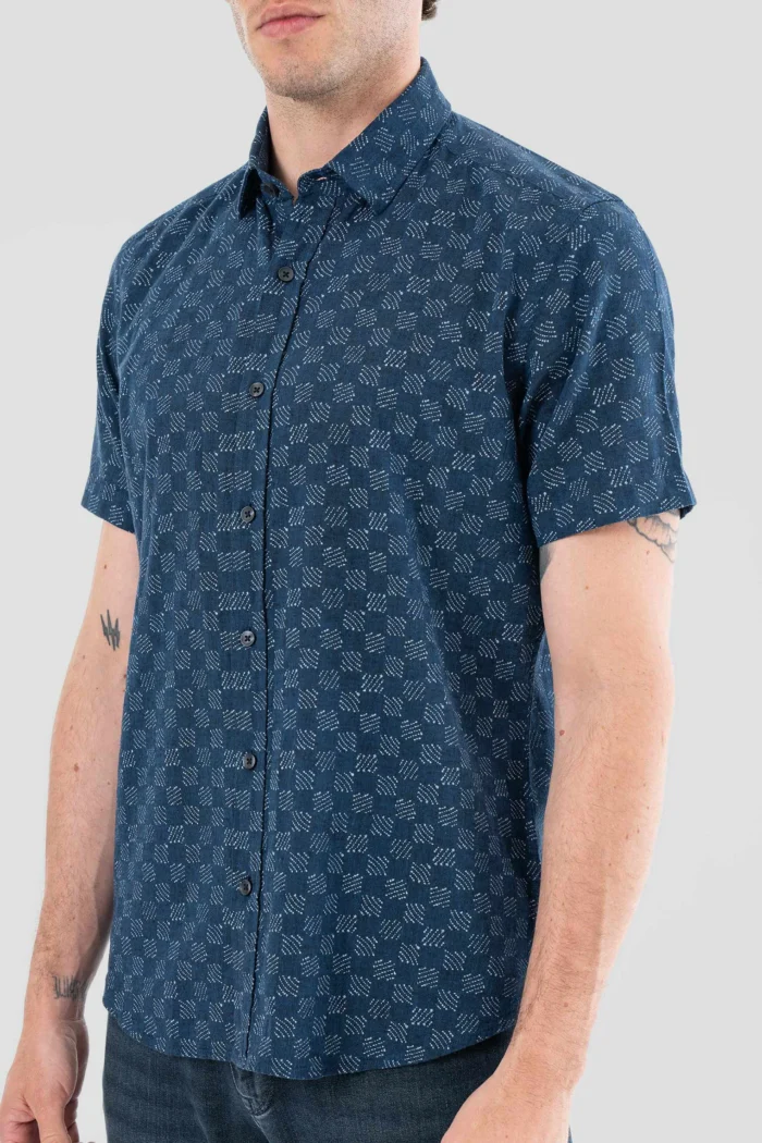 This patterned navy blue short sleeve shirt is a perfect option for men looking for both elegance and comfort in the summer months. You can complete your summer style by combining it with shorts or linen trousers.
