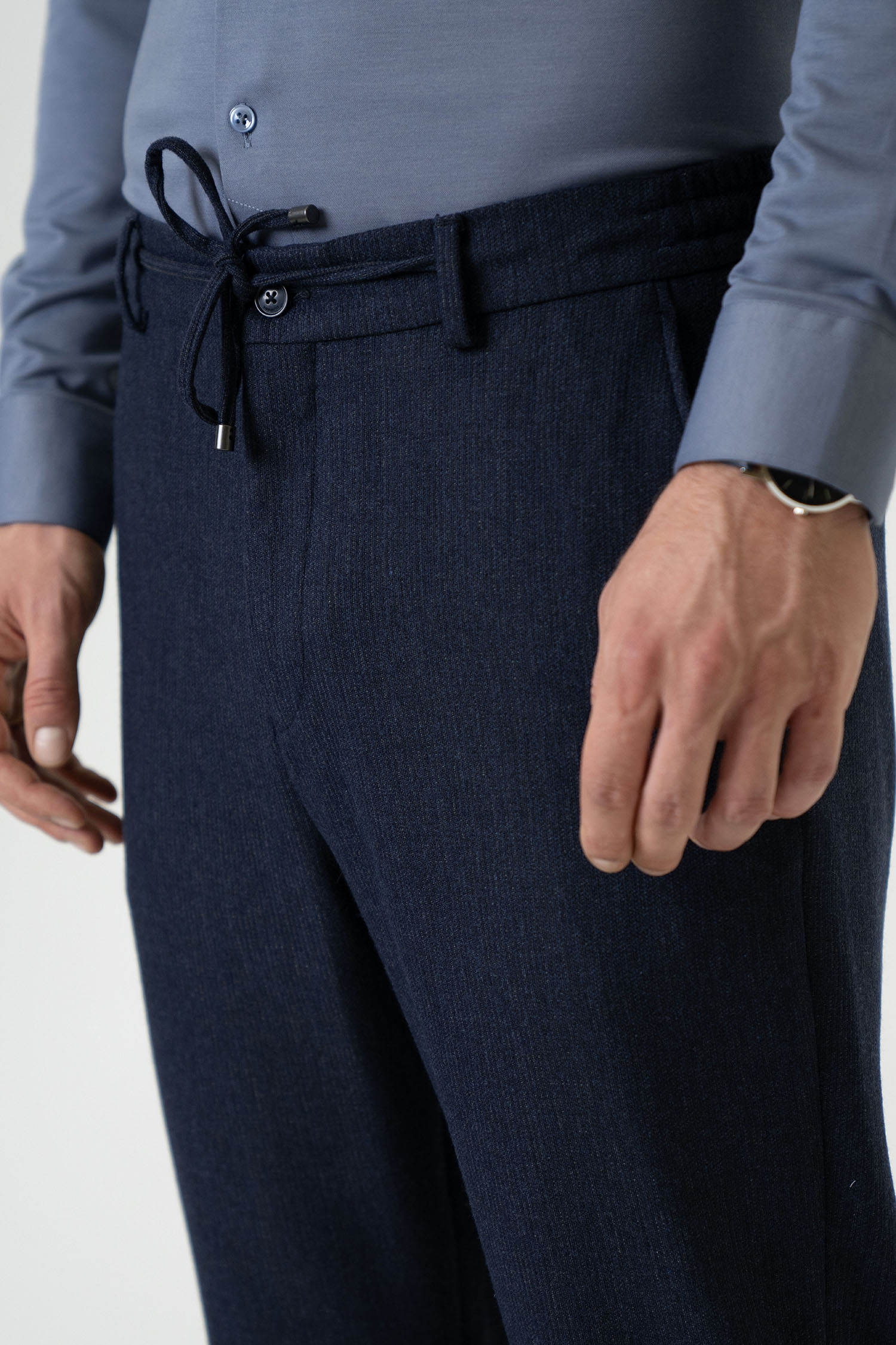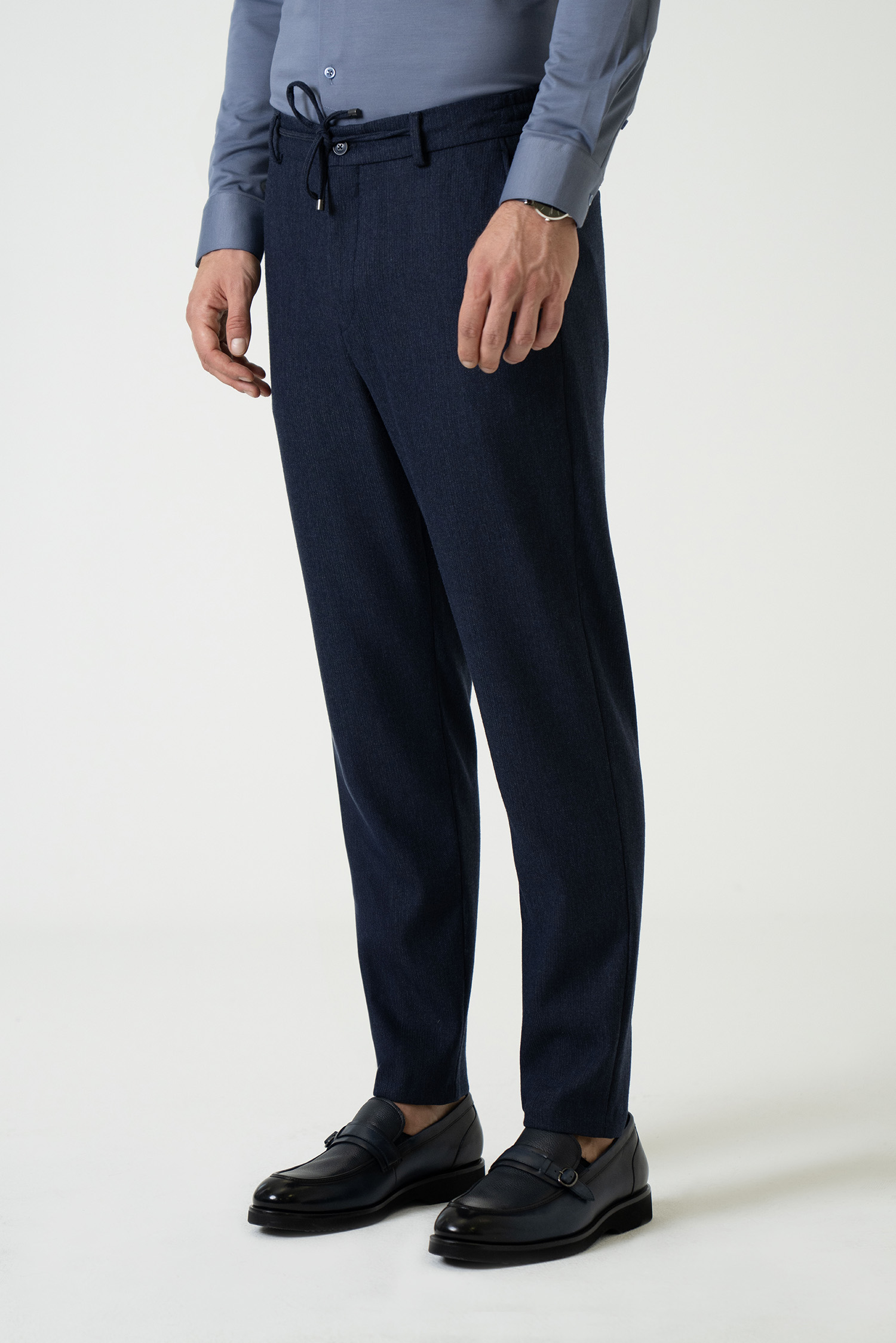 Standing out with their modern design, these navy blue trousers create a sleek and refined look with their slim fit cut. The finely textured fabric ensures all-day comfort, while the drawstring waist detail adds a modern touch to classic trousers.