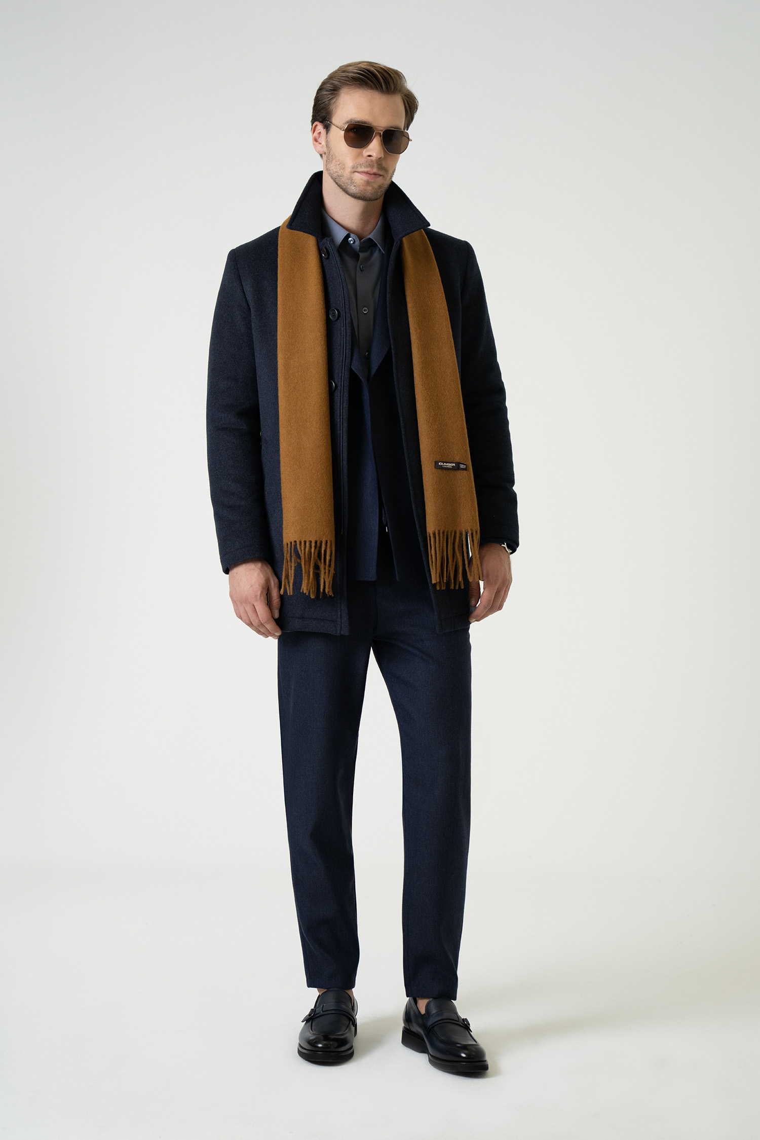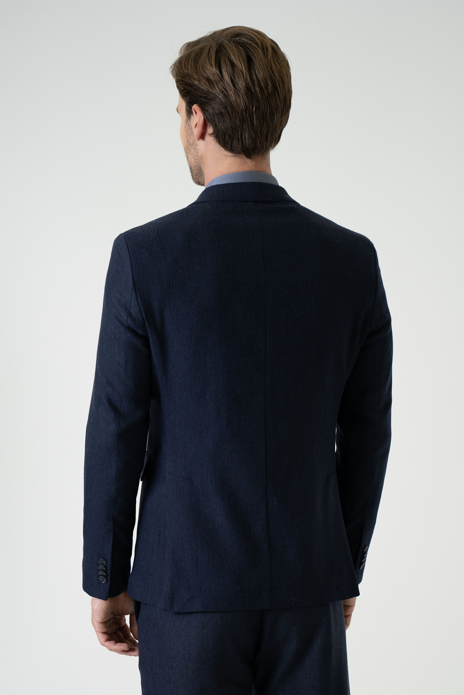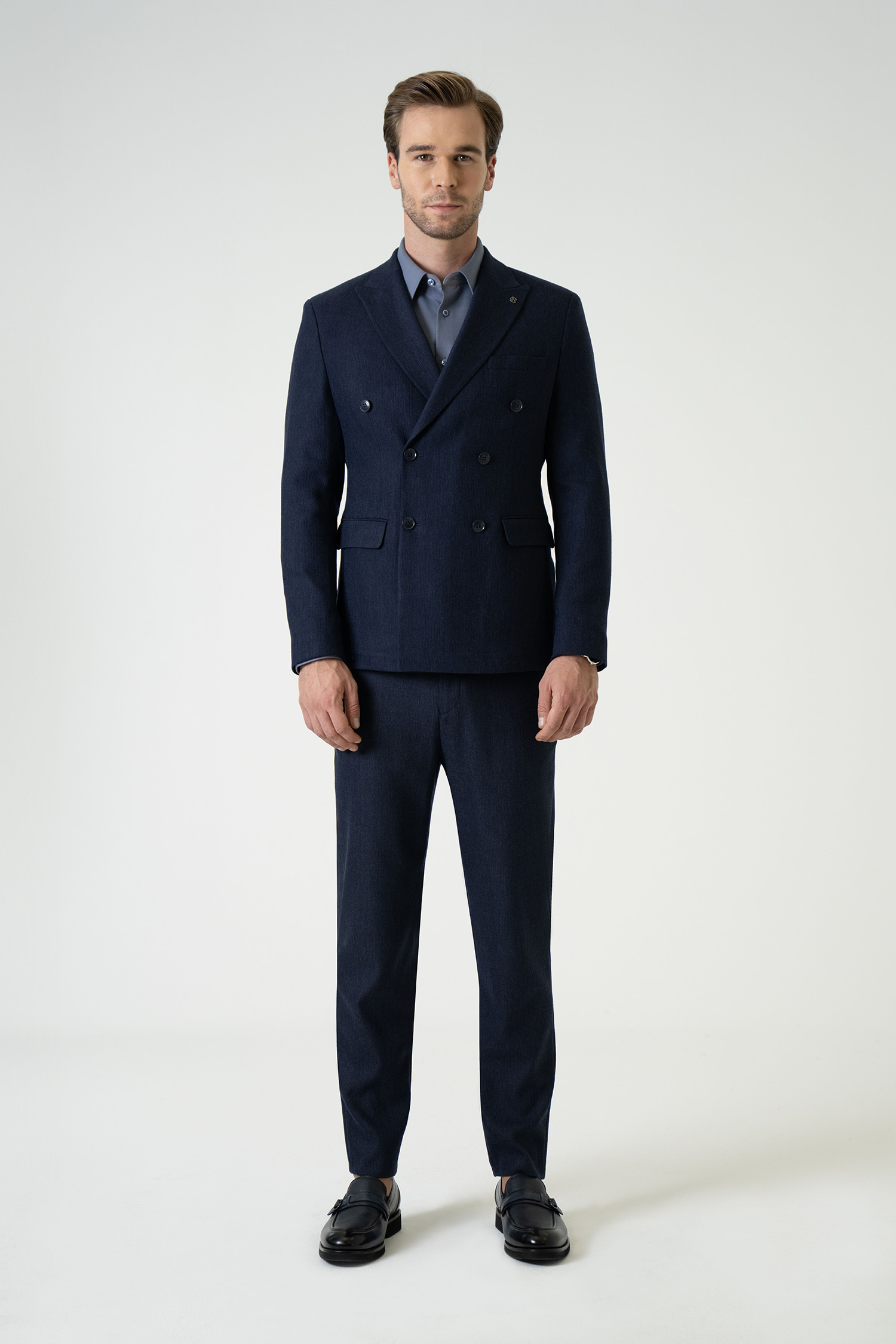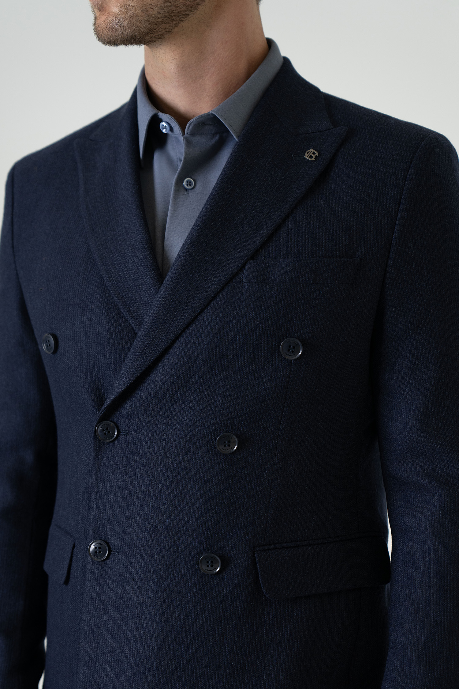 Blending the classic double-breasted design with modern details, this navy jacket is an ideal choice for a sophisticated and powerful style. The modern fit cut provides a sleek, tailored silhouette, while the double-button structure and sharp lines make it a standout piece.