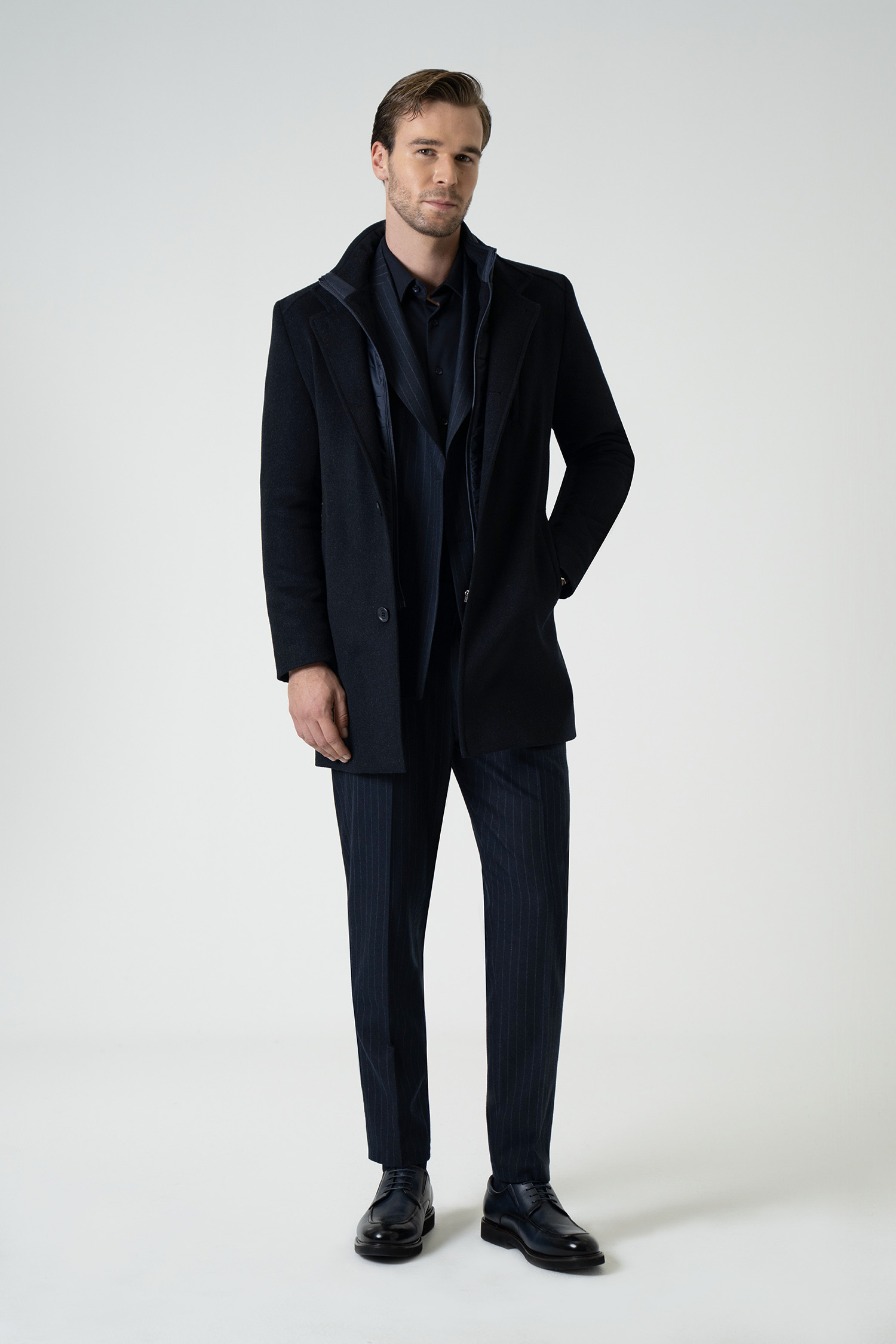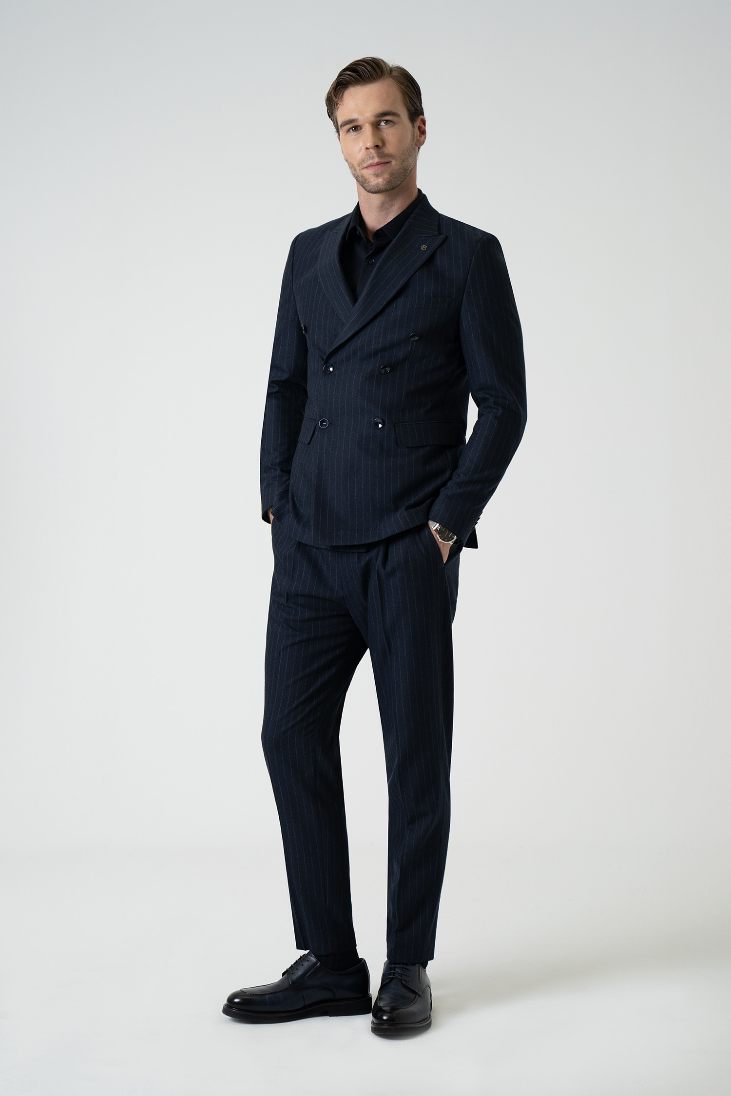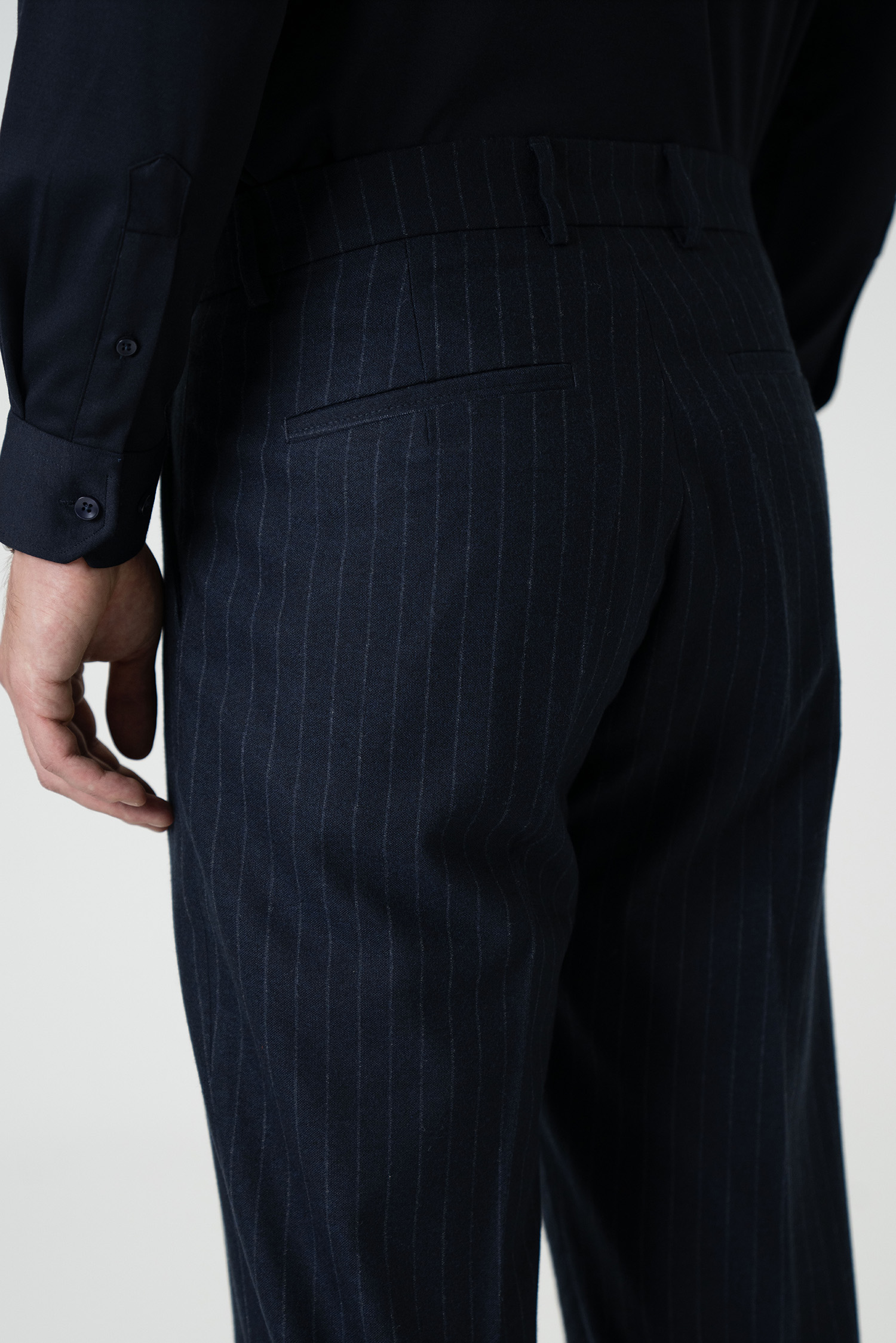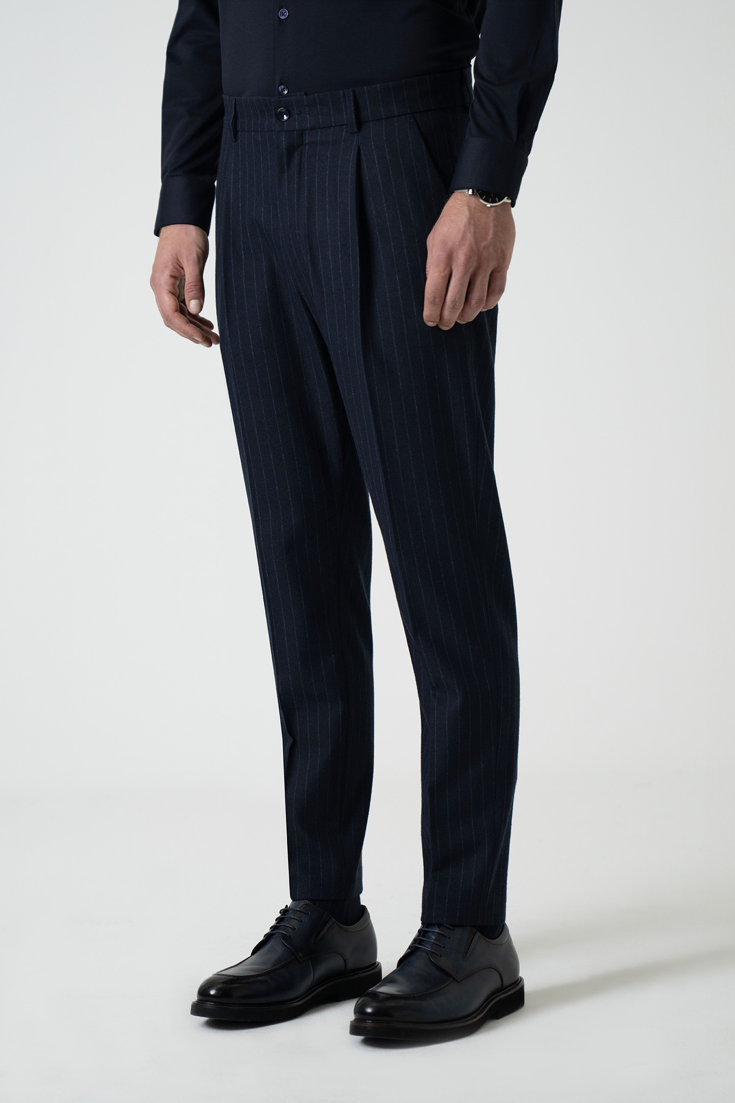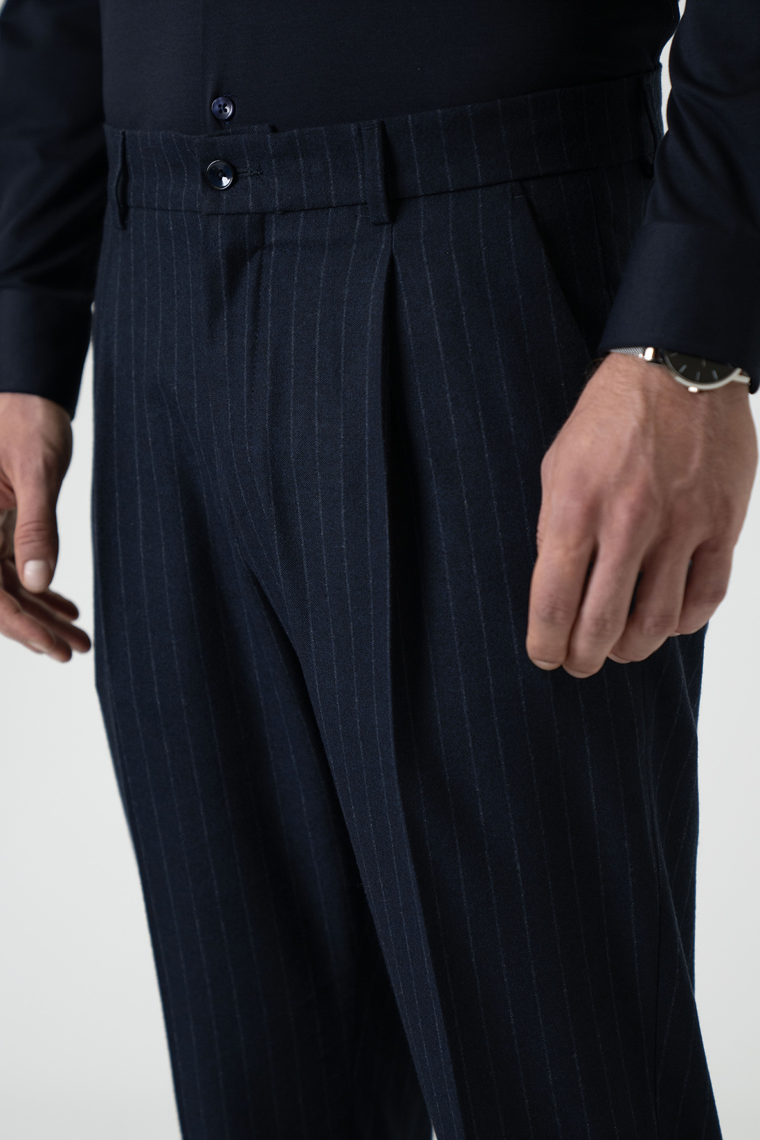Designed with a modern interpretation of classic lines, these navy trousers combine elegance with comfort through their refined pinstripe pattern and relaxed cut. Featuring front pleat details and a straight-leg form, they create a sophisticated stance while ensuring ease of wear throughout the day. An essential piece that completes the elegance of a suit, whether in business settings or special occasions.