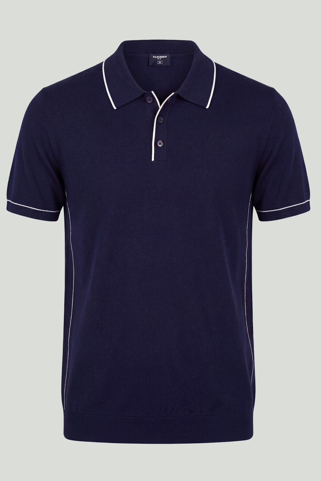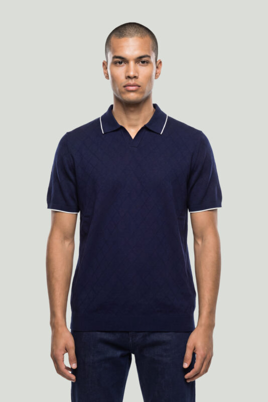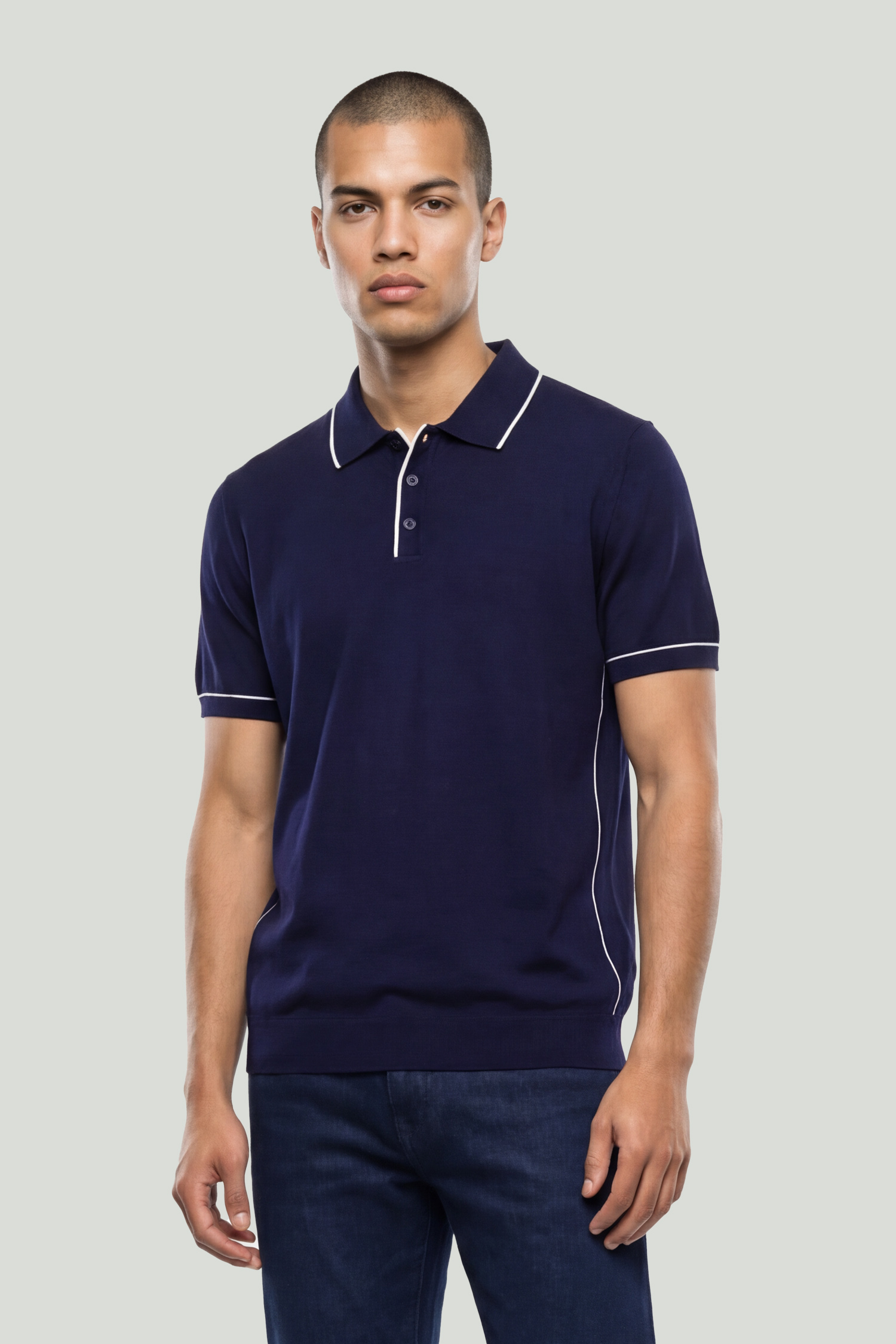 Featuring modern lines and refined contrast details, this navy knit polo offers a fluid and comfortable feel thanks to its rayon blend construction. Its clean form and subtle stripe accents reflect understated elegance with a strong, modern attitude.