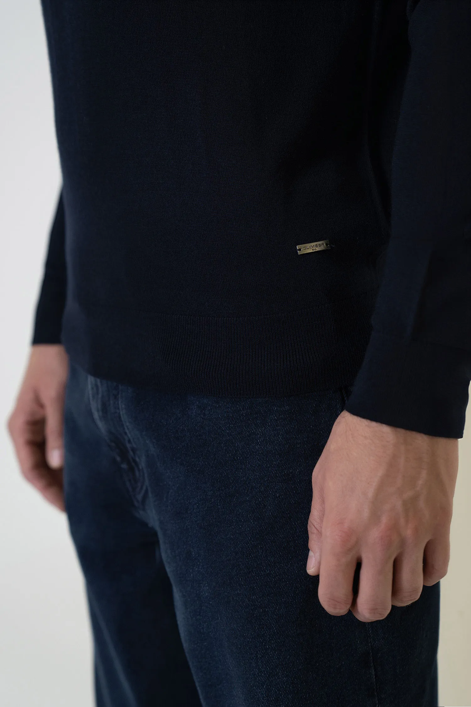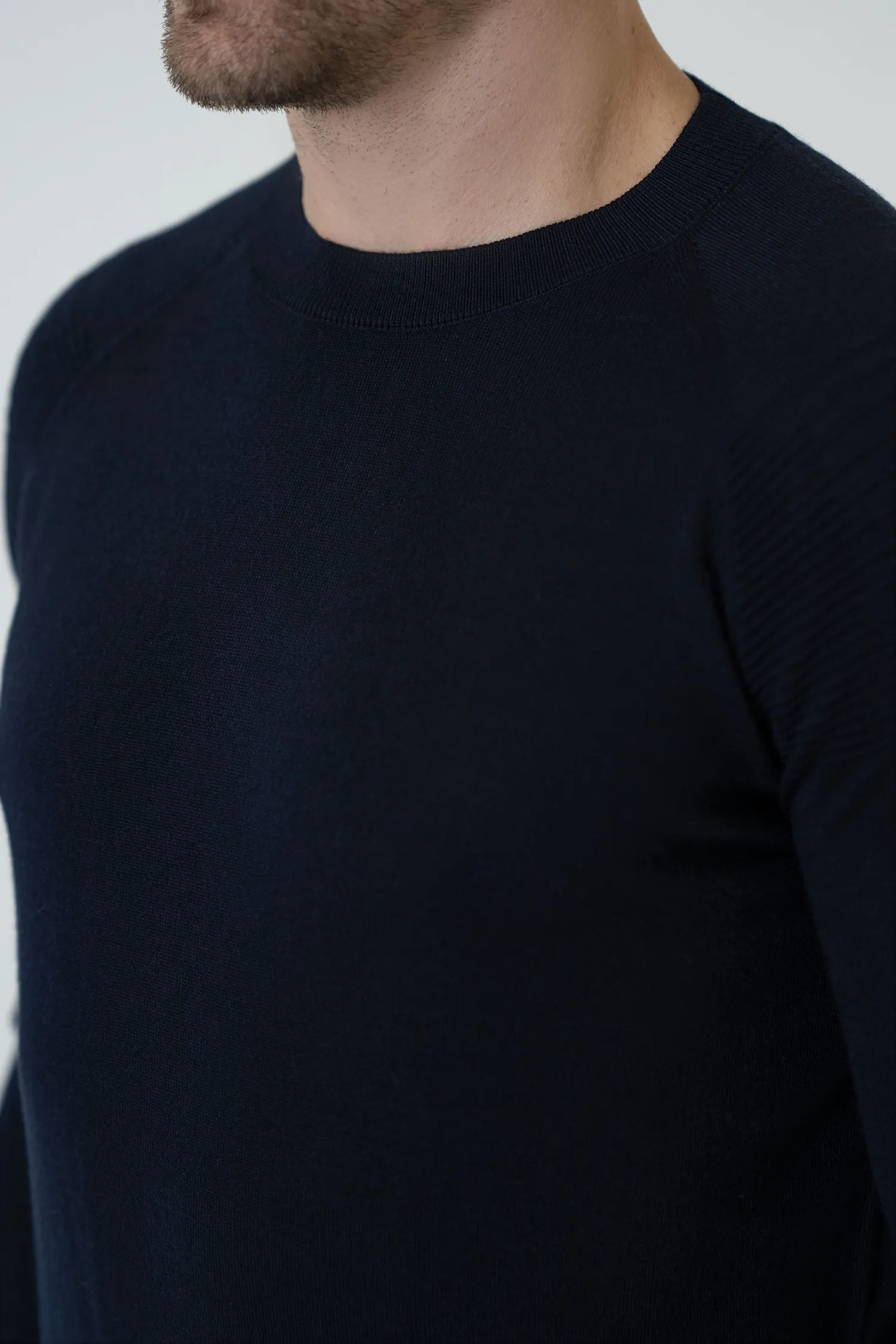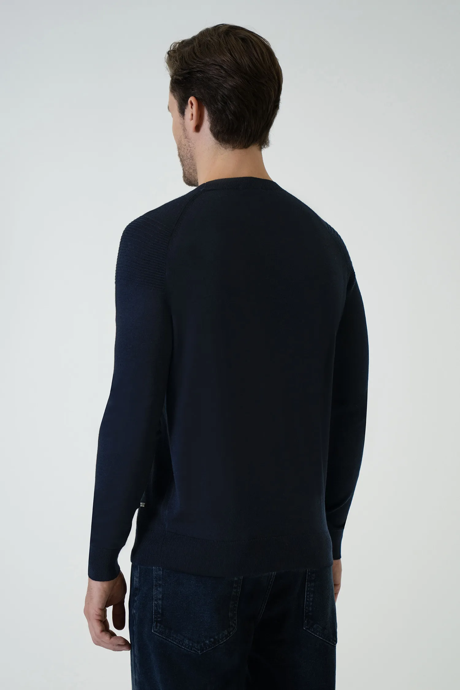 Offering a modern and strong look with its deep navy tone, this fine-knit sweater adds dynamic character to its clean design through ribbed shoulder details. With its soft, lightweight and fluid structure, it provides day-long comfort as a refined wardrobe essential.