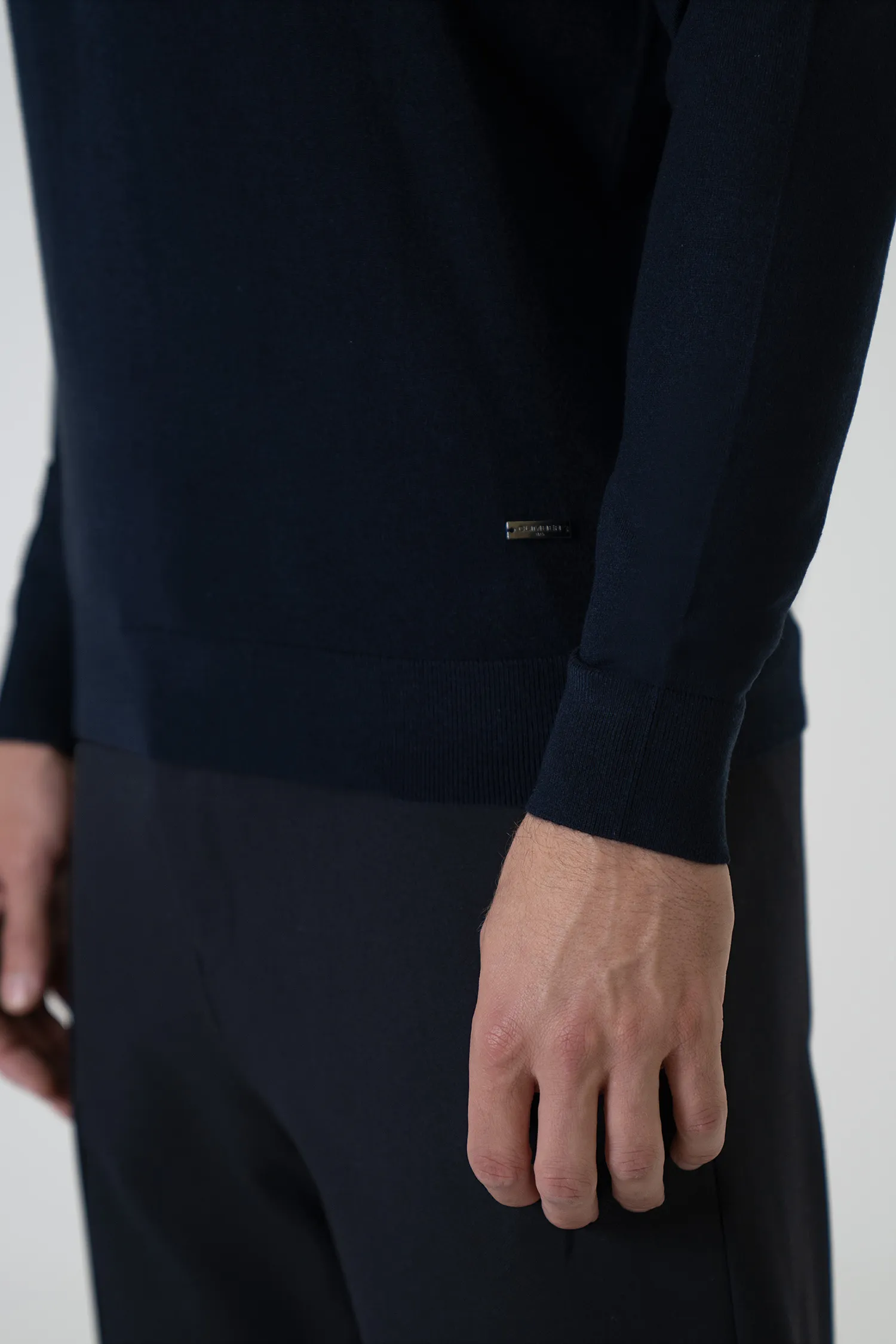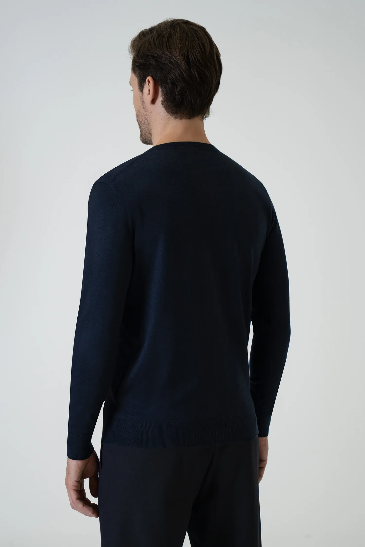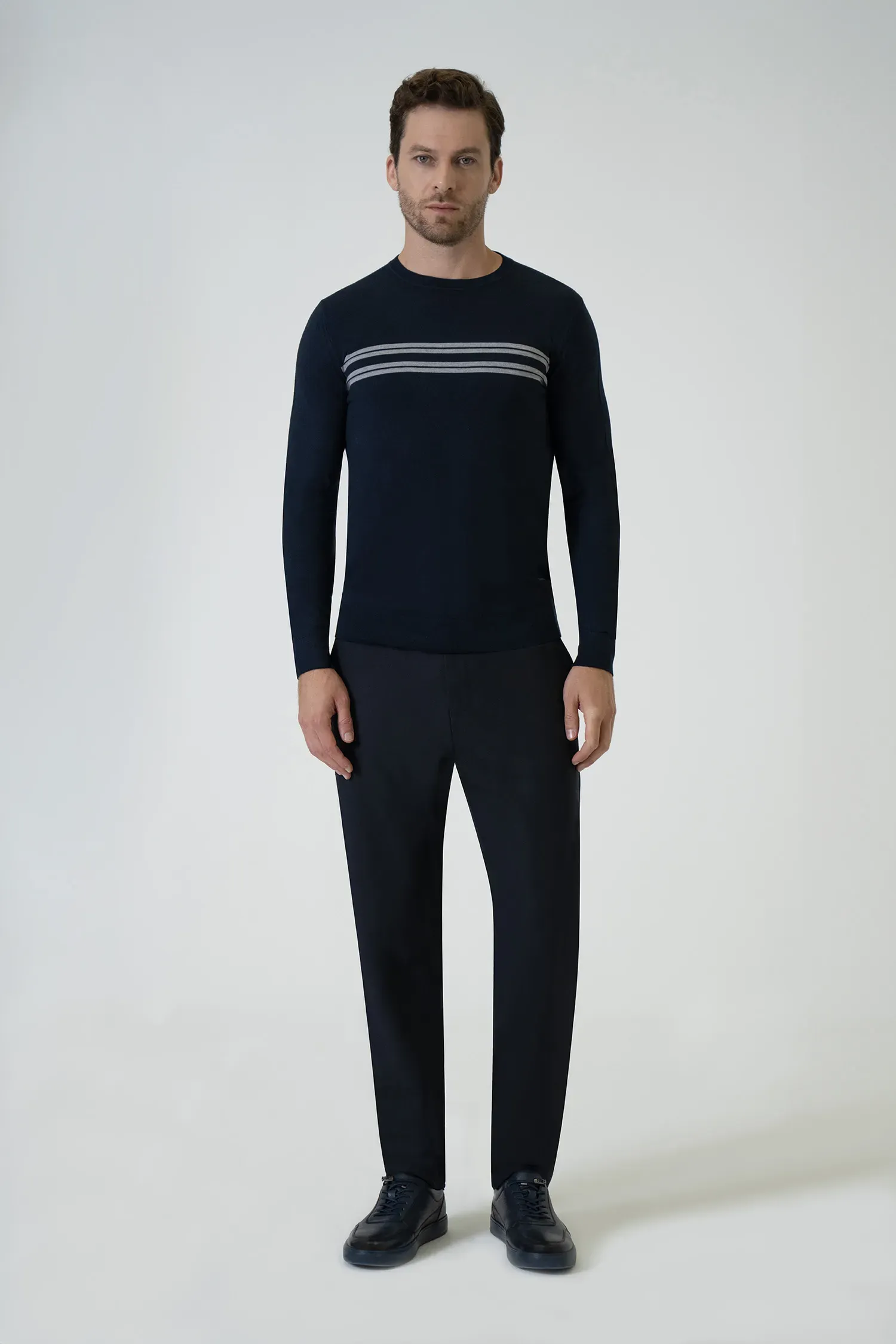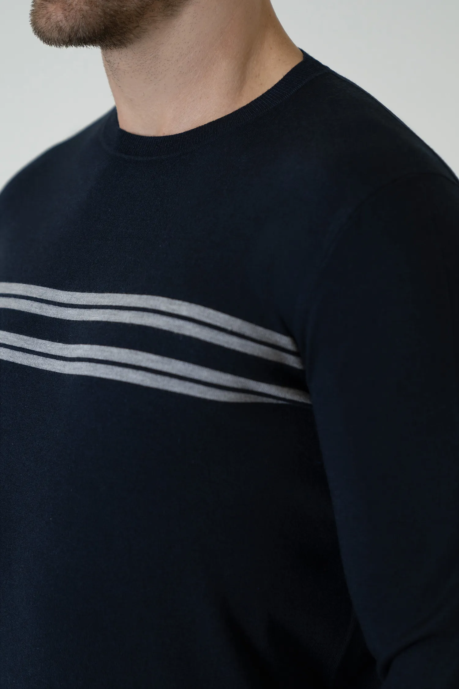 Transforming the calm and sophisticated navy tone into a modern rhythm with its subtle grey chest line detail, this sweater offers both lightness and refined elegance through its silky soft knit texture.