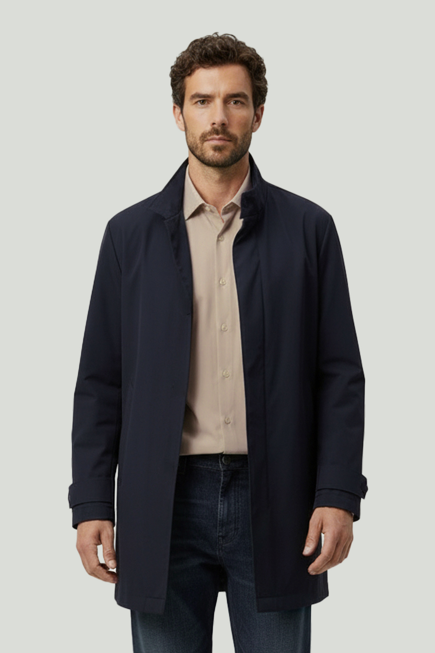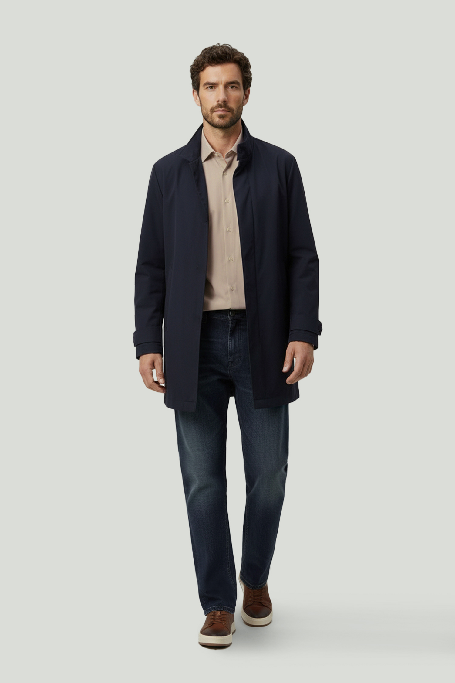 A timeless piece of classic outerwear, this trench coat offers a modern look with its clean design and balanced fit. Its above-the-knee length creates a well-structured silhouette, while the smooth fabric surface gives the piece a refined character. Suitable for both everyday outfits and city style, it stands out as a functional and elegant outerwear option.