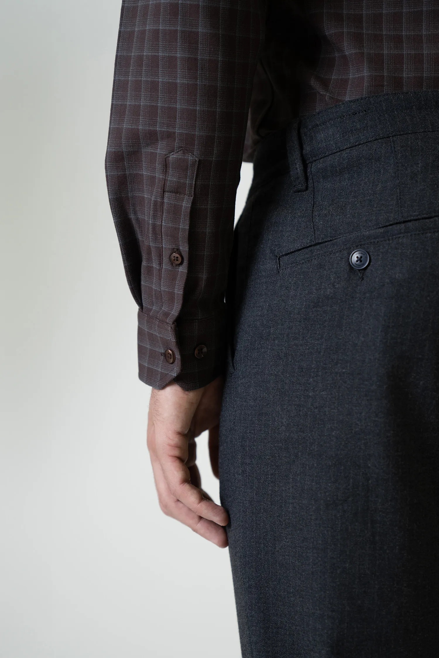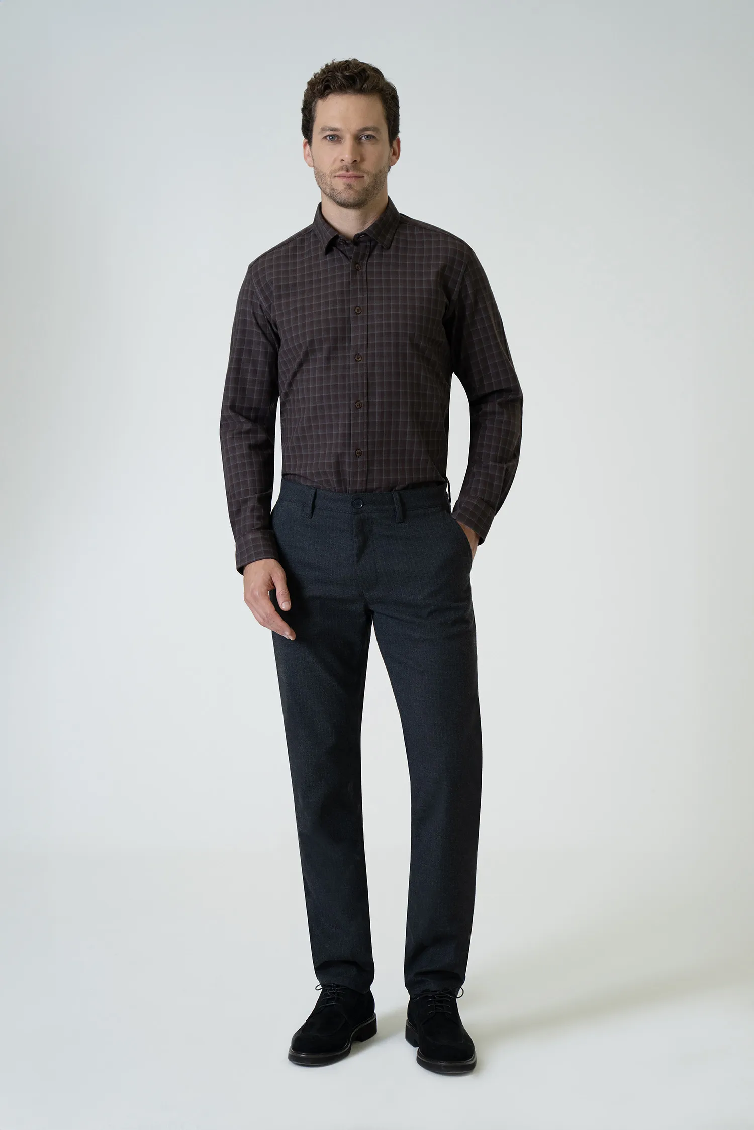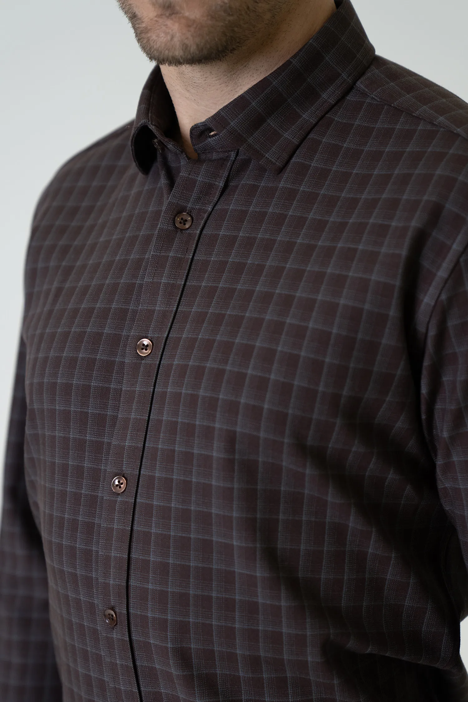 Offering a modern and calm look with its fine plaid pattern laid over a dark brown base, this original fit shirt provides all-day comfort with its soft texture and relaxed silhouette. The minimal linear design makes it a timeless and elegant choice for both office wear and everyday style.
