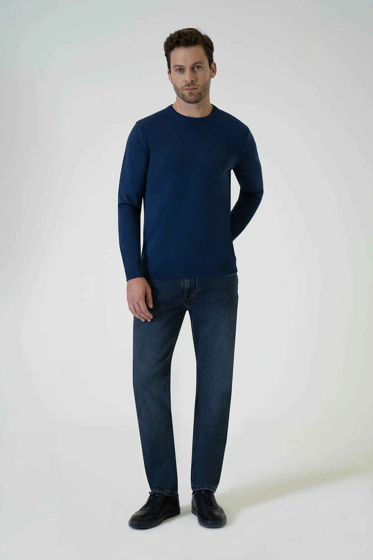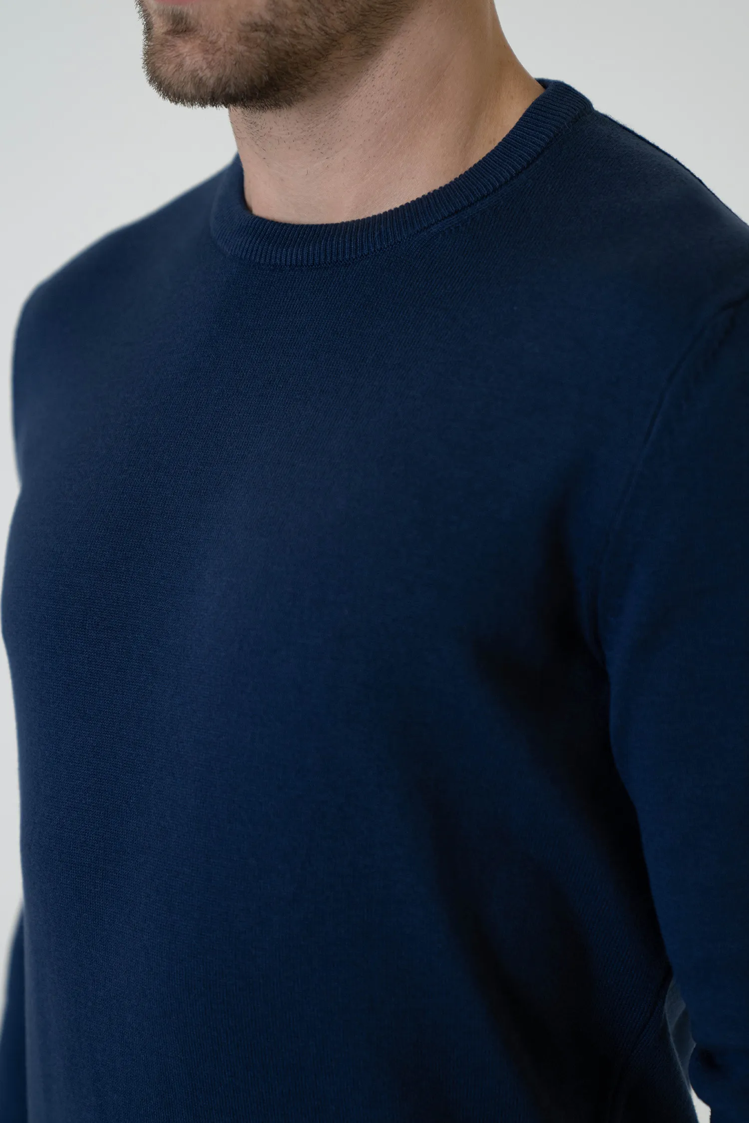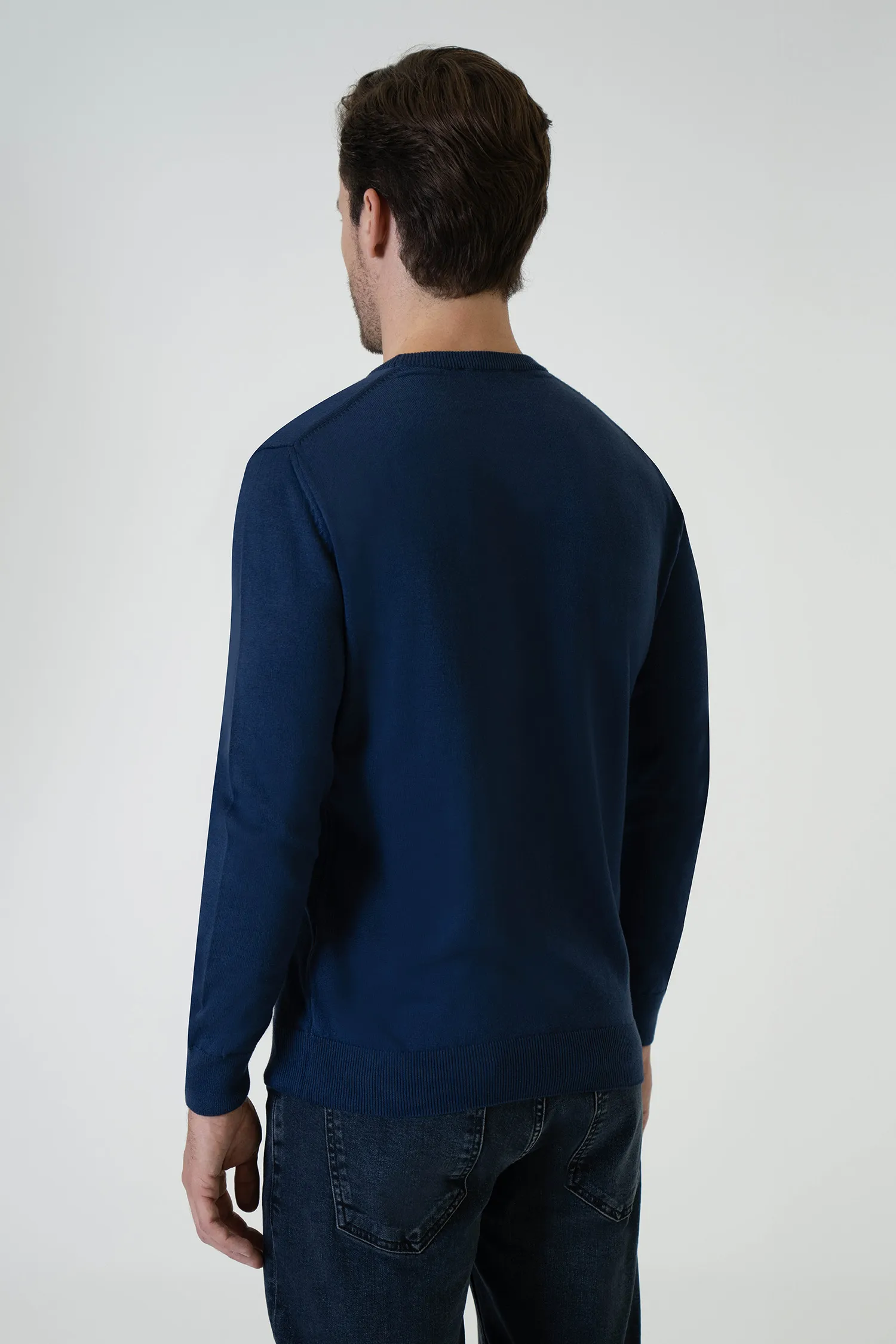 Offering a modern stance with its calm and deep navy tone, this fine-knit sweater highlights minimalist elegance with its smooth surface, lightweight structure, and flexible texture that provides all-day comfort.