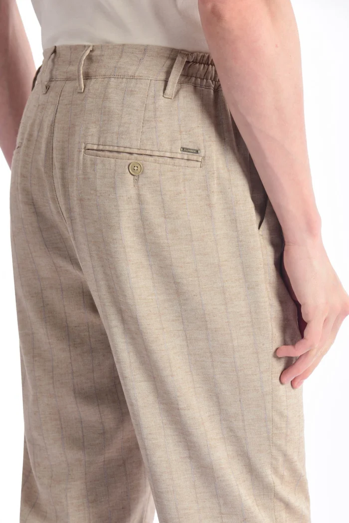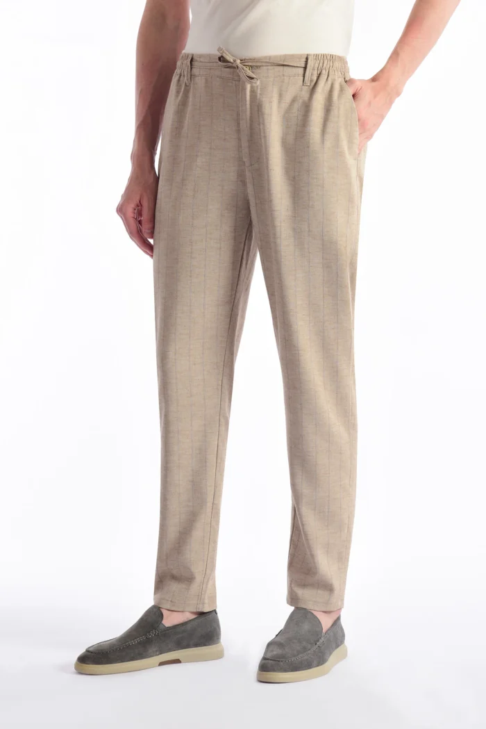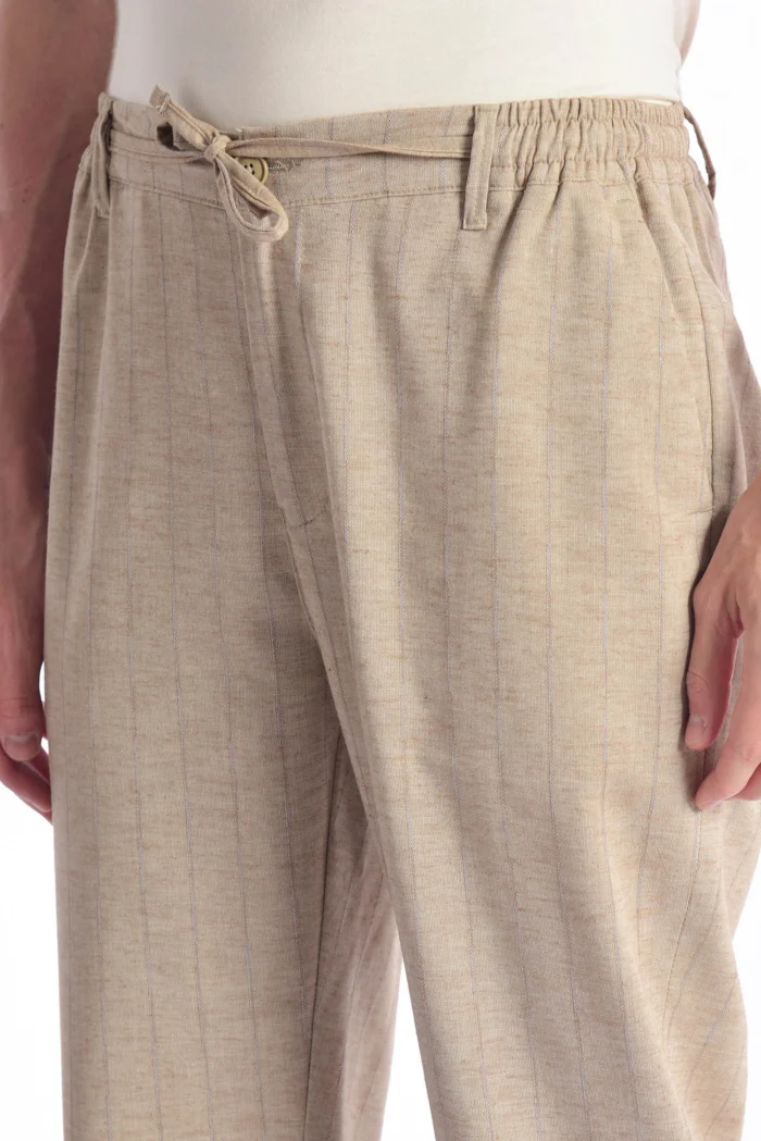 The trousers in the image are an ideal choice for both daily and smart casual combinations with their light texture and elegant striped patterns. The lace detail on the waist provides comfort, while the non-narrow leg cut provides comfort all day long. Beige tones and thin striped texture bring naturalness and elegance together.