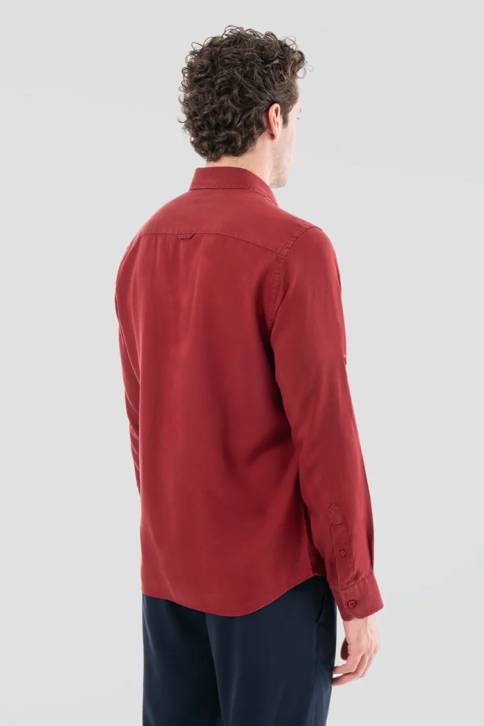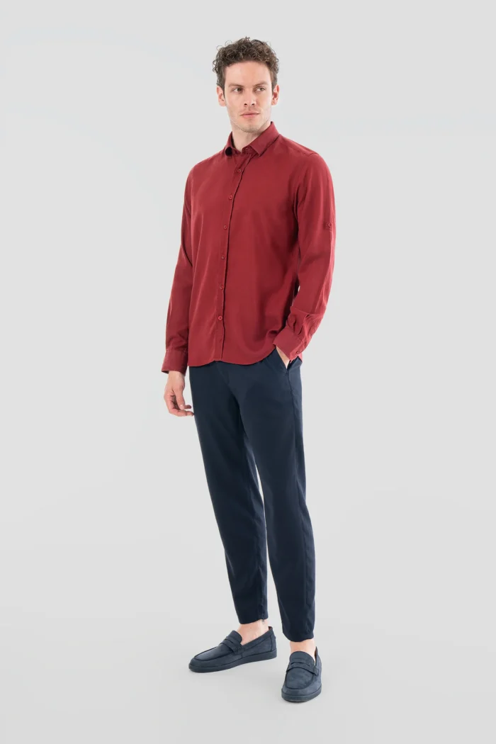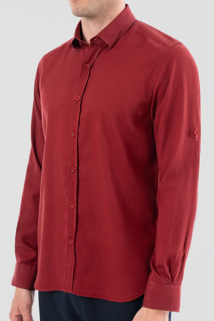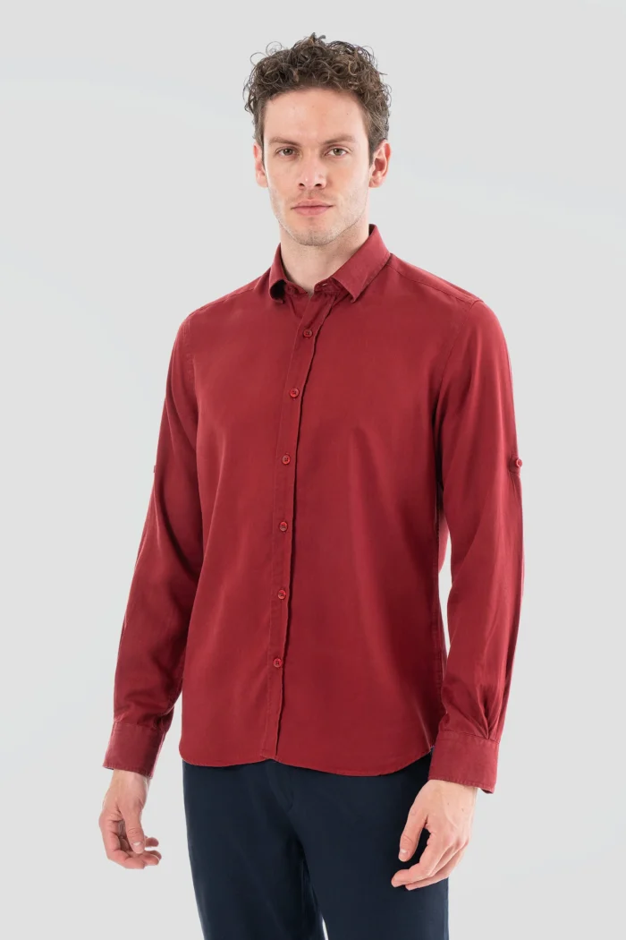 Meet our burgundy long-sleeved shirt that will liven up your wardrobe and highlight your style! This burgundy long-sleeved shirt is an ideal option for stylish men. You can easily combine it with jeans, trousers or shorts to complete your daily style. You can also achieve a stylish look with tops such as a blazer or jacket.