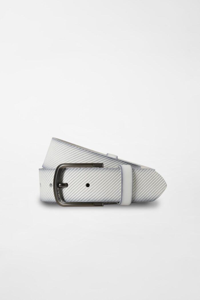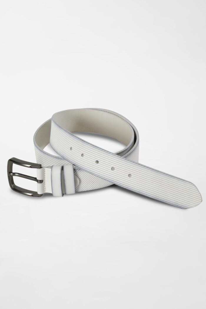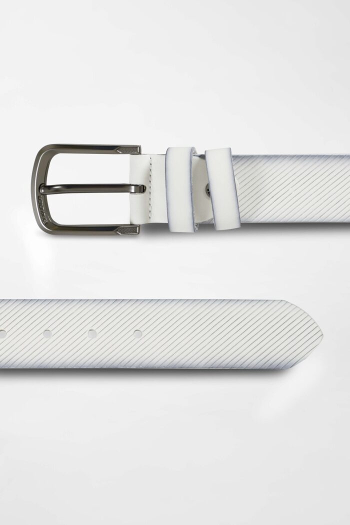 This white leather belt, which will complete the modern man’s style, offers elegance and simplicity together. This piece, which stands out from classic belts with its thin striped pattern detail, adds a sophisticated touch to your daily and special combinations. Made of high-quality leather, this belt provides long-term use with its durability. This belt, which gives a minimalist look with its metal buckle, is a timeless accessory that every man should definitely have in his wardrobe.