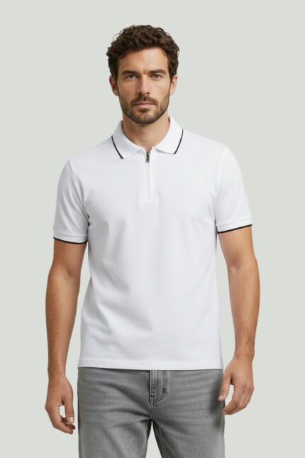 Белая футболка с воротником-стойкой и застежкой-молнией, изготовленная из мерсеризованной ткани.