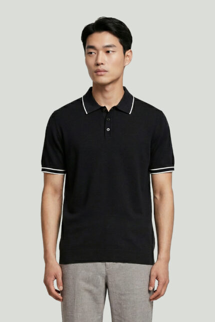 Вязаная футболка-поло с воротником-молнией и полосатым декором.