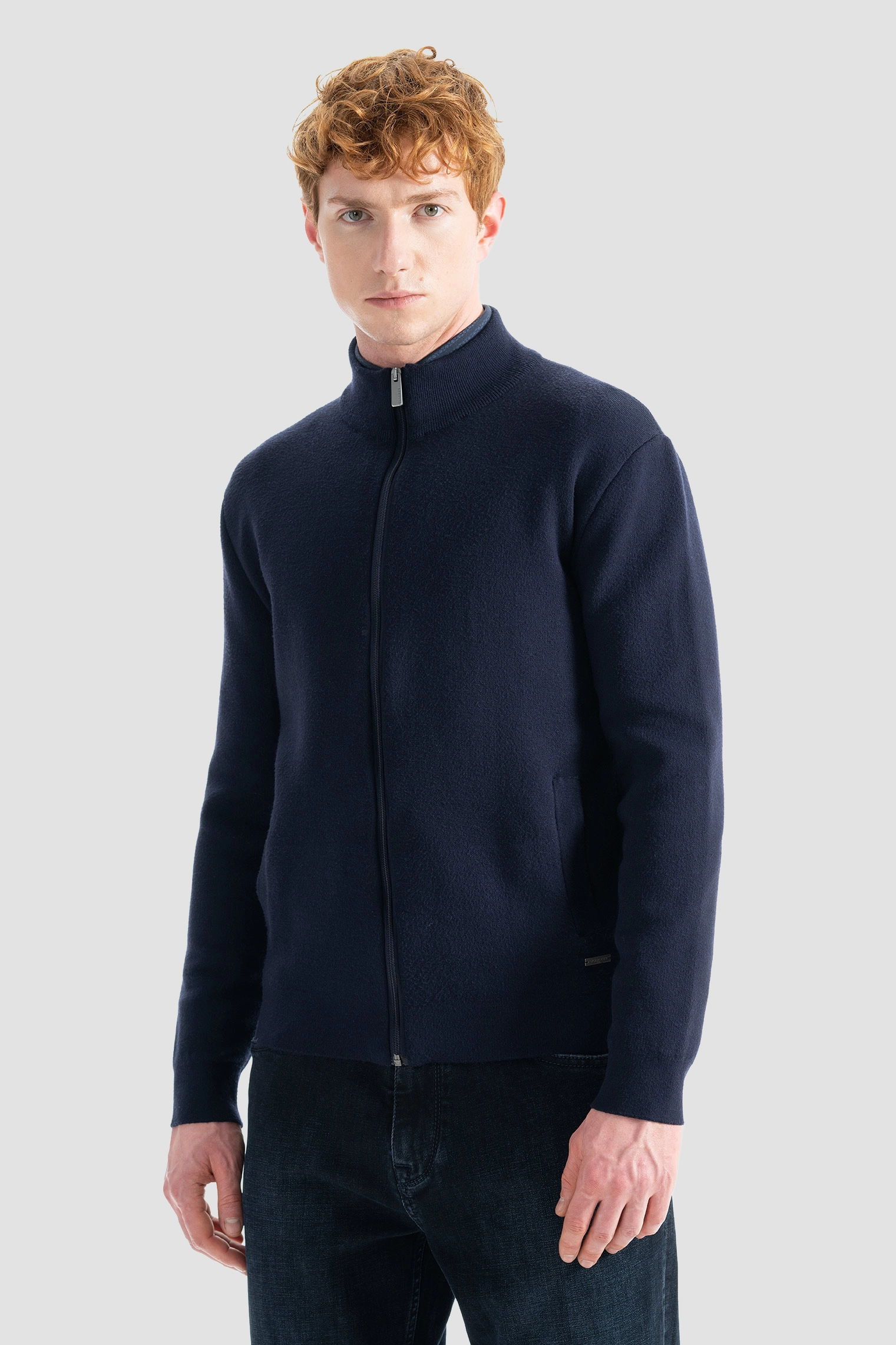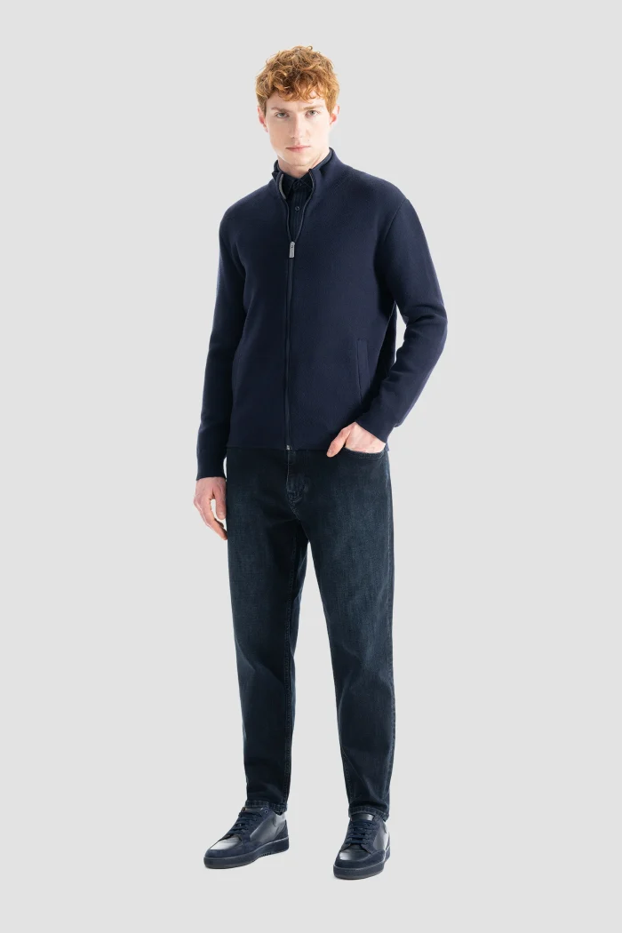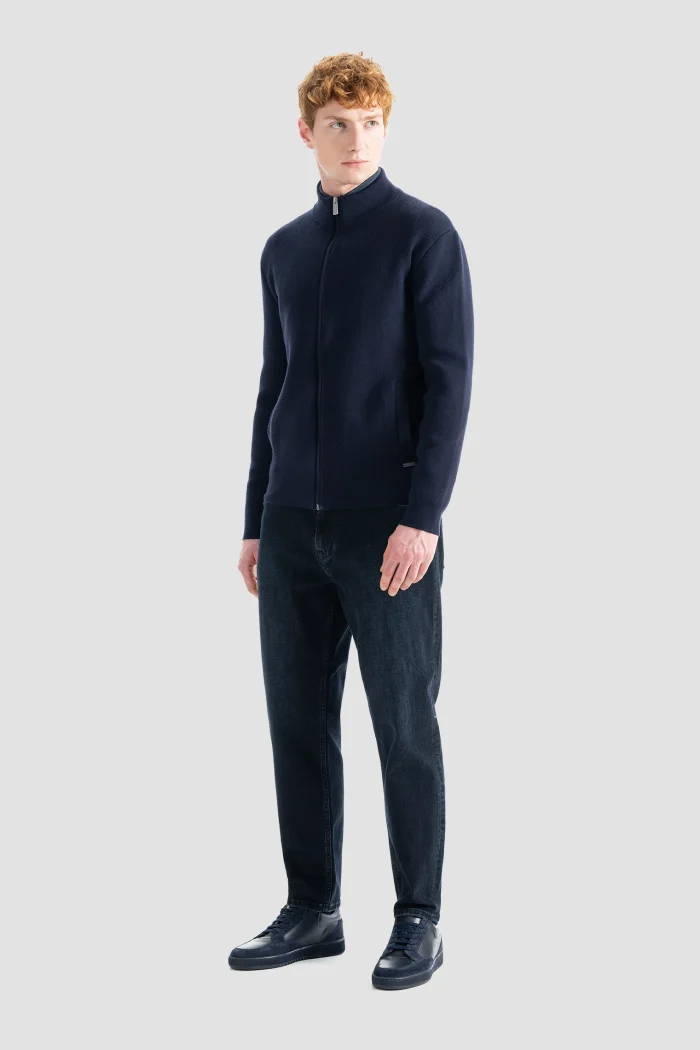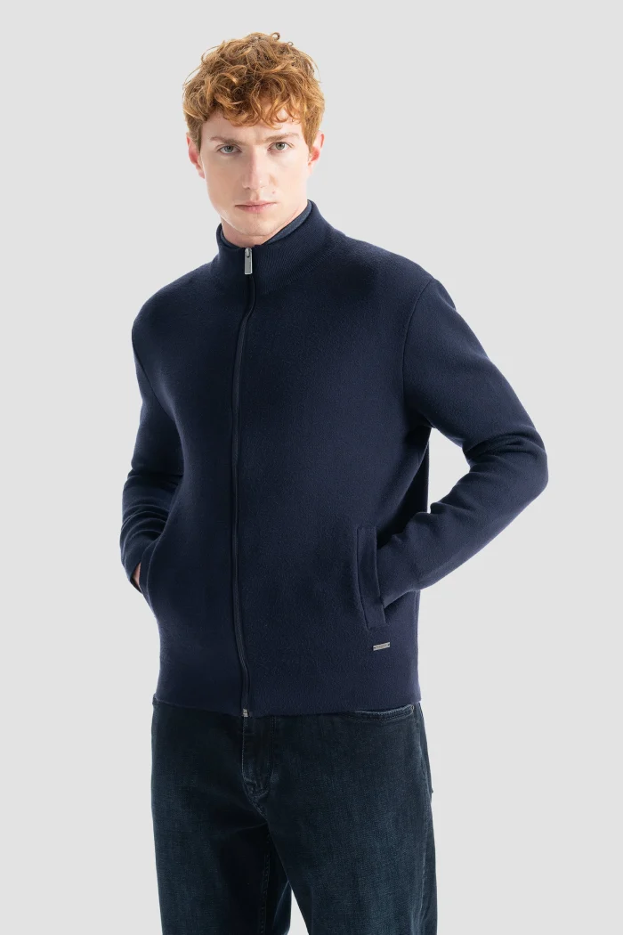Отражая элегантность, которая рождается из простоты, эта темно-синяя вязаная куртка на молнии — отличный вариант для стильных мужчин.nБлагодаря высококачественной текстуре и мягкой трикотажной ткани она сохранит тепло и комфорт в течение всего дня, одновременно подчеркивая Вашу элегантность своим современным кроем.nБлагодаря молнии и боковым карманам этот жакет, обладающий повышенной функциональностью, можно с комфортом использовать как для повседневной носки, так и для офисного стиля в холодную погоду.nБлагодаря своей тонкой и легкой структуре, она адаптируется к многослойным комбинациям и прекрасно сочетается с любым стилем.