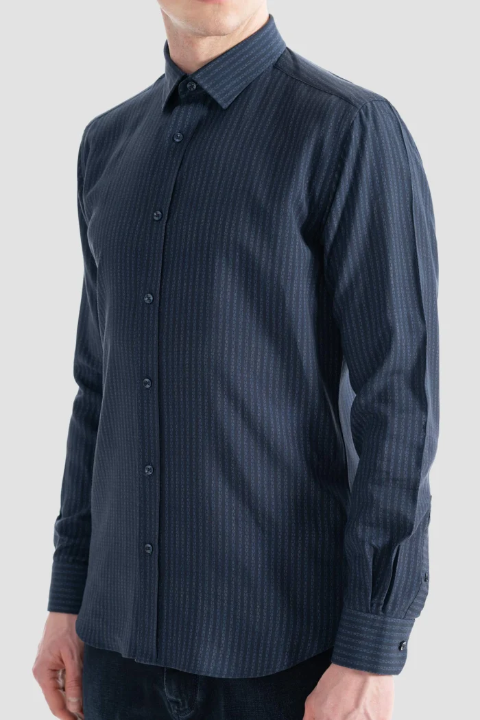 Эта темно-синяя рубашка в полоску, сочетающая в себе классические линии и современный стиль, подчеркнет Вашу элегантность как в деловой жизни, так и в повседневном использовании.