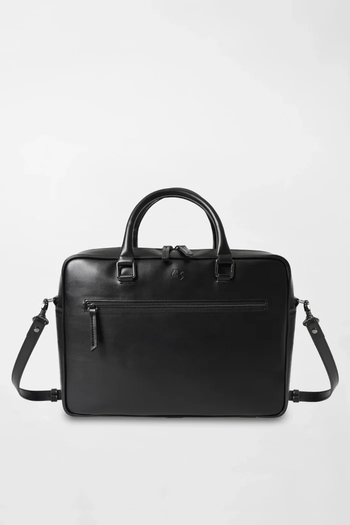 Эта черная кожаная деловая сумка, необходимая для профессиональной жизни, предлагает стиль и функциональность вместе.nИзготовленная из высококачественного кожаного материала, сумка привлекает внимание своим элегантным дизайном и прочной конструкцией.nОна создана, чтобы дополнить Ваш стиль и удовлетворить Ваши потребности как на деловых встречах, так и в повседневном использовании.nБольшое основное отделение сумки позволяет Вам организованно переносить ноутбук, файлы и другие важные предметы.nКроме того, передний карман на молнии обеспечивает легкий доступ к часто используемым предметам.nБлагодаря регулируемому и съемному плечевому ремню Вы можете легко носить сумку как в руках, так и на плече.nБлагодаря черному цвету и минимуму деталей эта деловая сумка отражает идеальное сочетание классического и современного стиля.nИдеальный выбор для мужчин, которые не идут на компромисс с элегантностью в деловой жизни, эта сумка дополнит Ваш профессиональный образ.