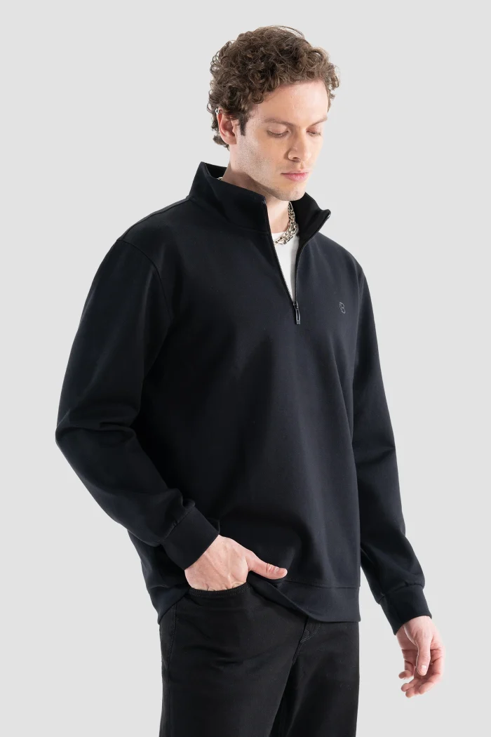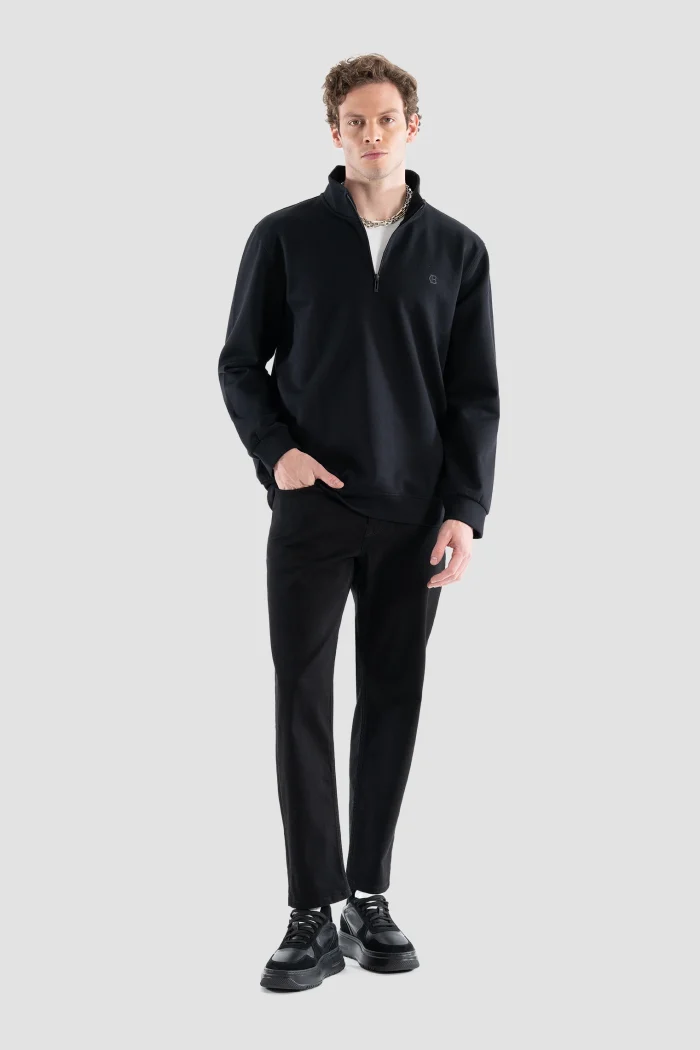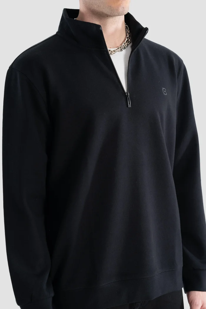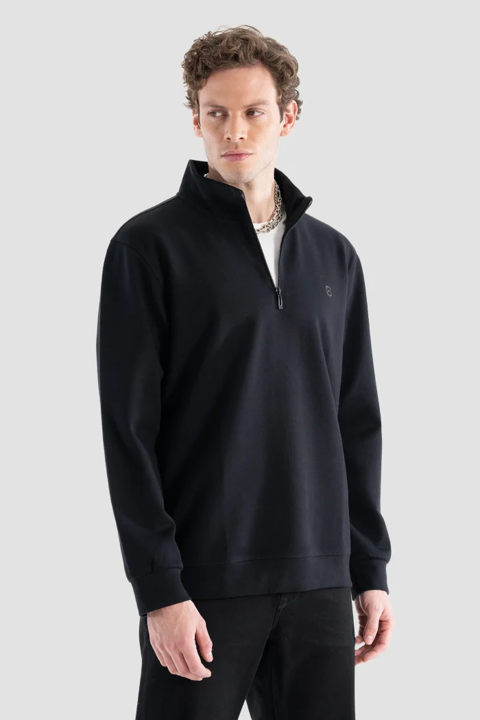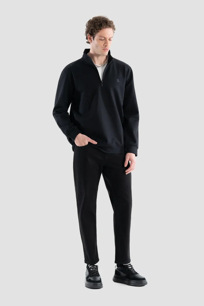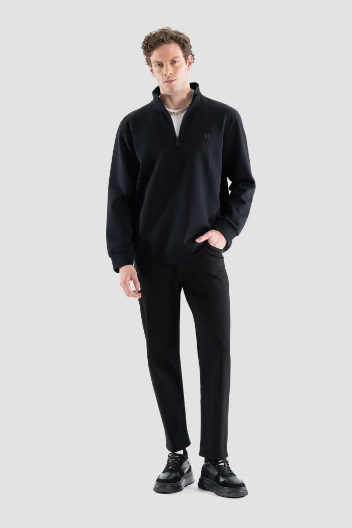 Эта черная толстовка на молнии, привлекающая внимание своим минималистичным дизайном и современным видом, добавит элегантности в Ваш повседневный стиль.nОбеспечивая комфорт в течение всего дня благодаря своей мягкой и высококачественной ткани, она в то же время предлагает функциональность благодаря своей полузастежке-молнии.nЭта толстовка, которую можно легко использовать в холодную погоду, сочетается как с Вашими спортивными комбинациями, так и с более классическими вещами.nВечная вещь, которая должна быть в Вашем гардеробе благодаря своему стильному виду и удобному крою.