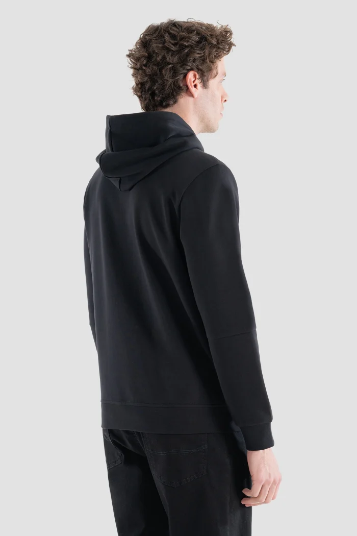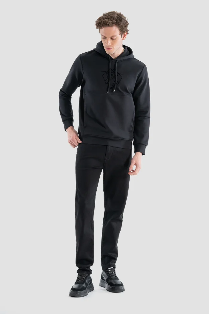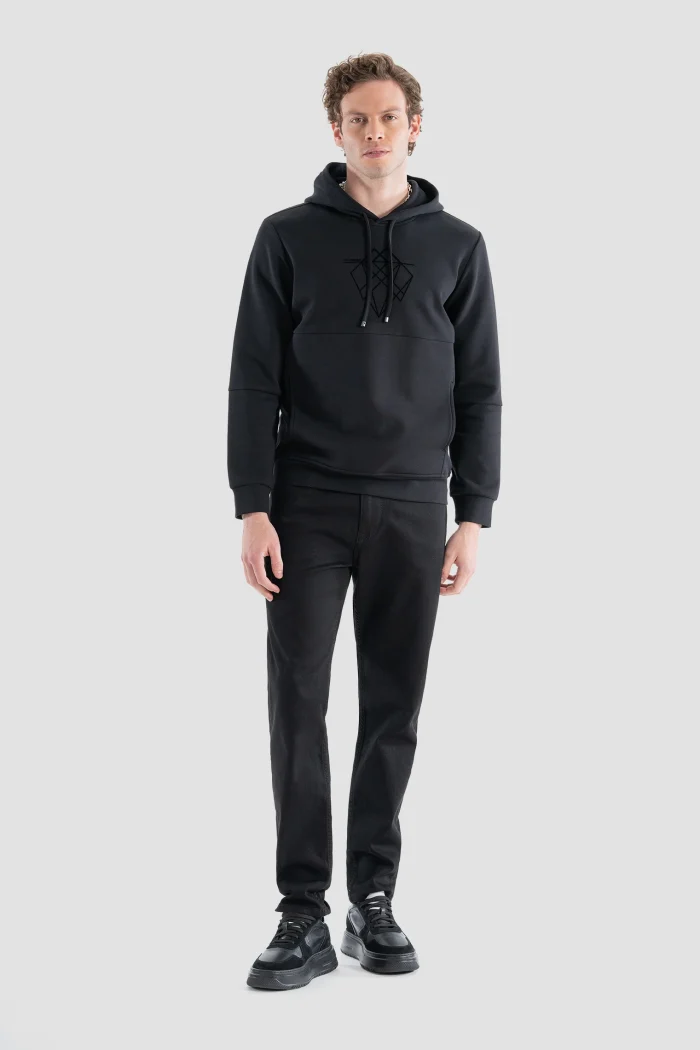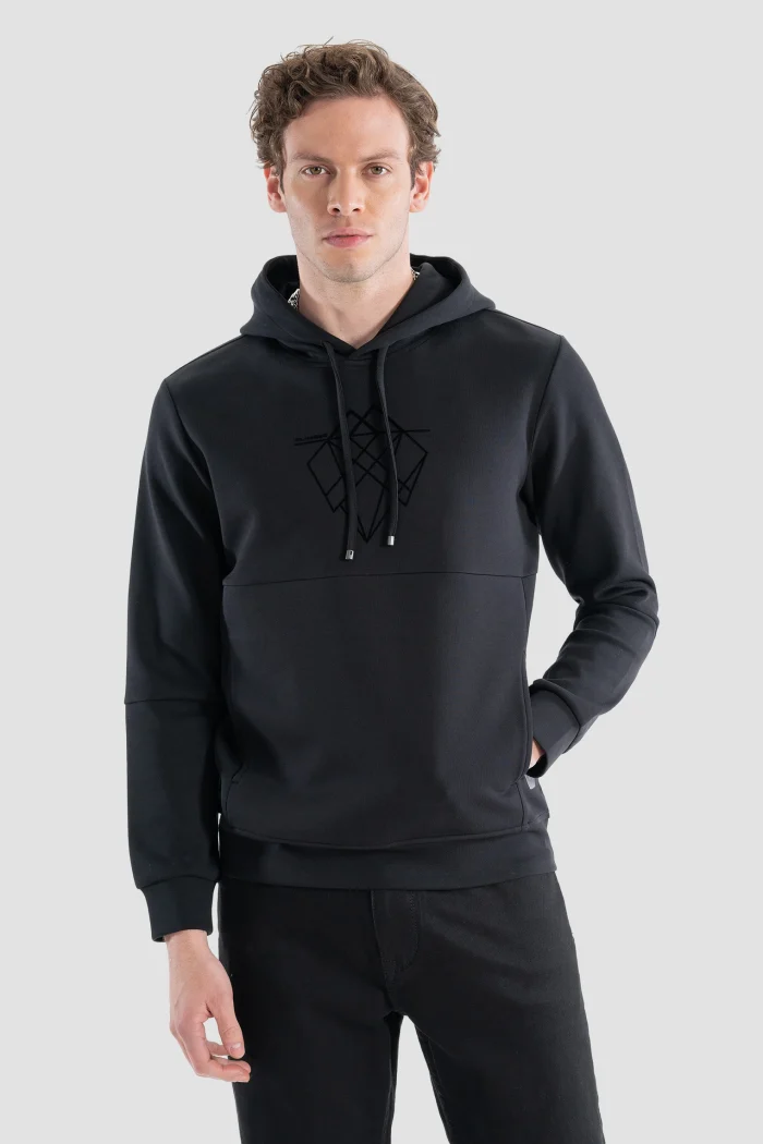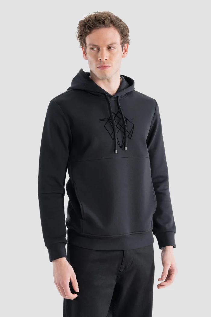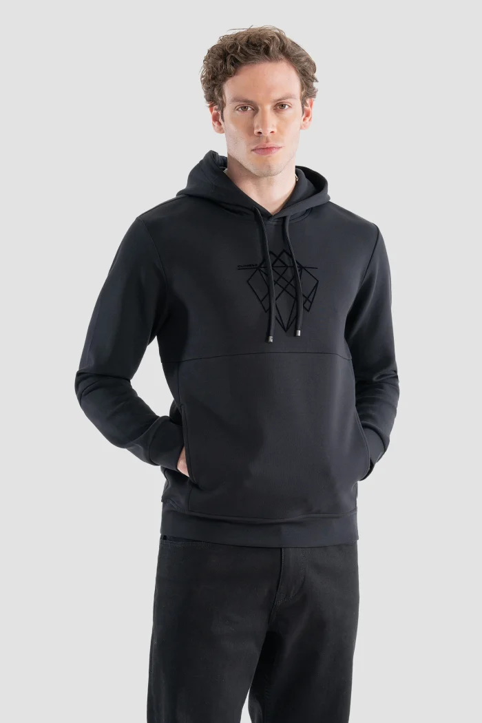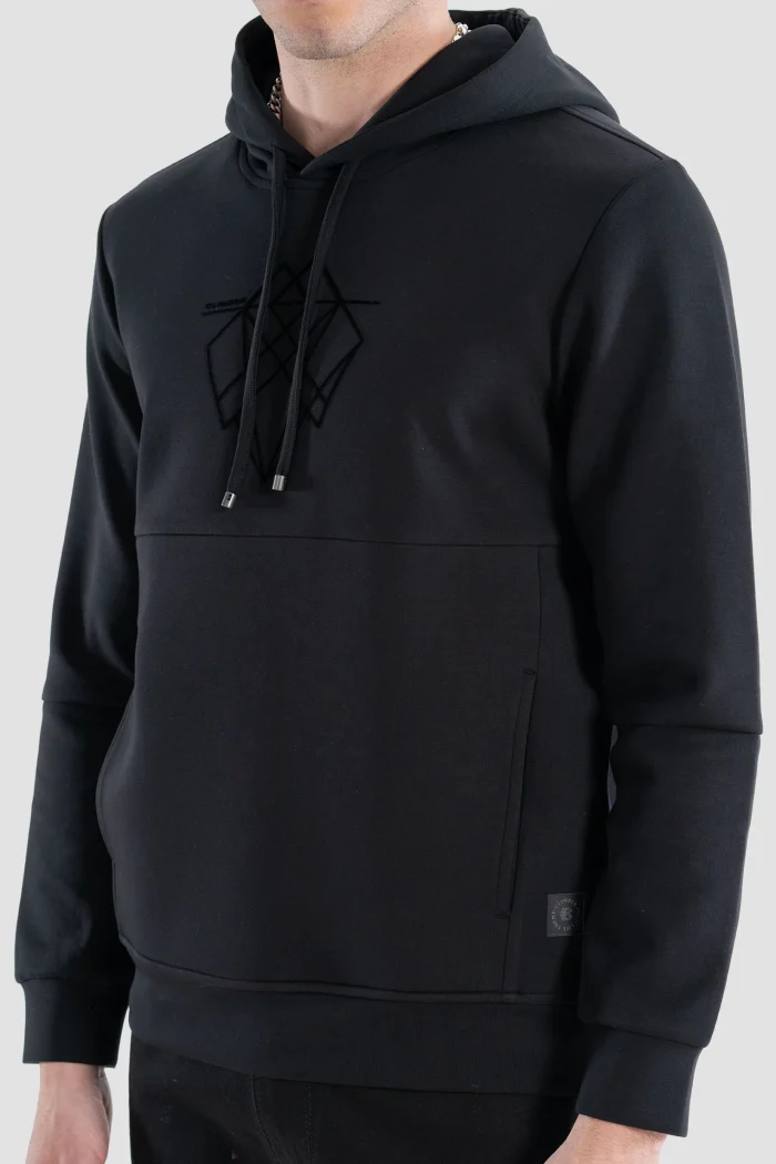 Эта черная толстовка с капюшоном, выполненная в простом и стильном стиле, будет незаменима в Ваших повседневных сочетаниях.nМинималистичный дизайн и деталь с геометрическим принтом спереди придают ей современный вид, а мягкая текстура обеспечивает комфорт в течение всего дня.nБлагодаря удобному крою и функциональному капюшону она идеально подходит как для занятий спортом, так и для повседневного использования.nВы можете создать стильный и комфортный стиль в любой обстановке, сочетая ее с джинсами или трениками.nЭта толстовка станет одним из любимых предметов Вашего гардероба благодаря своему комфорту и элегантному виду.