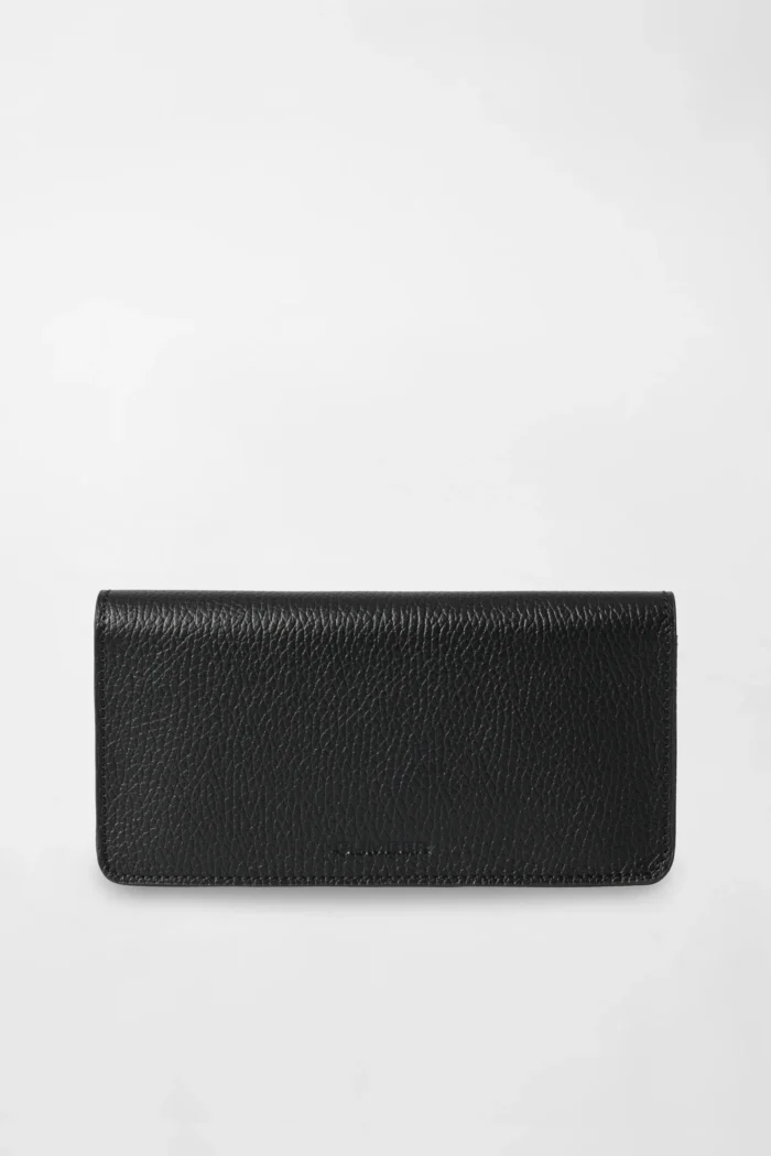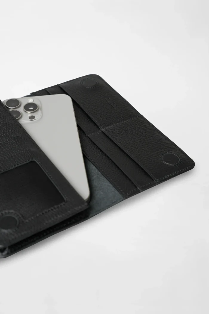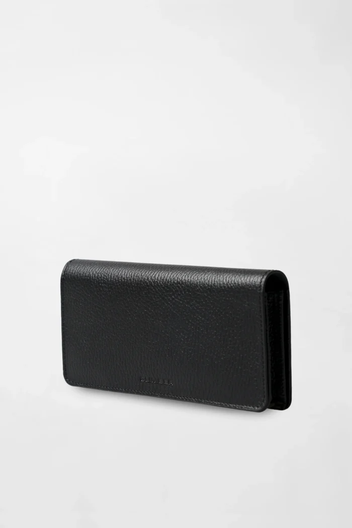 Черный кожаный кошелек с задним ручным ремешком