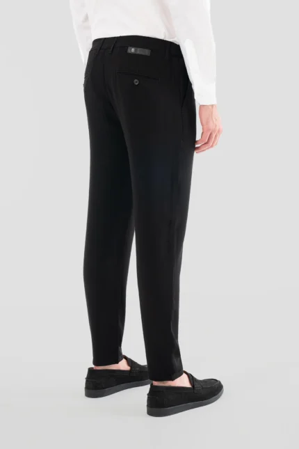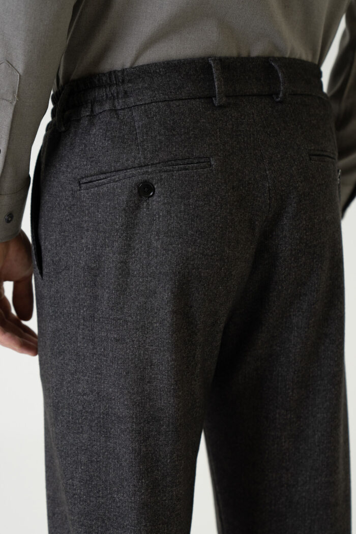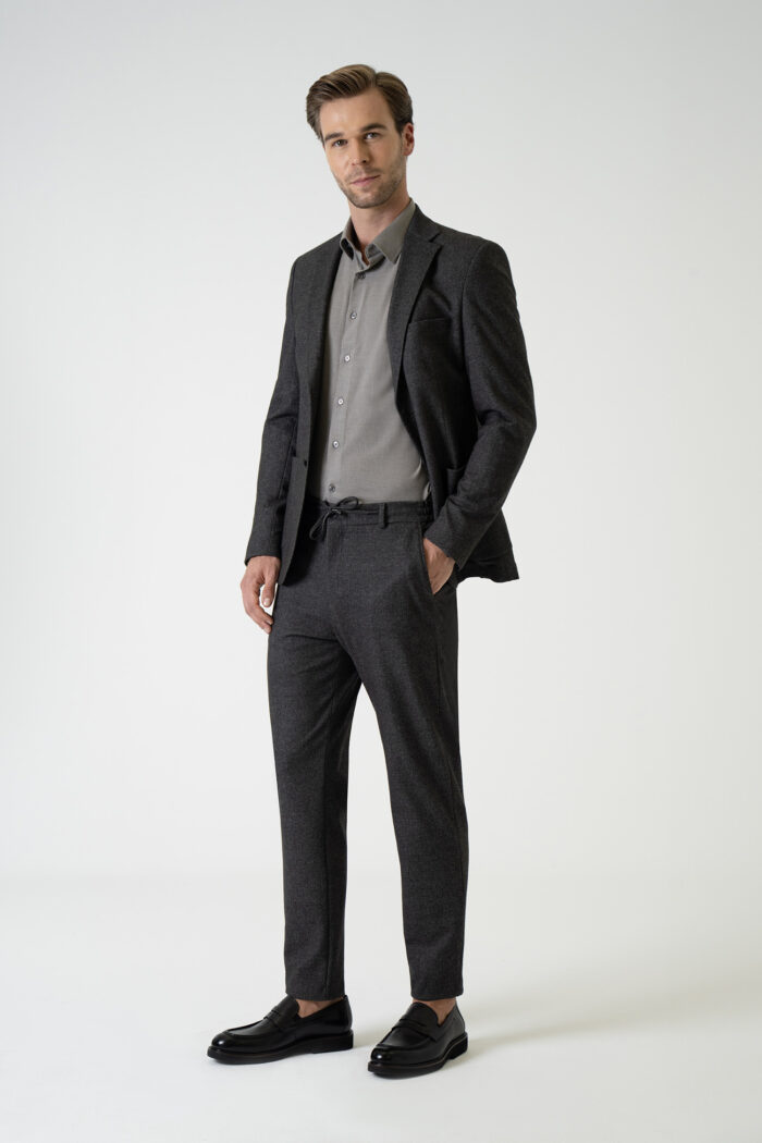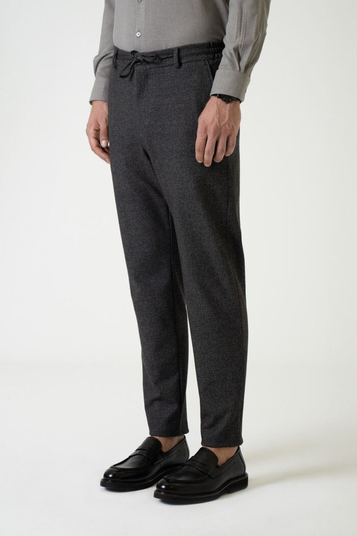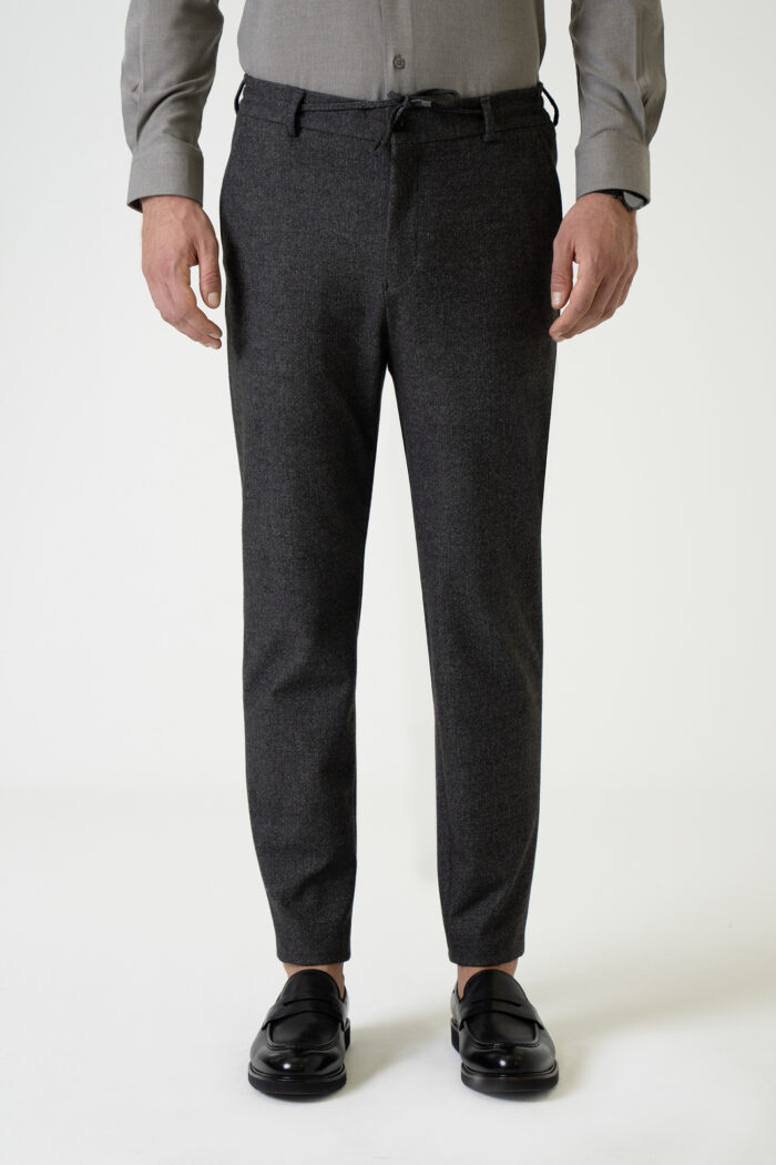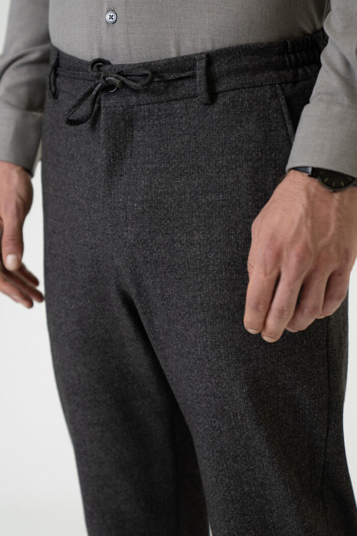 Standing out with their modern design, these dark grey trousers offer a refined silhouette with their relaxed cut. The finely textured fabric provides lightness and comfort, while the drawstring waist detail allows them to adapt to both classic and sporty combinations. A timeless piece that can be easily styled for various looks, whether in daily life or professional settings.