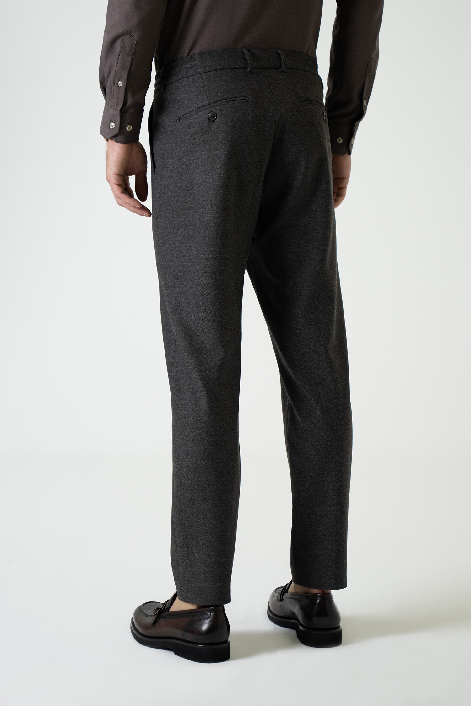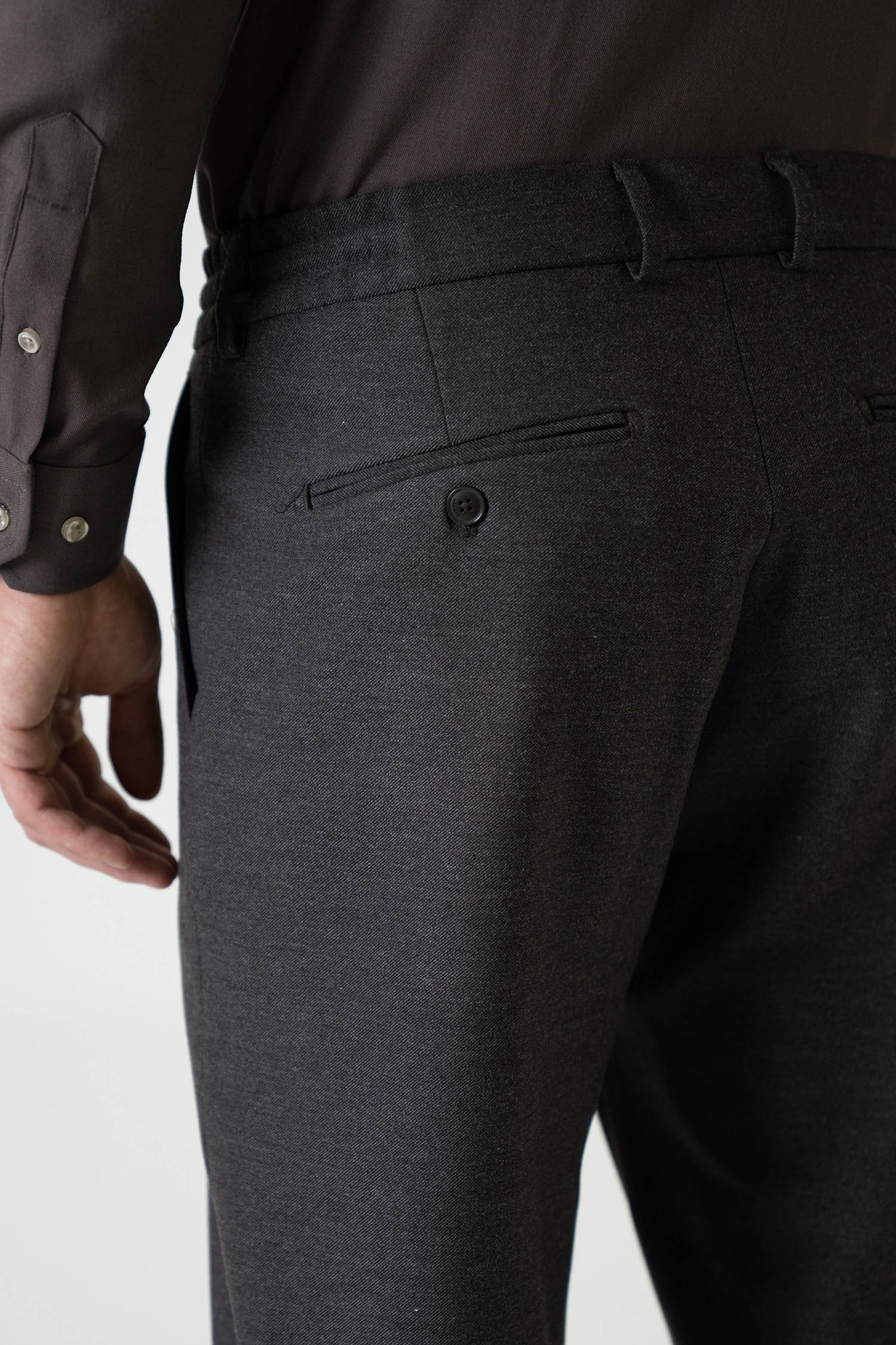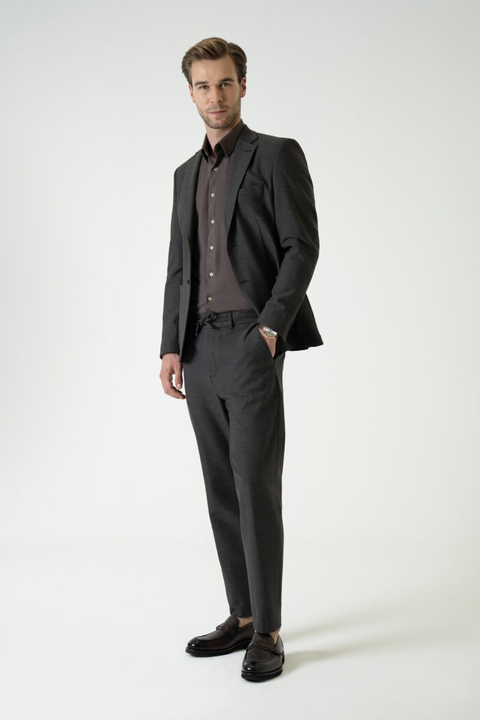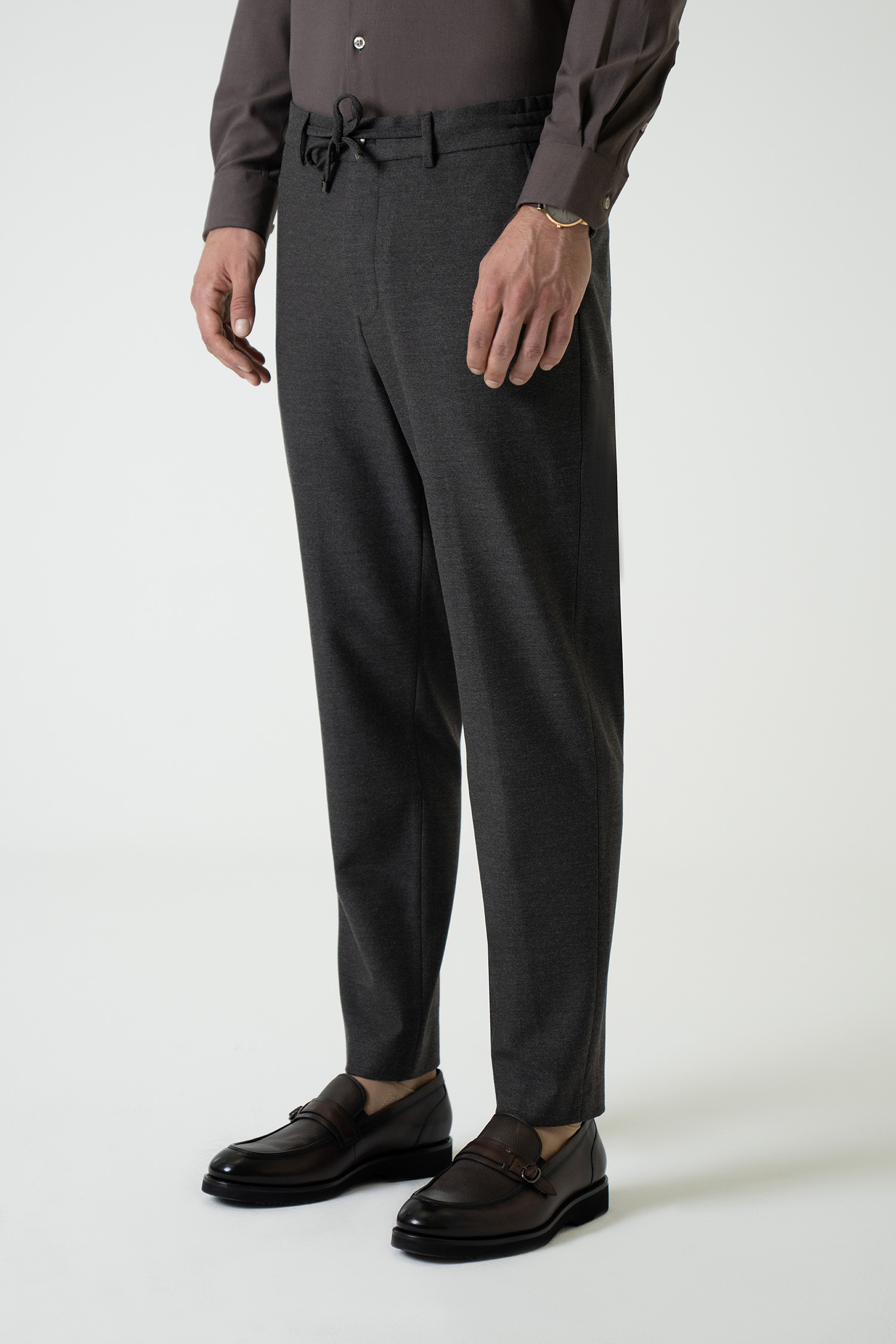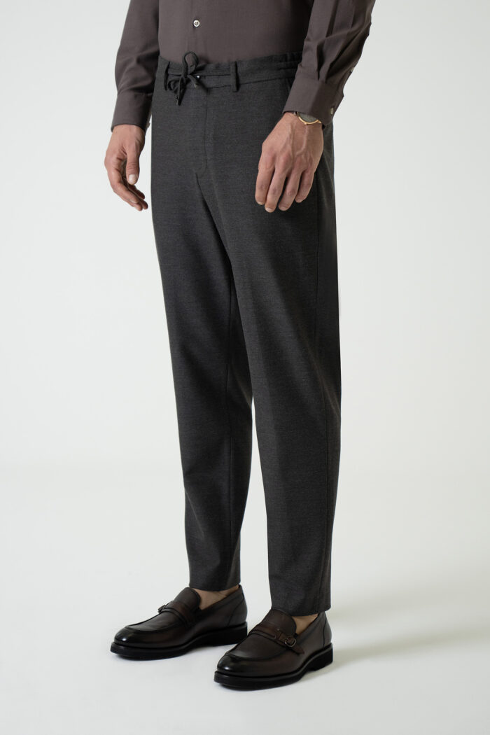 With their minimal design and modern cut, these anthracite trousers offer effortless elegance for both daily and office style. The flexible structure and drawstring waist detail combine comfort with sporty sophistication. Crafted from a soft-textured fabric, they ensure all-day ease while achieving a flawless harmony with jackets through their refined look.