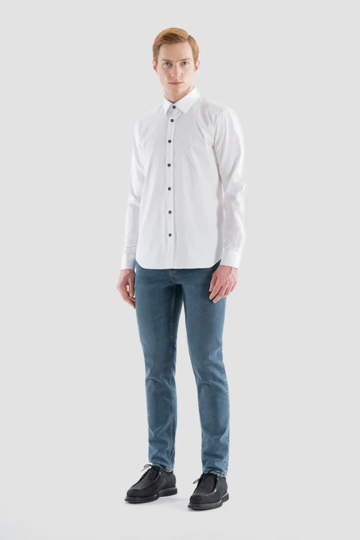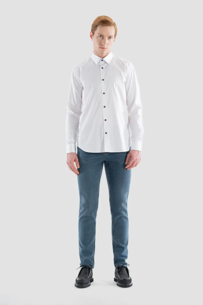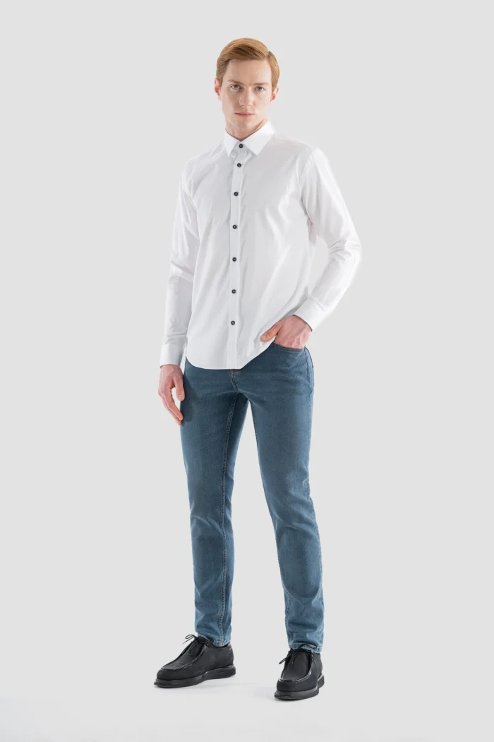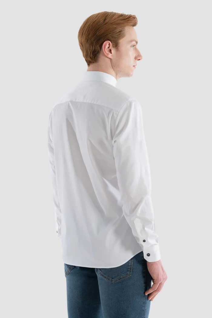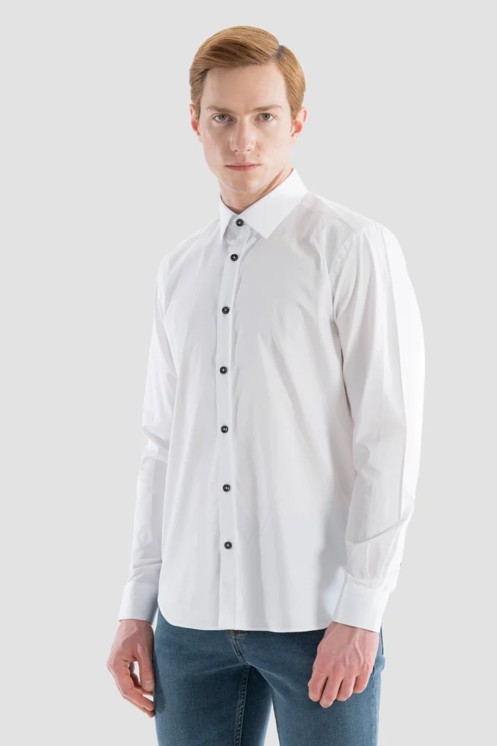 This classic white shirt is a timeless piece that every man should have in his wardrobe. It has a modern look with its cut, while black button details add elegance. This shirt, which is suitable for both business and casual elegance, offers comfort all day long thanks to its high-quality fabric. Whether you combine it with a suit or create a casual style with jeans, you will feel stylish and comfortable in any environment.