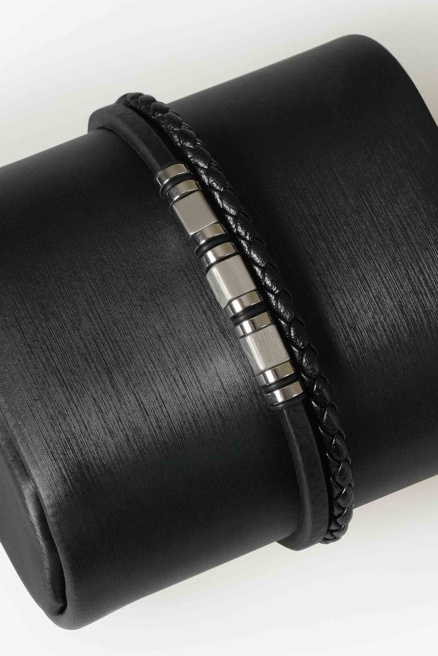 Featuring a modern and masculine aesthetic, this black double-layer bracelet combines genuine leather texture with a balanced mix of braided and smooth leather forms, creating a striking presence on the wrist. Merging elegance with style, the design effortlessly complements any look.