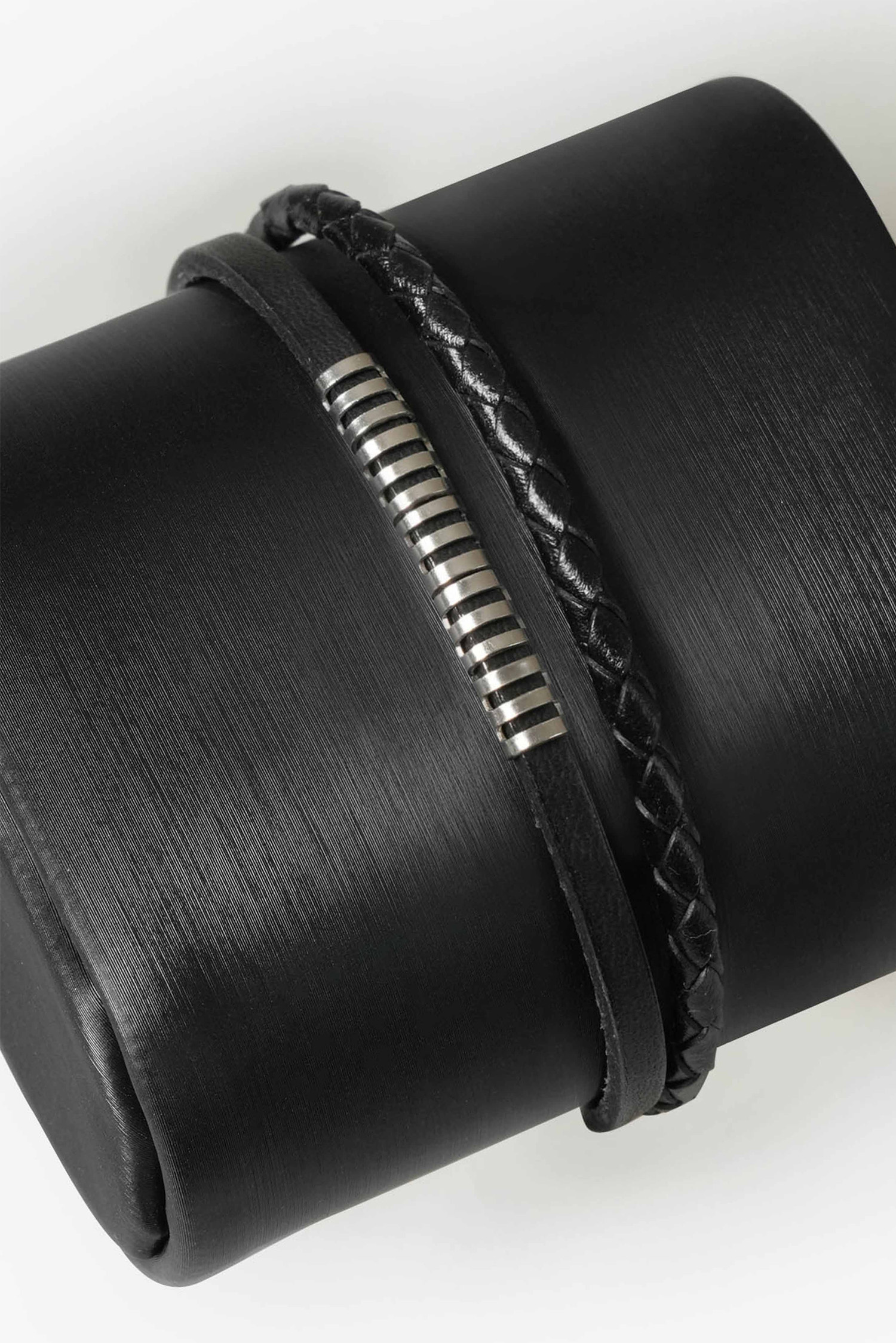 Showcasing a bold yet minimalist design, this black double-layer leather bracelet combines braided and smooth leather forms for a modern look. Enhanced with stainless-steel ring details, it adds a sophisticated touch to simple styles.