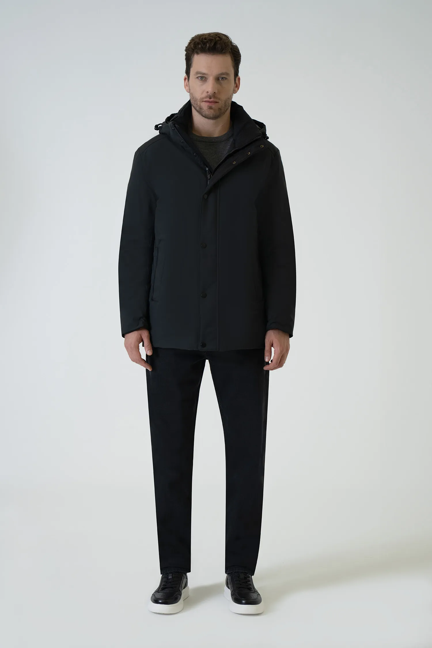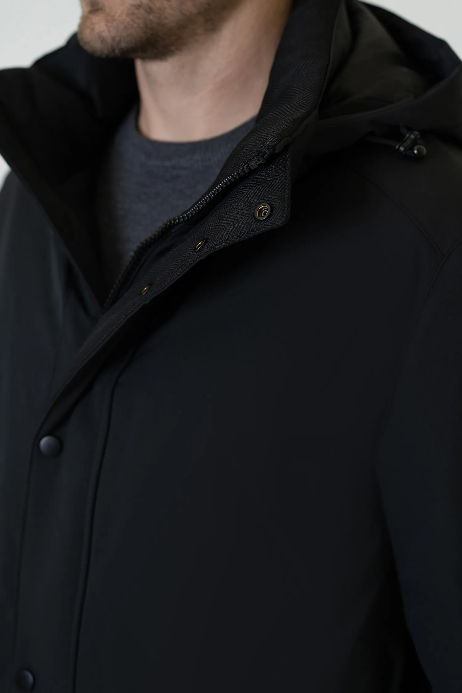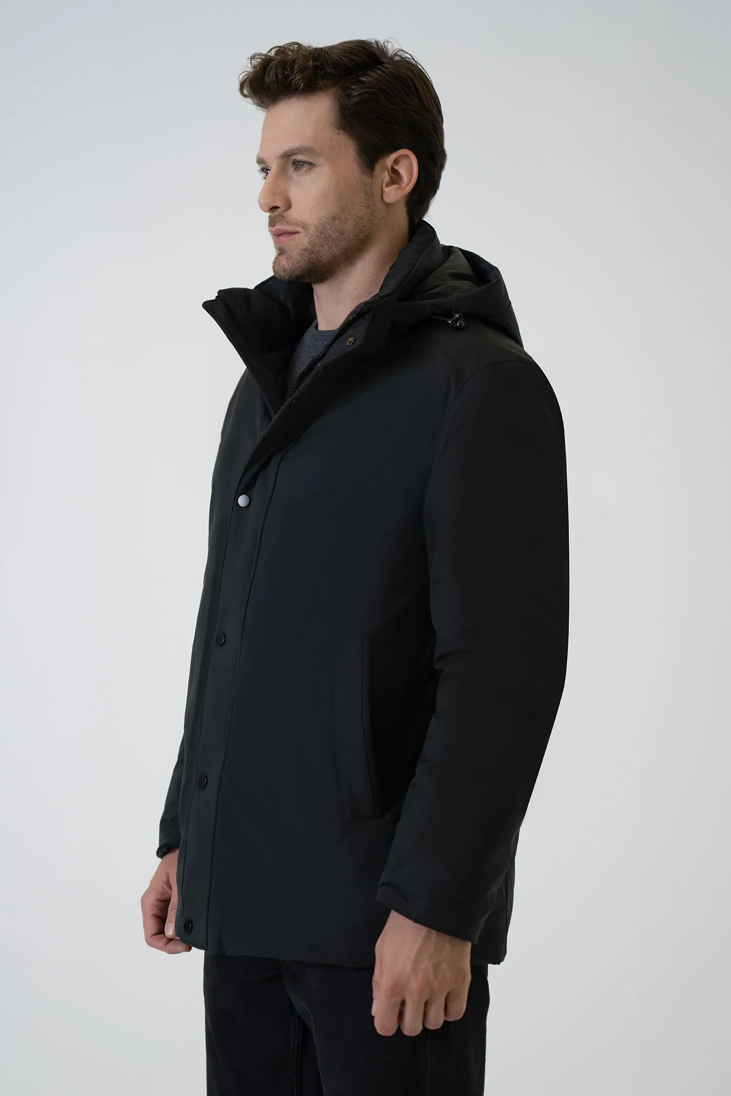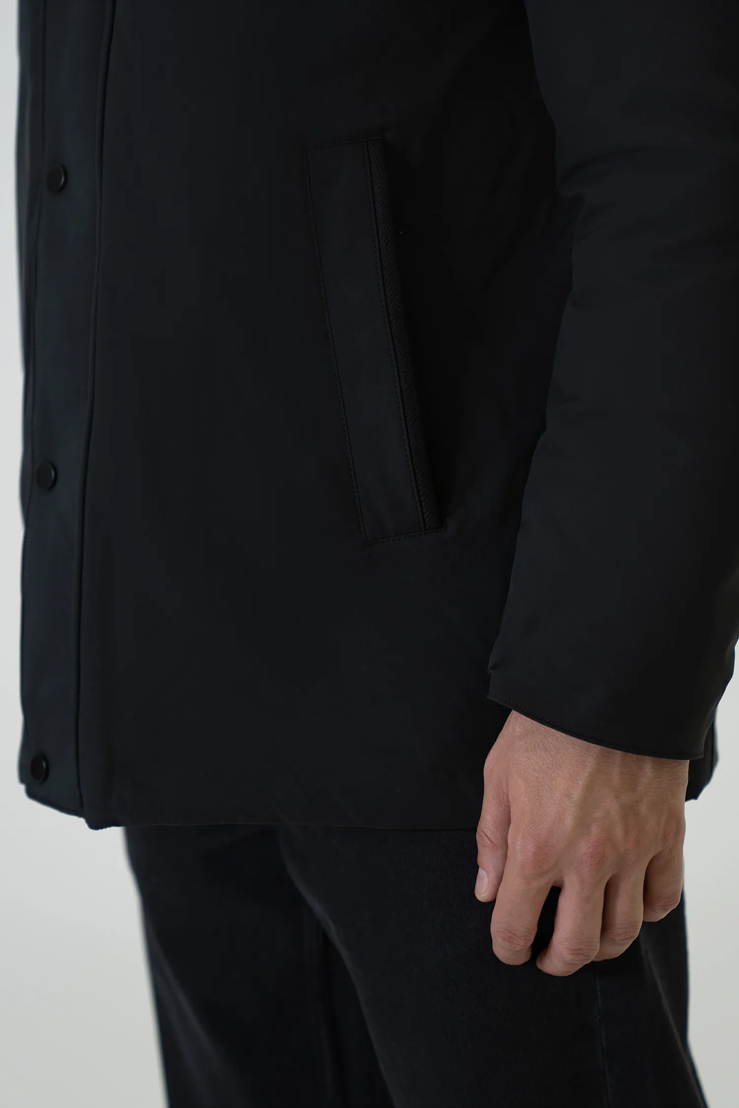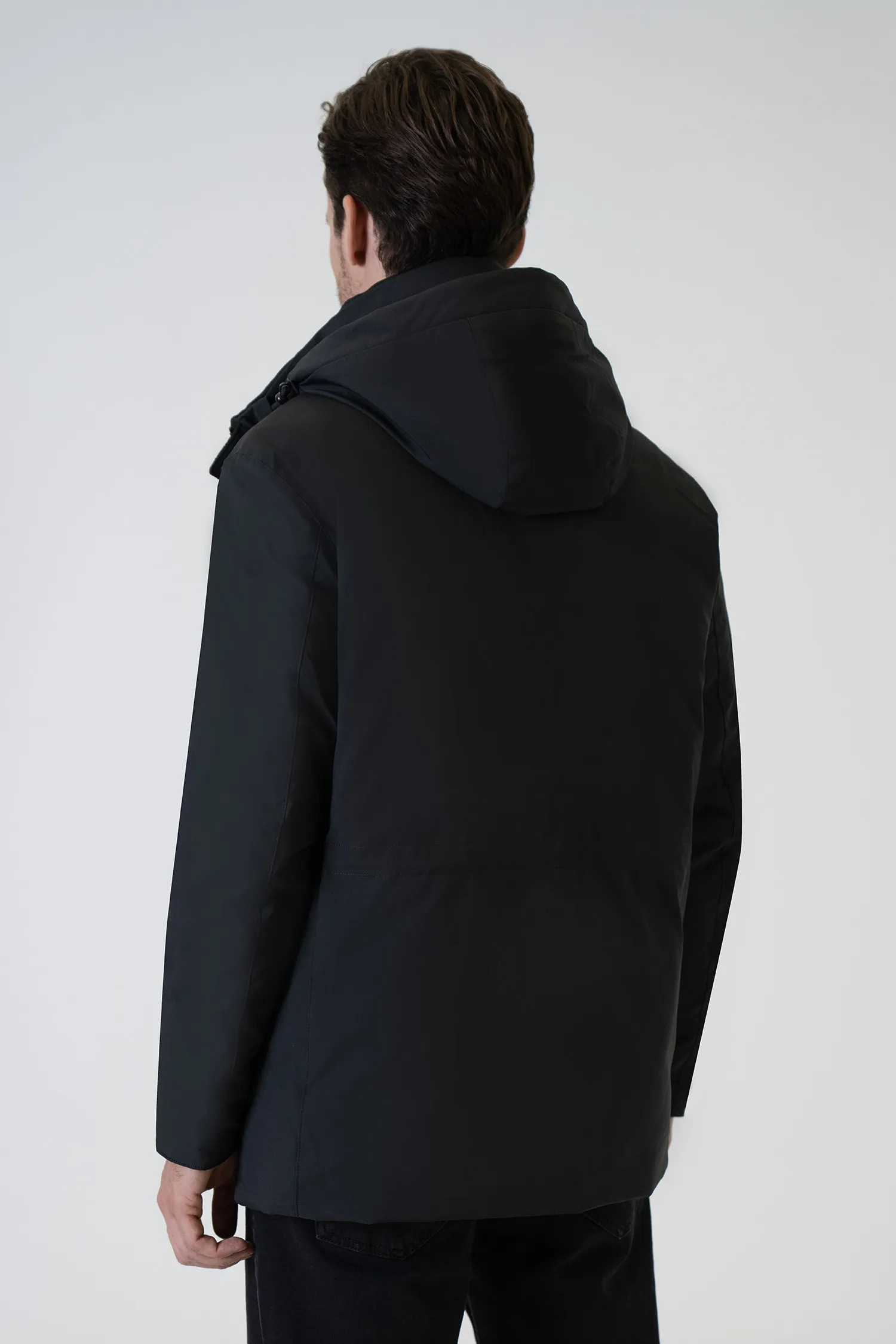 Эта куртка черного цвета с пуховым наполнителем, обеспечивающим превосходное тепло, сочетает в себе высокие эксплуатационные характеристики и изысканный силуэт. Водоотталкивающая поверхность, капюшон и современный крой гарантируют надежное и комфортное ношение в холодную погоду.