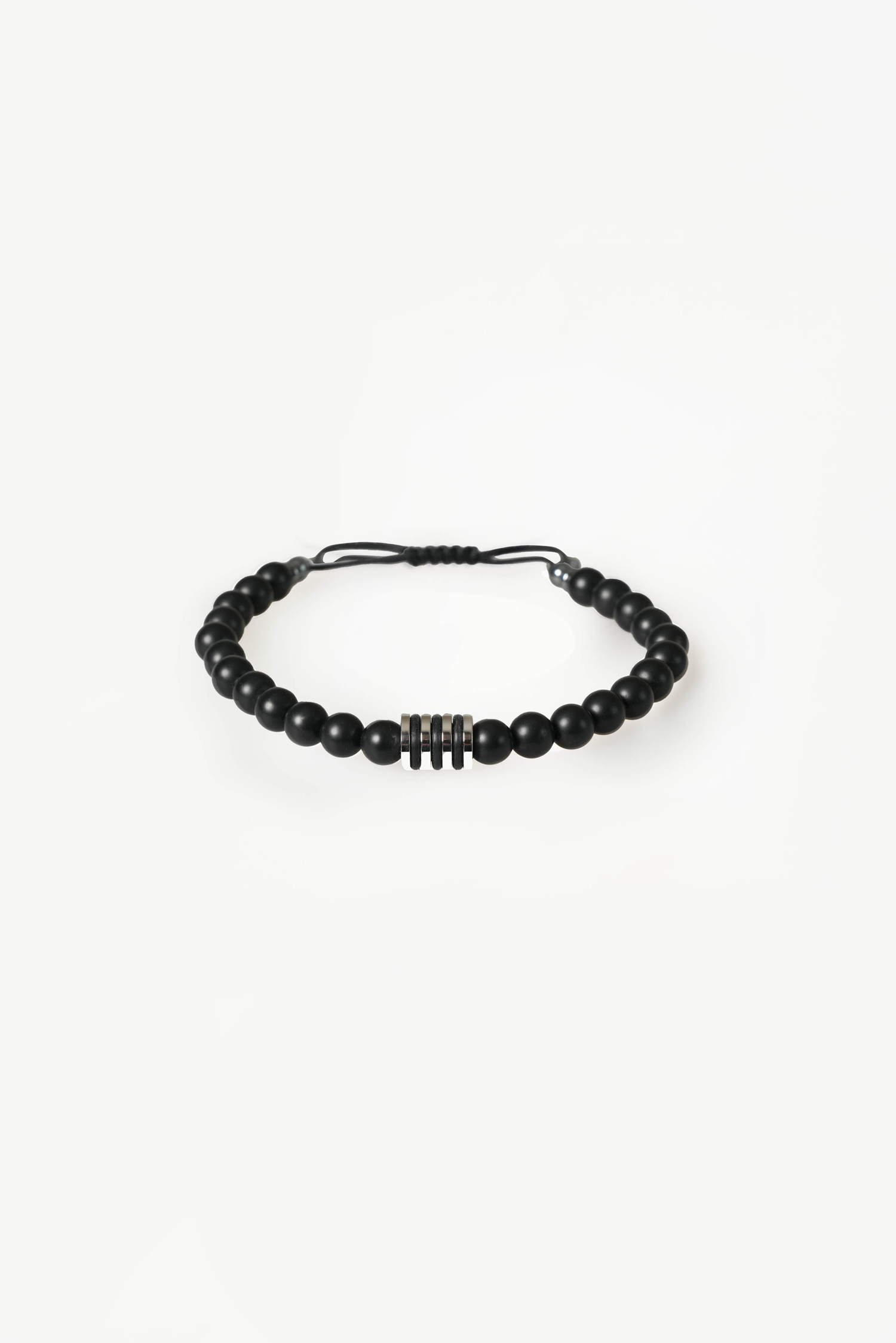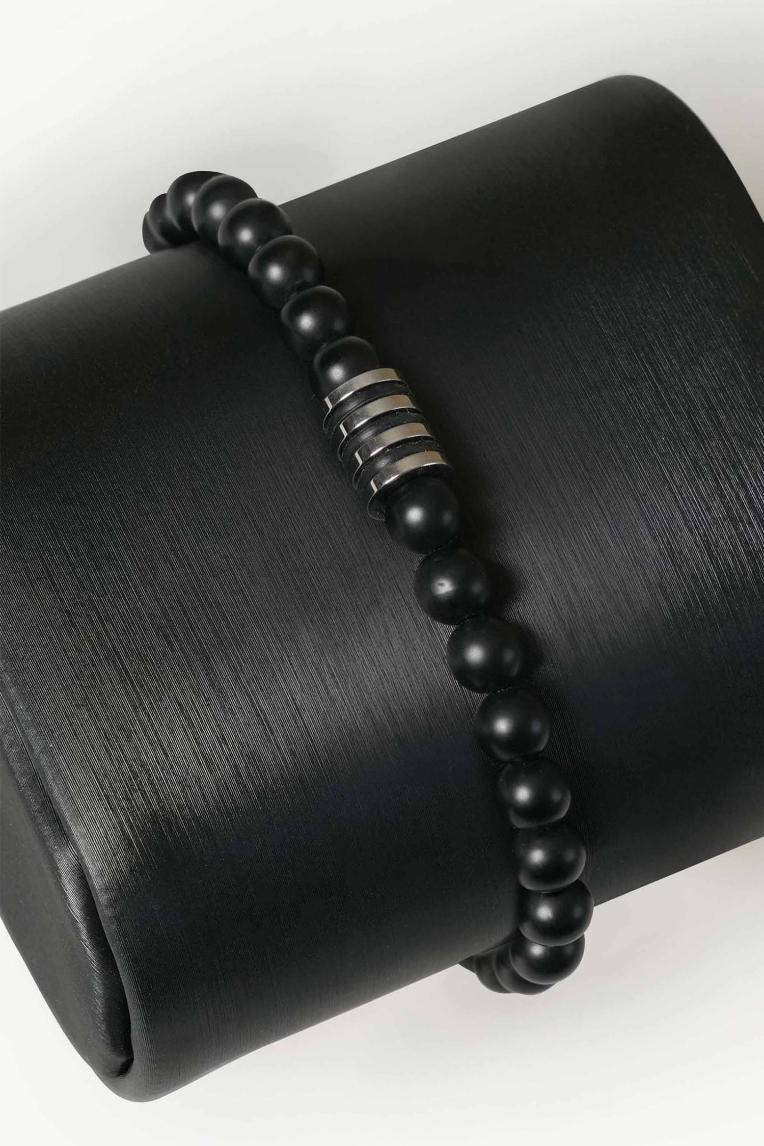 A modern interpretation of understated elegance. Designed with black natural stones, this bracelet features stainless-steel rings at the center that create a strong contrast. Its elastic cord structure allows it to fit comfortably on the wrist, providing all-day ease. Highlighted by minimal details, it serves as a refined complement to modern men’s style.