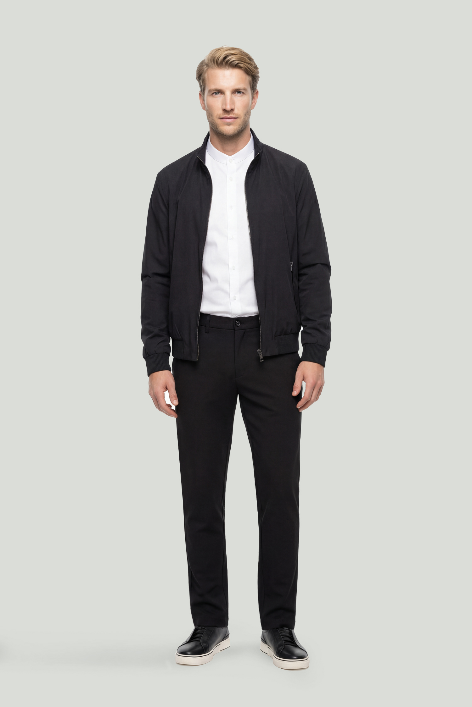 Featuring clean lines and a modern silhouette, this black bomber jacket is a strong complement to refined style. Its lightweight construction and fluid form provide all-day comfort, while its timeless design adapts effortlessly to any look.