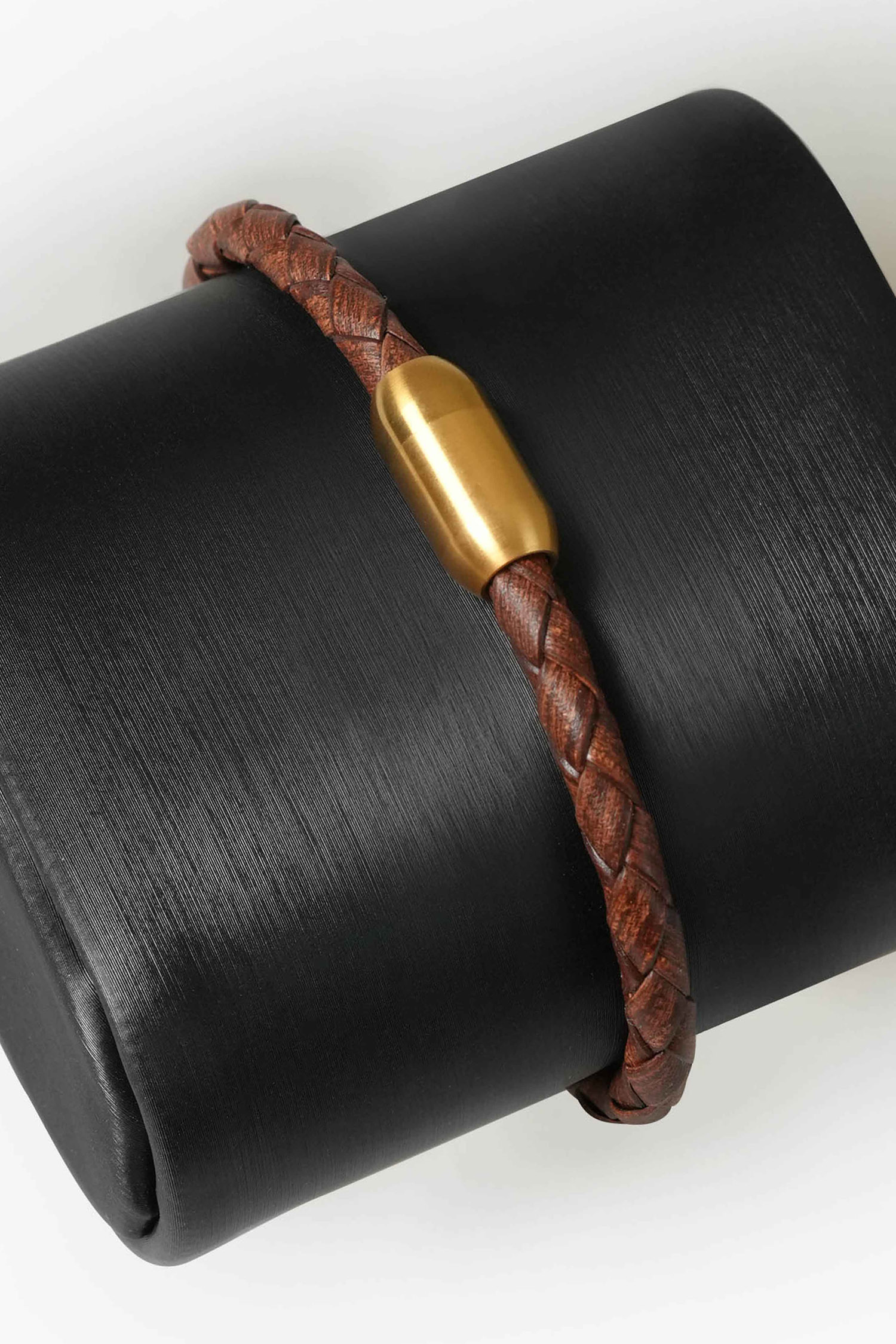 With its elegant and simple style, this brown braided leather bracelet complements modern men’s fashion. Crafted from genuine leather for durability, it features a gold-toned magnetic stainless-steel clasp that adds a sophisticated touch to the design.