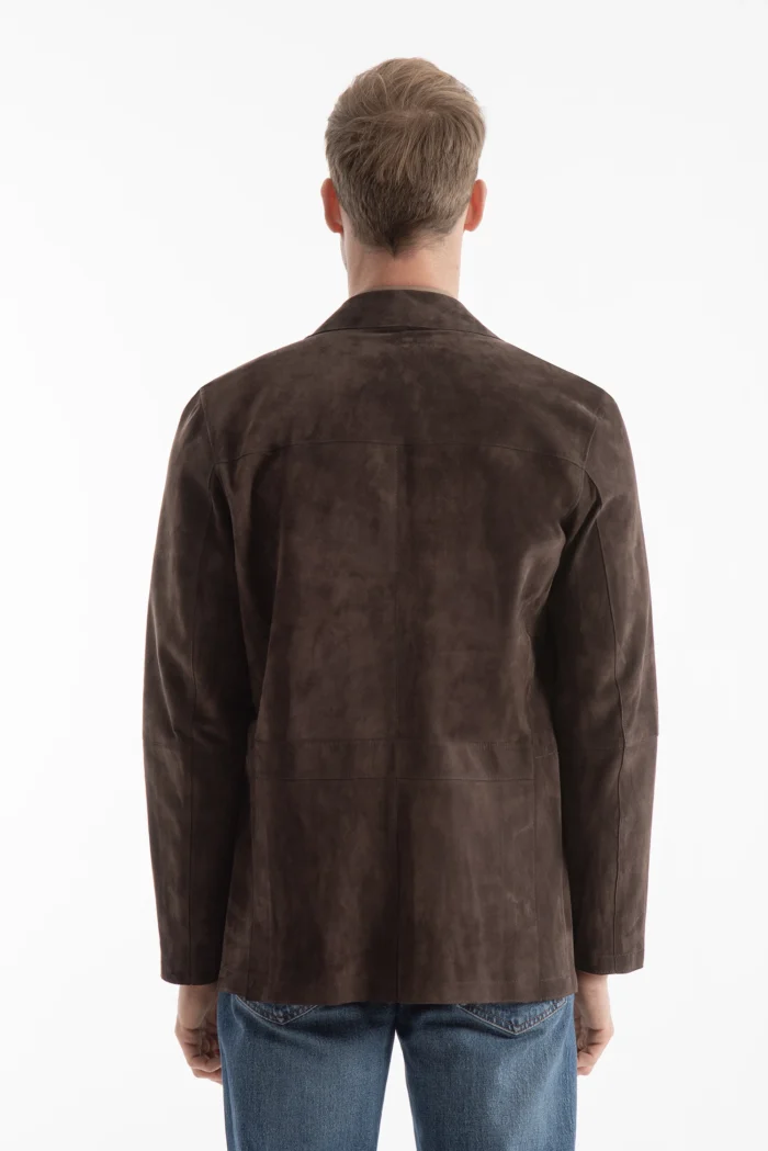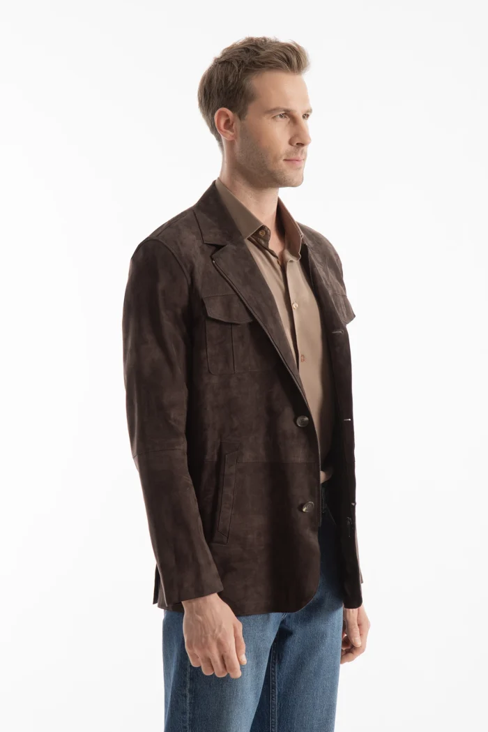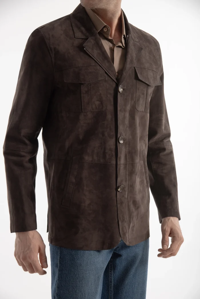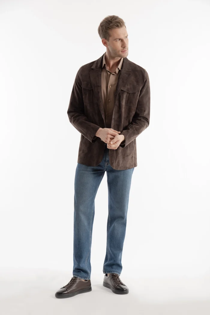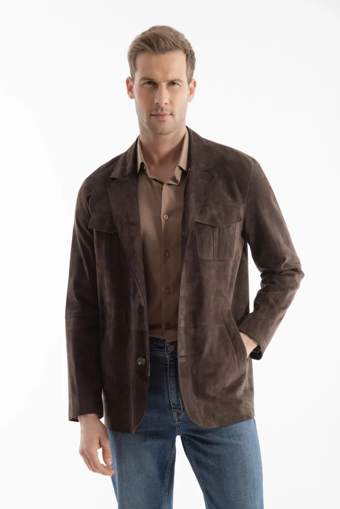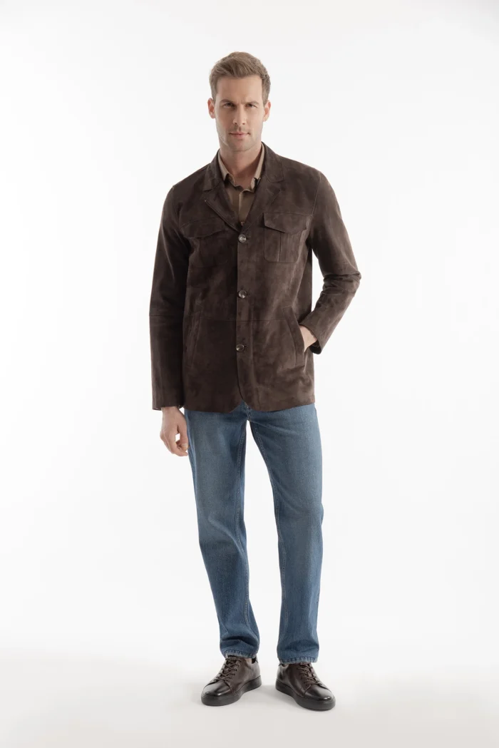 Designed with a modern interpretation of classic style, this brown suede safari jacket is a candidate to be the first choice of sophisticated men. Its soft-textured real suede surface, combined with its elegant stance, becomes one of the indispensable outerwear pieces of the season. Its functional design with four pockets and natural texture adapt to both city life and weekend chic.