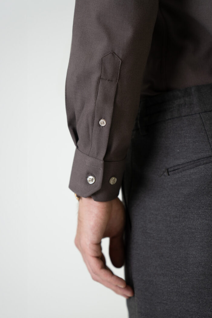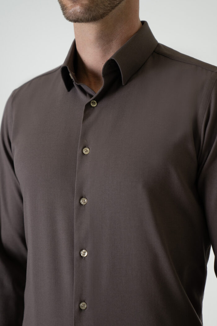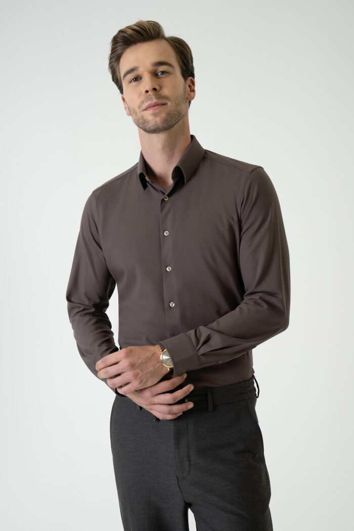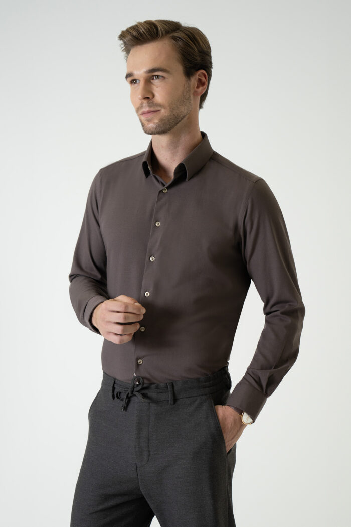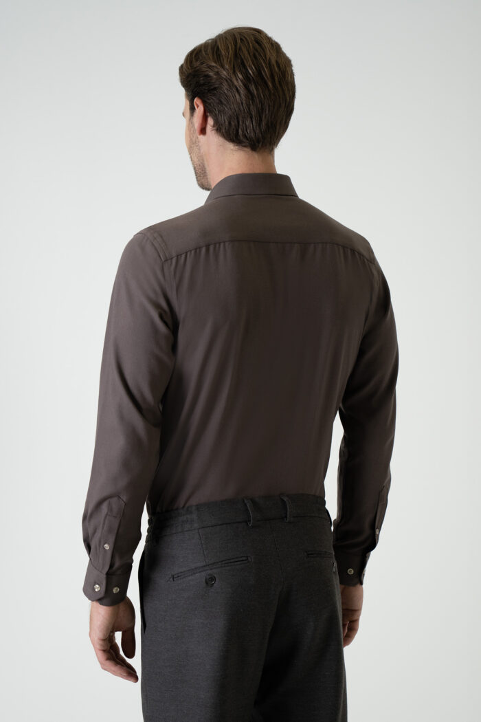 With its modern cut and timeless color, this brown shirt brings effortless elegance to your everyday style. The lightweight, breathable fabric ensures all-day comfort, while the slim fit cut delivers a contemporary silhouette. Featuring button details and a classic collar design, it provides a refined look suitable for both business wear and casual outfits.