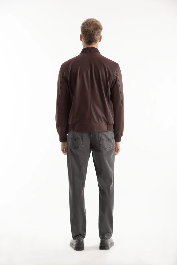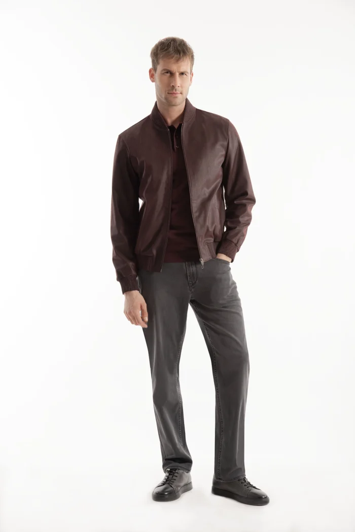 This burgundy bomber jacket, where classic cut meets modern stance, is a candidate to be an indispensable piece in the urban man’s wardrobe. It adds elegance to both daytime and evening style with its soft texture and striking color.