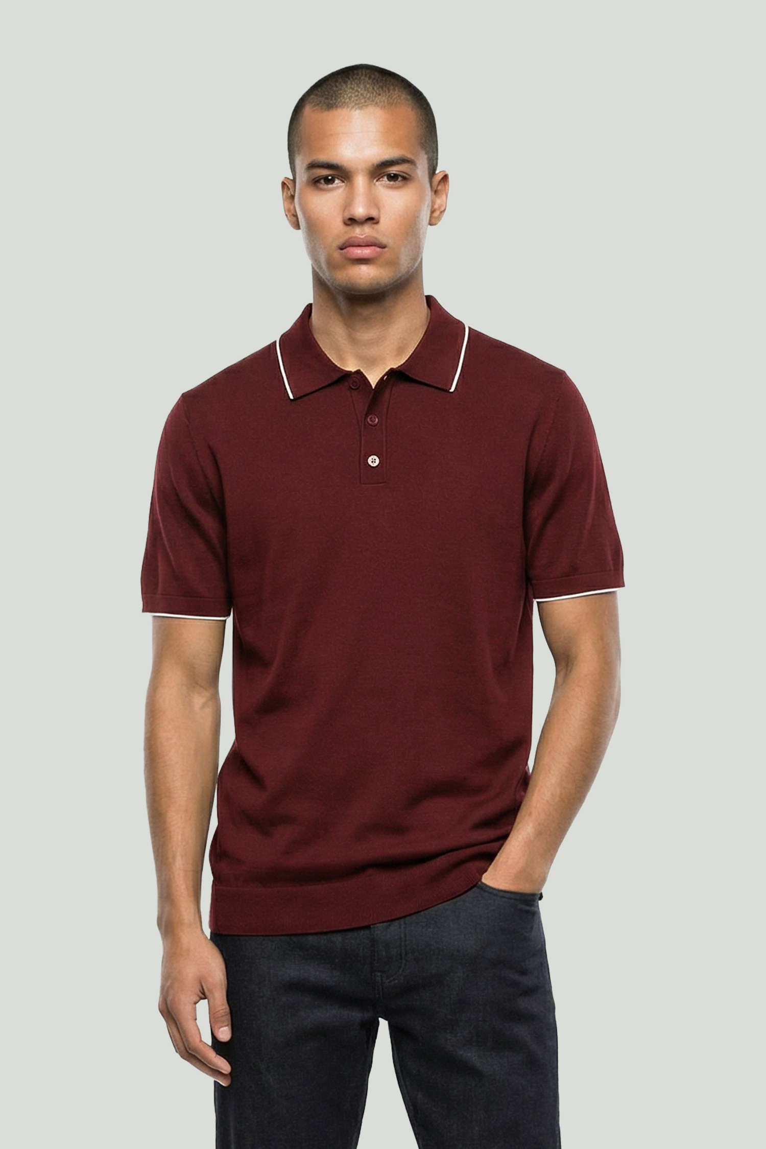 Standing out with its refined texture and fluid structure, this burgundy polo T-shirt offers a modern and balanced style. The rayon-blend fabric provides a soft feel and all-day comfort, while subtle details complete its understated elegance.
