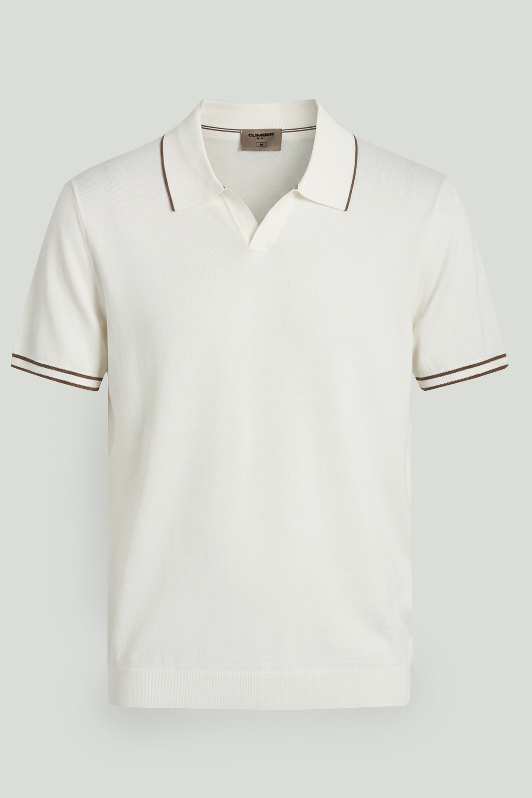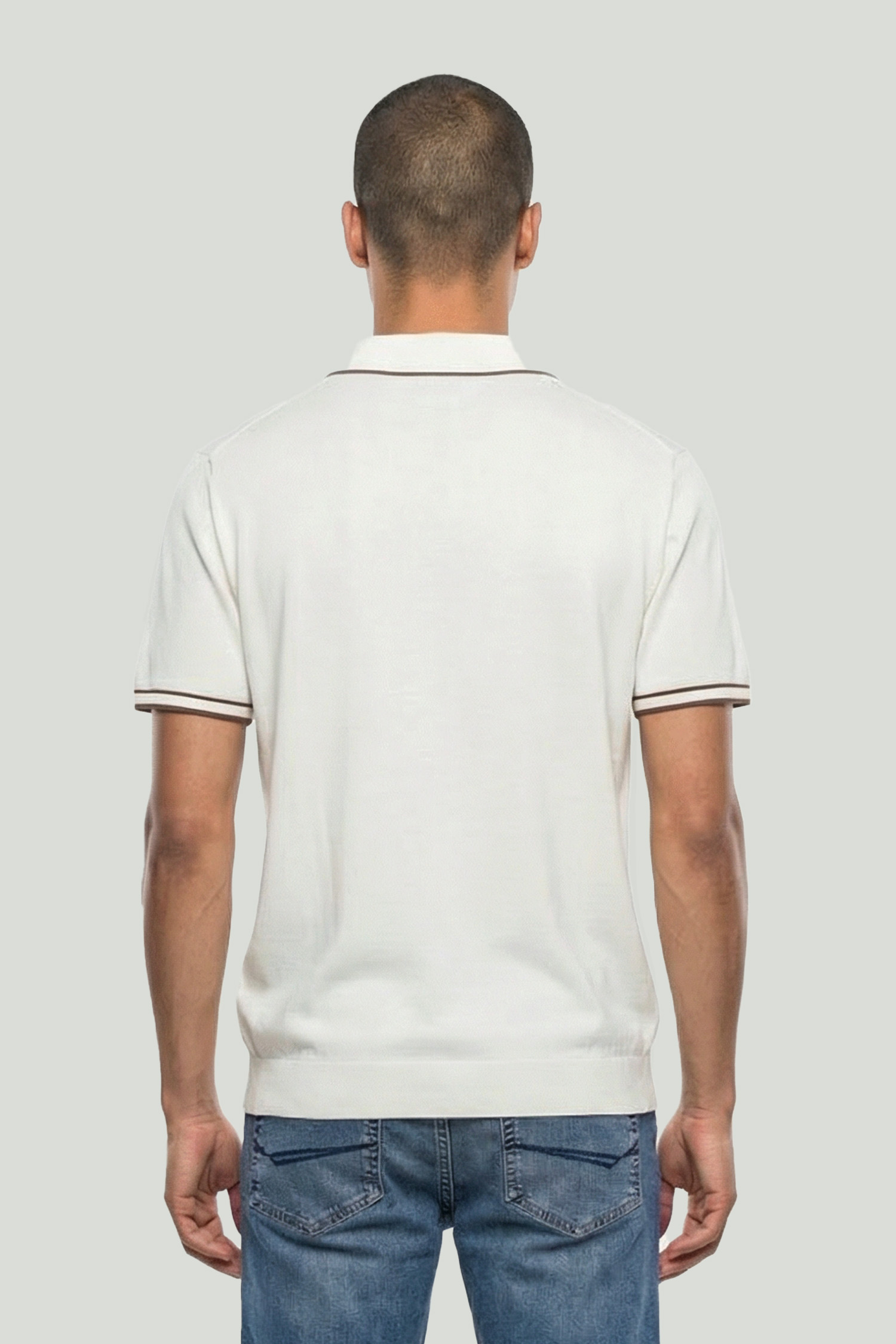 Standing out with its soft texture and refined appearance, this ecru knit polo offers a modern and clean style. The rayon-blend structure provides a lightweight and fluid feel, while subtle contrast details add an elegant touch.